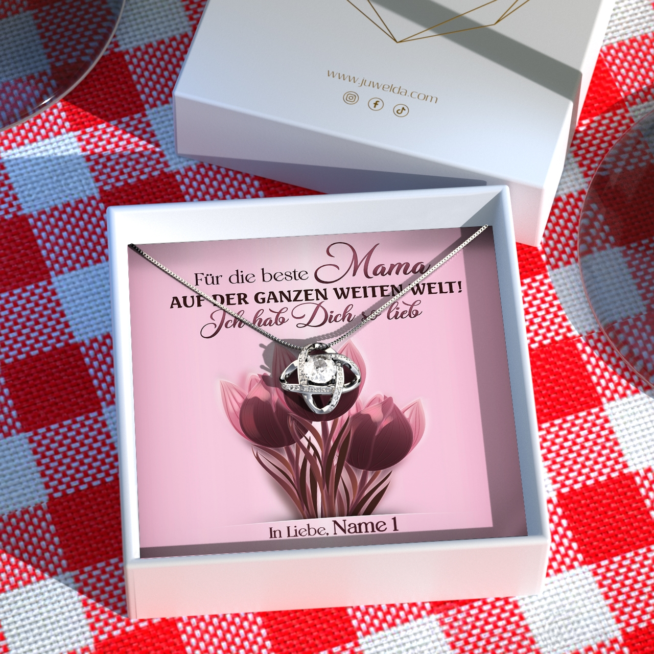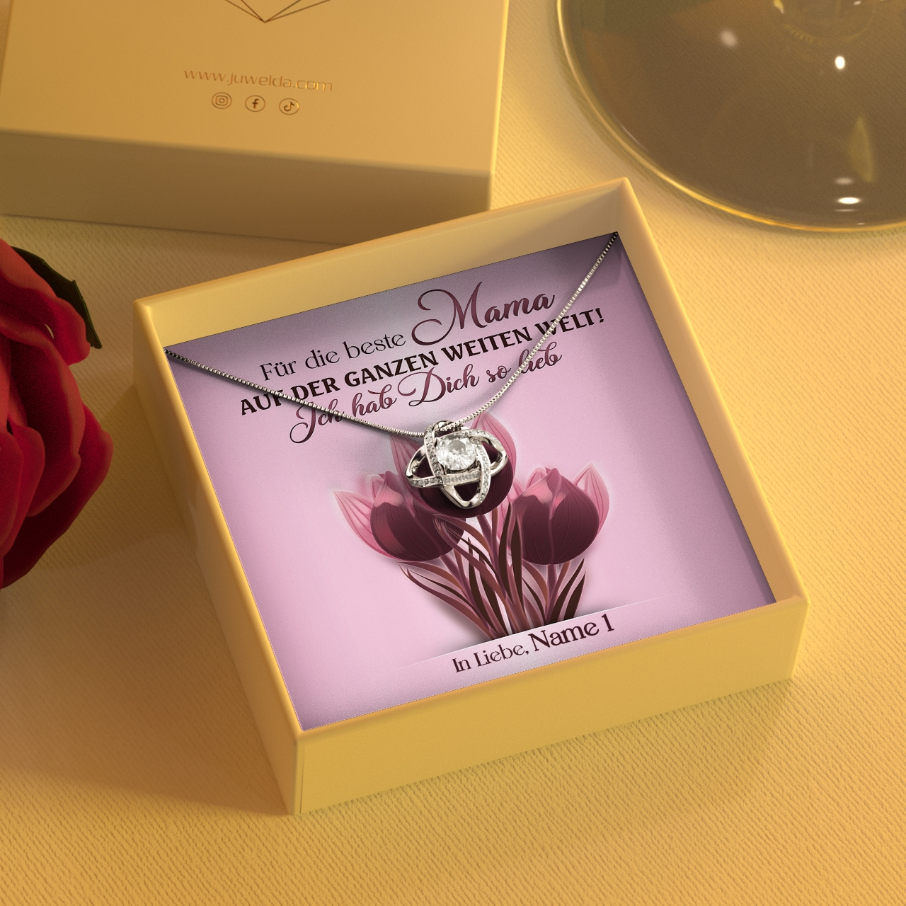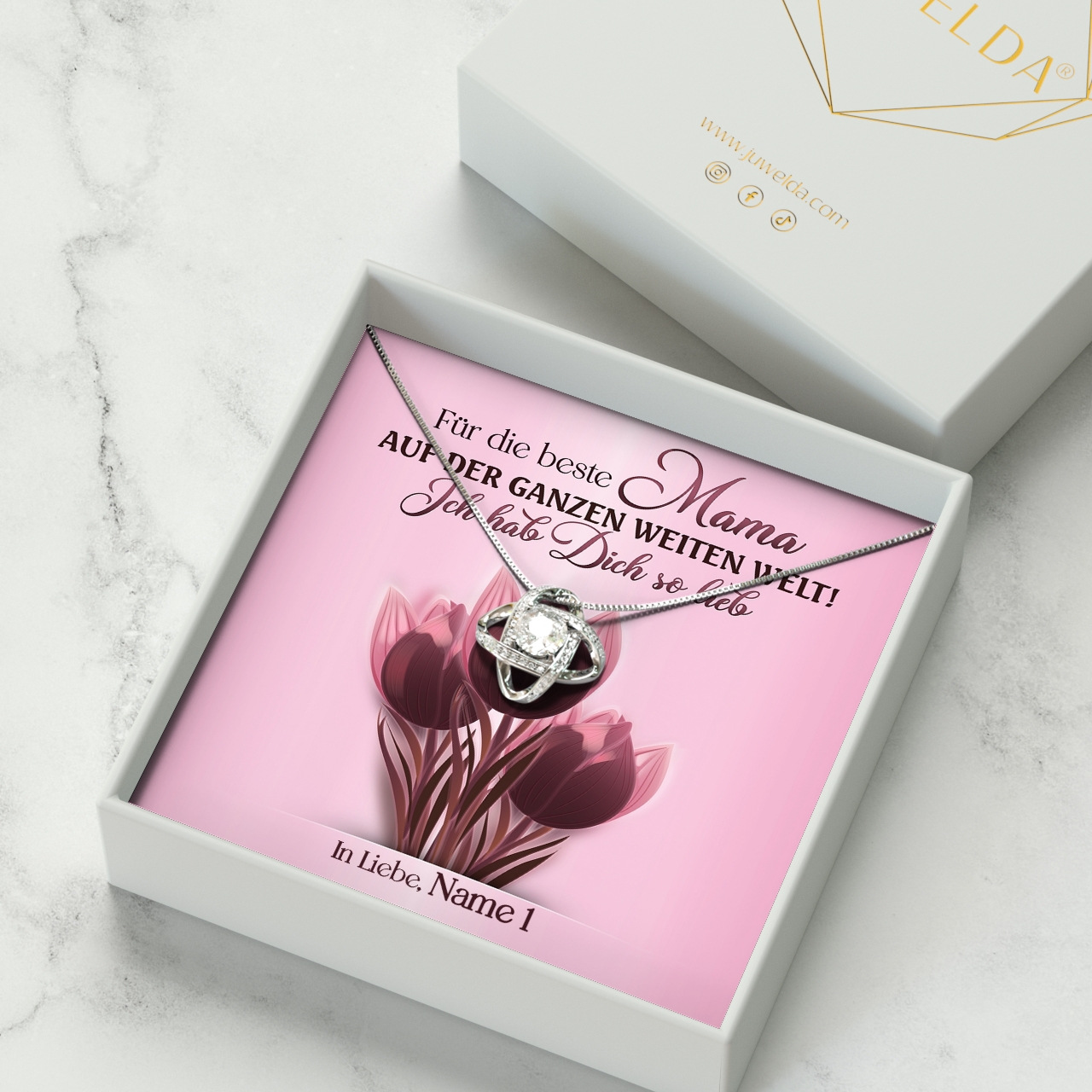 Deine Mutter ist durch ihre Liebe einer der wichtigsten Menschen in Deinem Leben. Jetzt ist es an der Zeit, einfach mal “Danke” zu sagen. Danke für jede Minute ihres Lebens, in der sie sich um Dich gekümmert hat und danke für jeden Moment, den Du mit ihr bisher verbringen konntest. Und wie könntest Du Dich liebevoller bedanken als mit einem einzigartigen Set aus personalisierter Grußkarte, wunderschönem Schmuckstück und einer edlen Schmuckbox?
