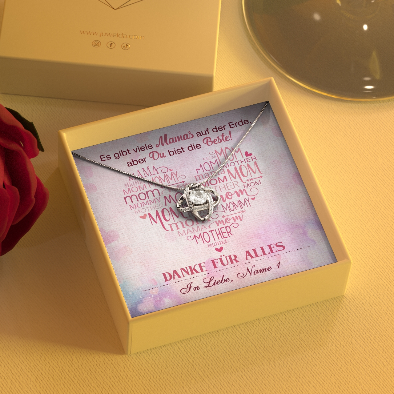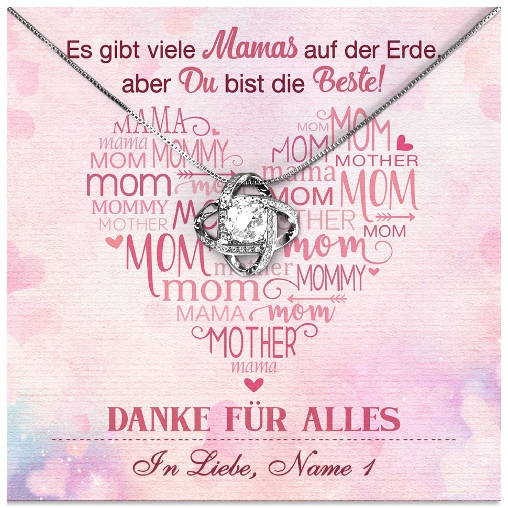 Deine Mama mag es bunt und verspielt? Dann ist die „Danke für Alles“ Grußkarte genau passend für das Muttertagsgeschenk. Sie ist in leuchtendem Pink mit vielen Herzen gestaltet. Auf die personalisierbare Karte kannst Du Deinen Namen aufdrucken lassen, um ein individuelles Geschenk zu überreichen. Deine Mama wird bestimmt sprachlos sein. Wähle ein tolles Schmuckstück aus unserer Kollektion dazu und schon hast Du ein Präsent, das persönlicher und individueller nicht sein könnte.