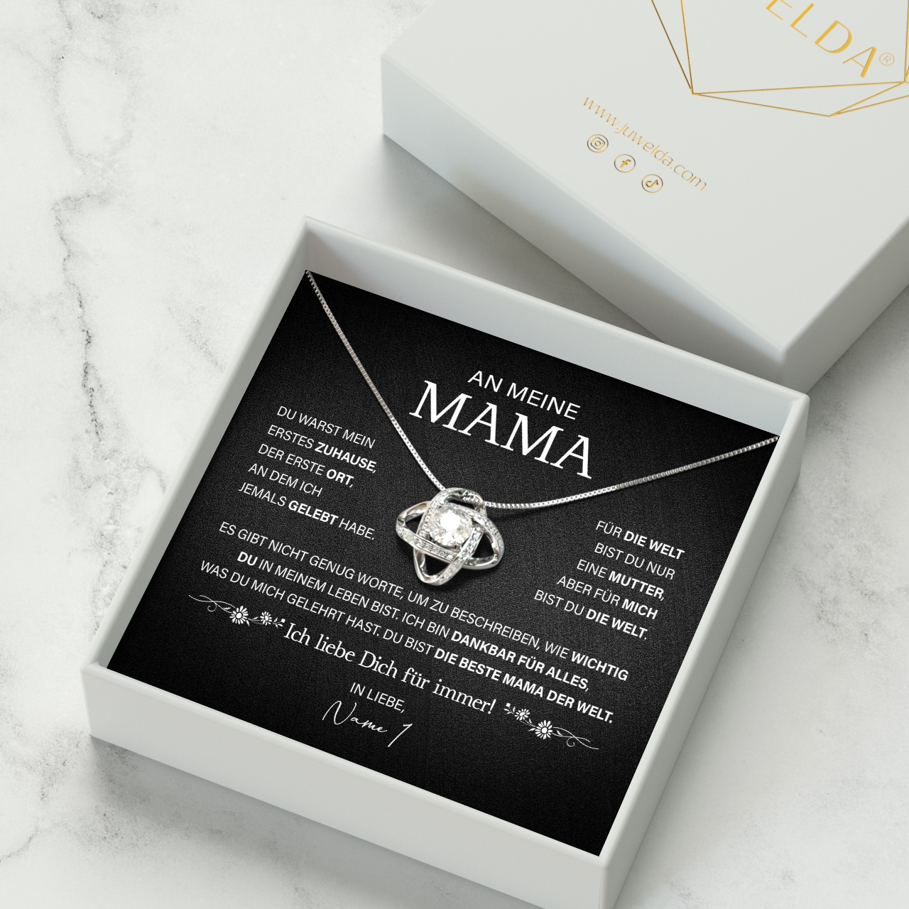 In 2-3 Werktagen erhältst Du Dein persönliches Geschenk. In unserer Schmuckmanufaktur verpacken wir Deine Halskette und Karte in einer hochwertigen Schmuckbox aus Kunstleder mit Samt-Innenbezug. Damit Du das Geschenk sofort verschenken kannst, legen wir alles liebevoll in eine schöne Geschenktasche. Mit diesem einzigartigen Geschenk wirst Du Deiner Mama zeigen, wie wichtig sie Dir ist.