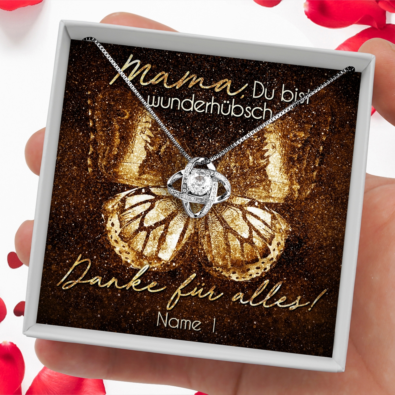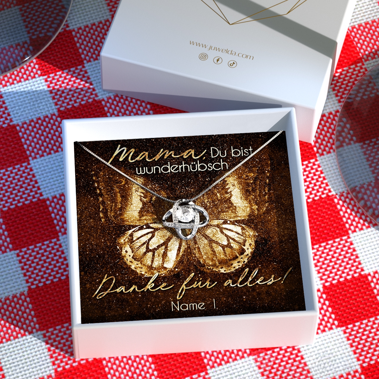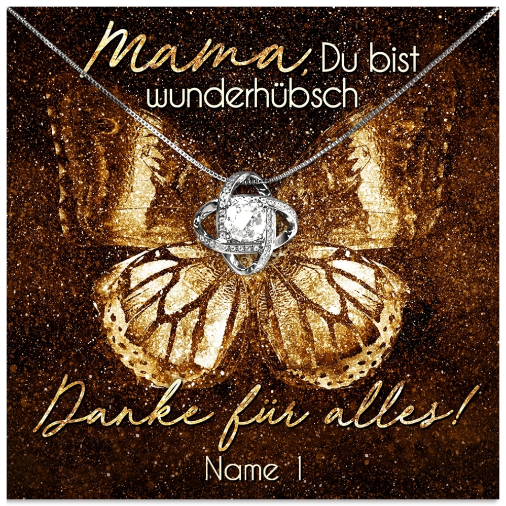 Die Liebe Deiner Mutter ist so wunderschön wie ein leuchtender Schmetterling? Finde in unserem Schmucksortiment ein Juwel, das sie beglücken wird und überreiche es mit dieser personalisierbaren Grußkarte. Der hübsche Schmetterling ist von goldenem Glitzer umgeben und die schöne Schrift ist ebenfalls in Gold gehalten. Mit wenigen Klicks ist das Motiv mit einem oder auch mehreren Namen personalisiert.