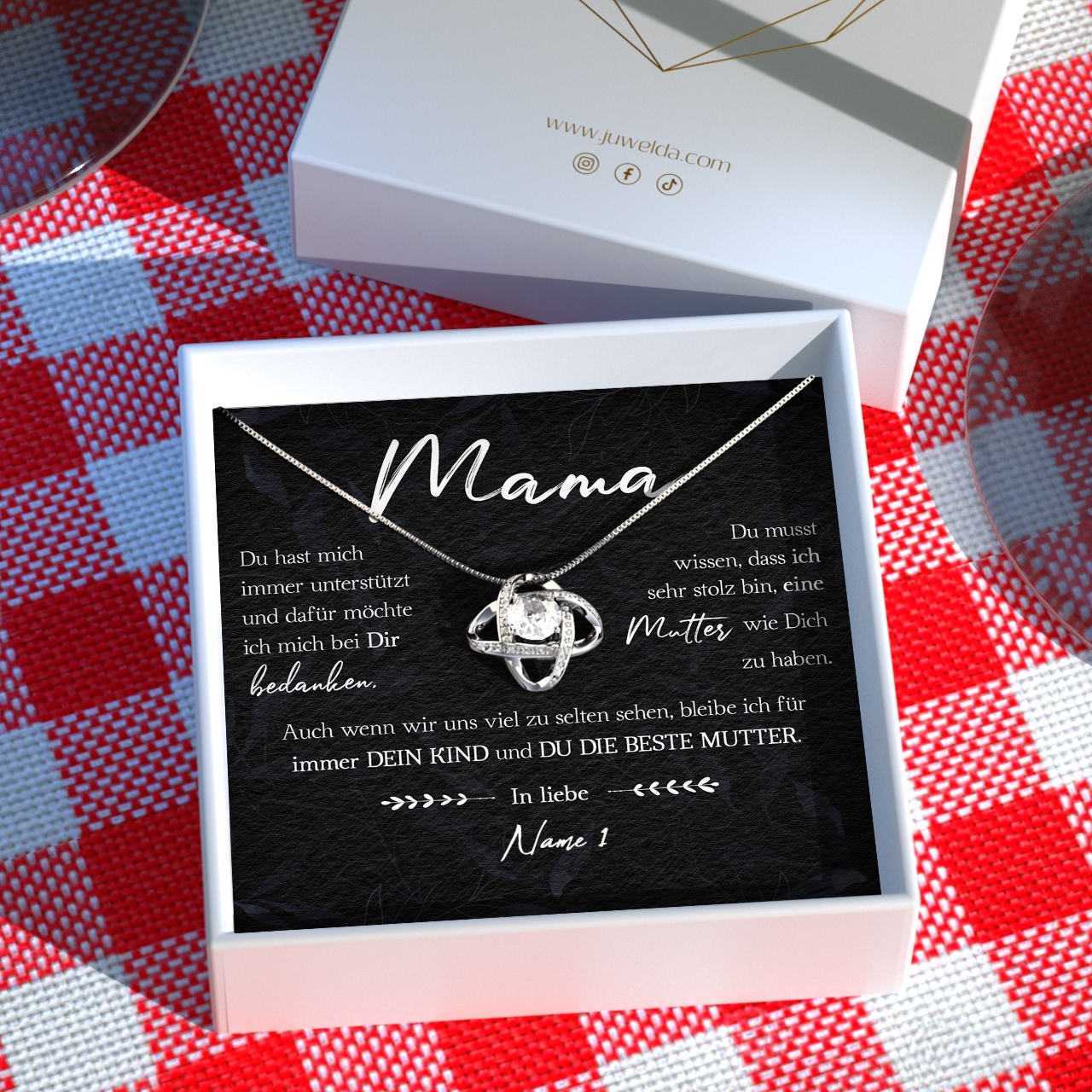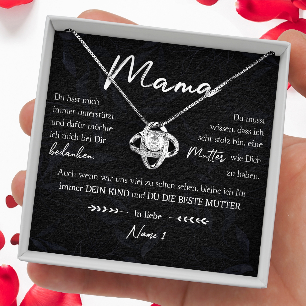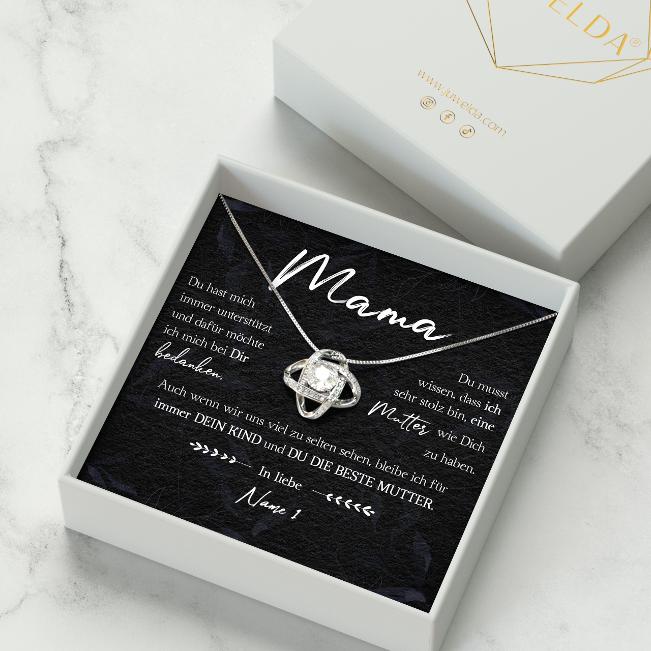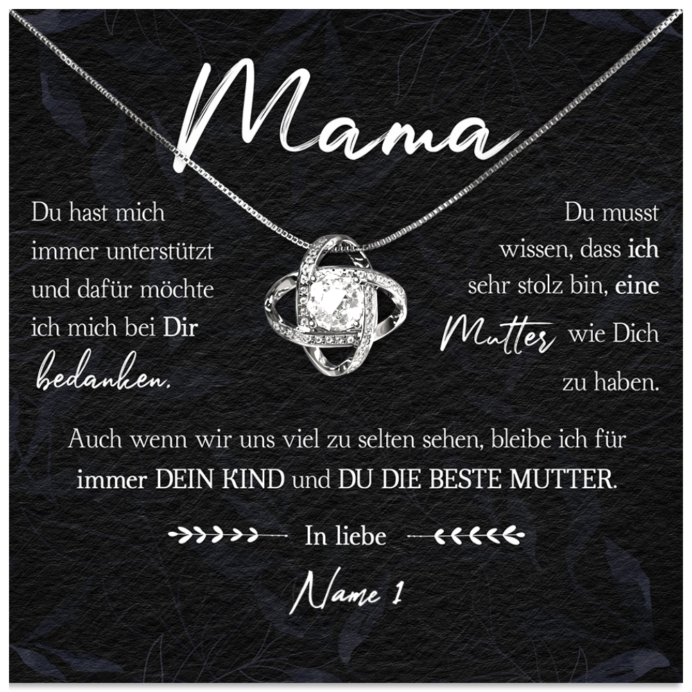 Wir drucken Deine personalisierte Karte mit Deinen Wunschnamen und legen diese zusammen mit der funkelnden Halskette in eine hochwertige Schmuckbox. Damit Du das Geschenk bei Deinem nächsten Besuch bei Deiner Mutter sofort überreichen kannst, legen wir zusätzlich eine schöne Geschenktüte in Dein Paket. Somit erhältst Du ein rundum vollkommenes Geschenk, das bestimmt in Erinnerung bleiben wird!