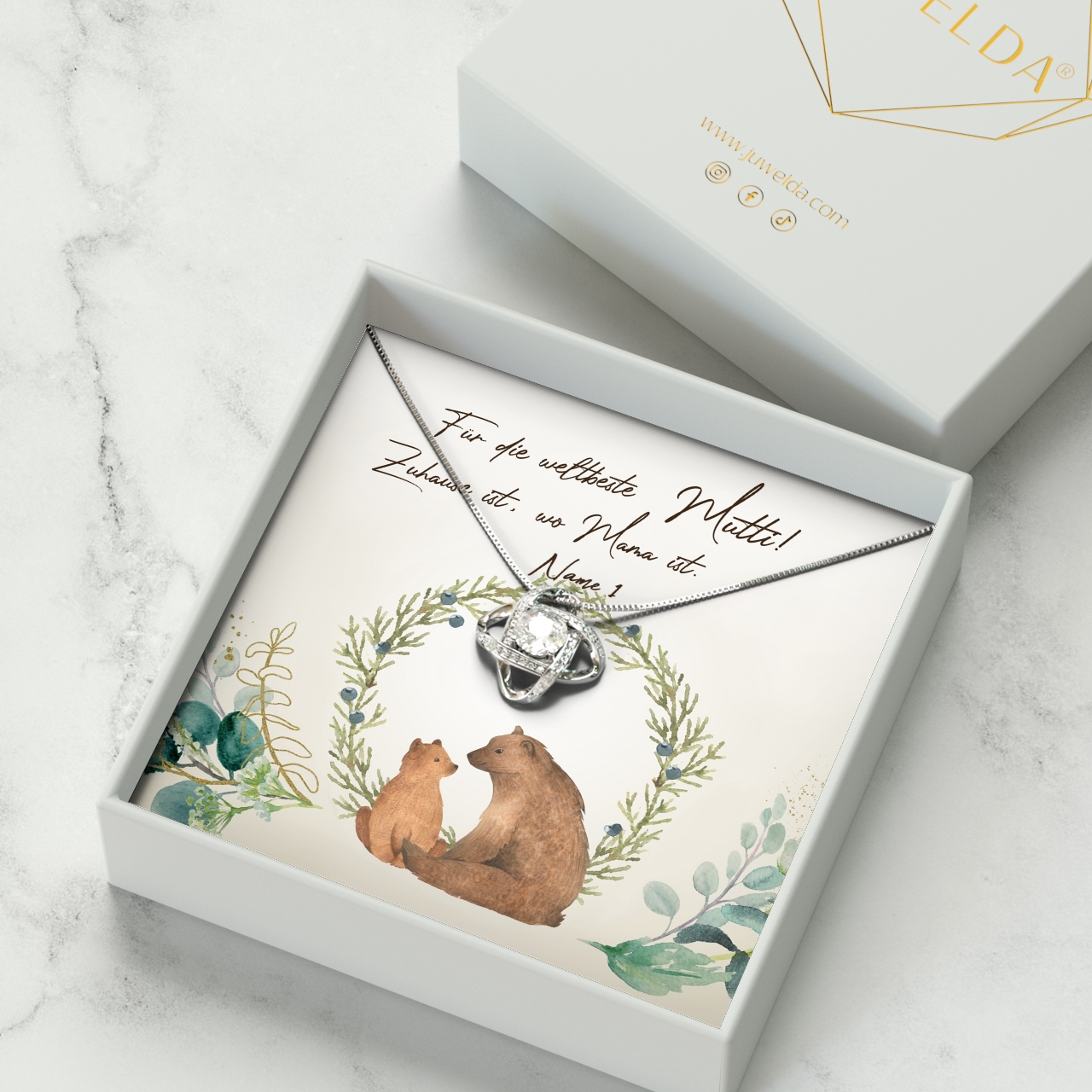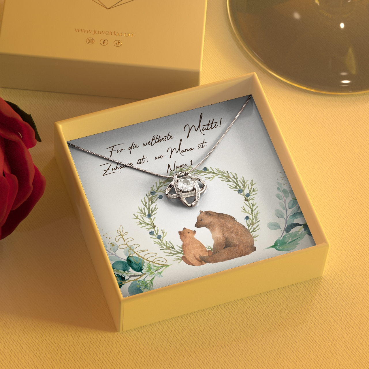 Die personalisierte Grußkarte wird zusammen mit dem Schmuckstück in eine hübsche Schatulle aus Kunstleder gelegt. Diese ist von innen mit Samt ausgekleidet und sehr edel. Wir legen Dir zu Deiner Lieferung auch eine hochwertige Geschenktasche in elegantem Design bei. Überreiche Deiner Mama dieses ganz besondere Geschenk und zaubere ein Lächeln auf ihr Gesicht.