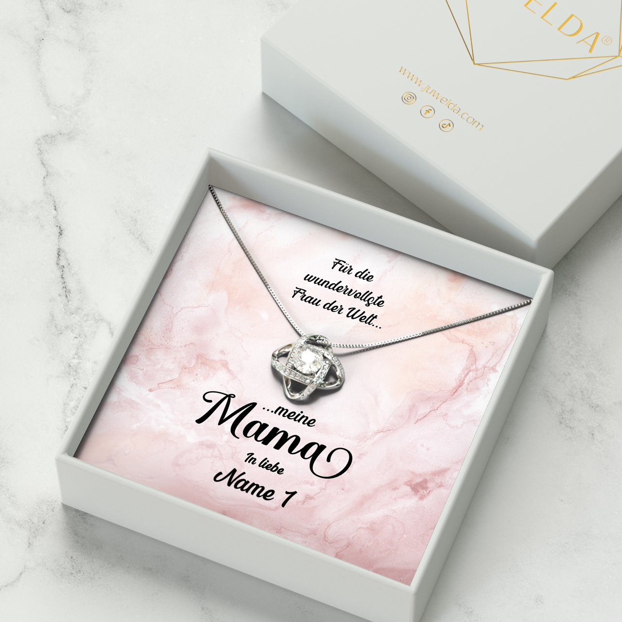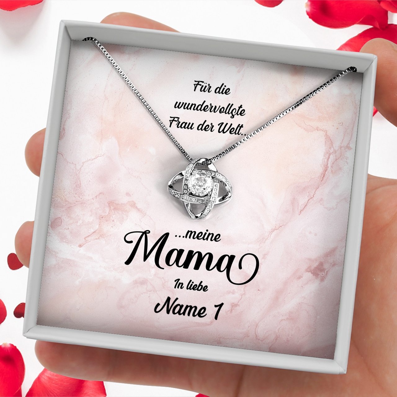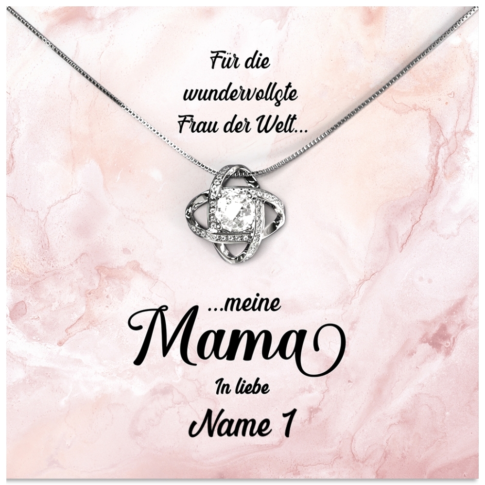 Liebe schenken, ohne etwas dafür zu verlangen – das ist die bedingungslose Liebe der Mutter zu ihrem Kind. Hat auch Deine Mutter Dich immer bedingungslos geliebt? Dann kannst Du Dich mit unserer personalisierten Karte „Wundervolle Mutter“ bei Deiner Mama bedanken und ihr ein schönes und sehr persönliches Geschenk überreichen. Im Geschenkset ist eine funkelnde Halskette aus 925 Sterling Silber mit kristallklaren 5A Zirkonia und eine personalisierte Karte mit einem emotionalen Spruch enthalten. Um die Karte zu personalisieren, musst Du nur Deinen Namen in das Personalisierungsfeld eintragen. Anschließend kannst Du Dir eine Live-Vorschau Deiner individuellen Karte generieren und Dich vom Ergebnis überzeugen.