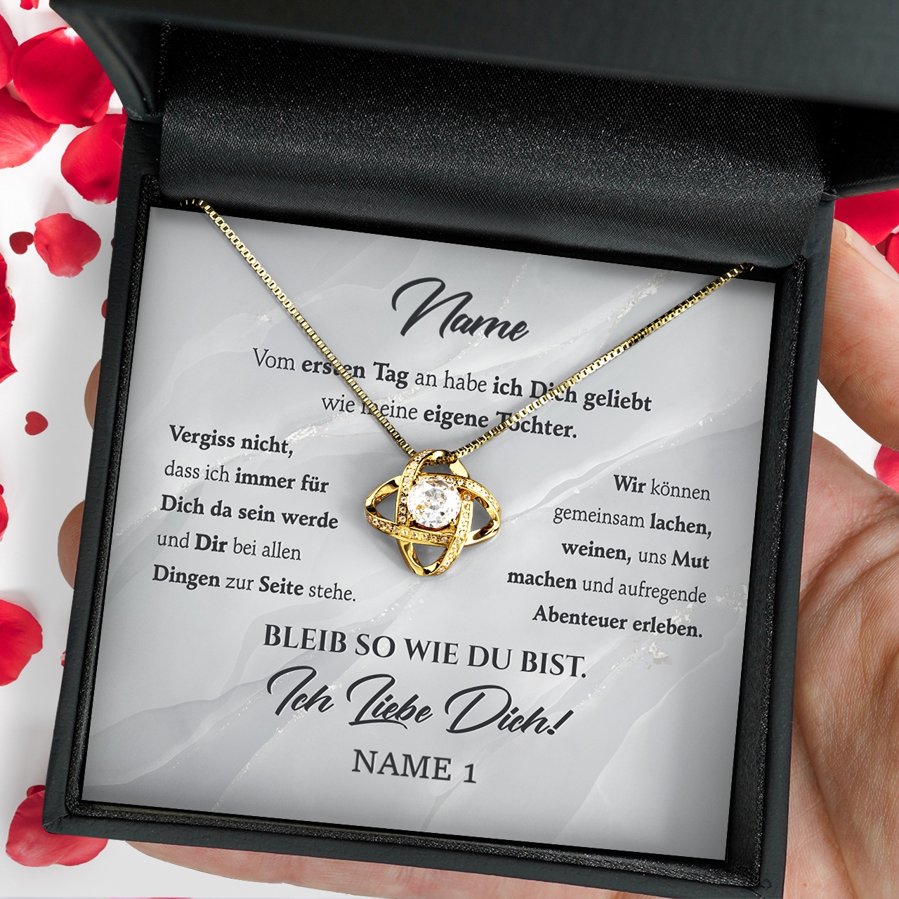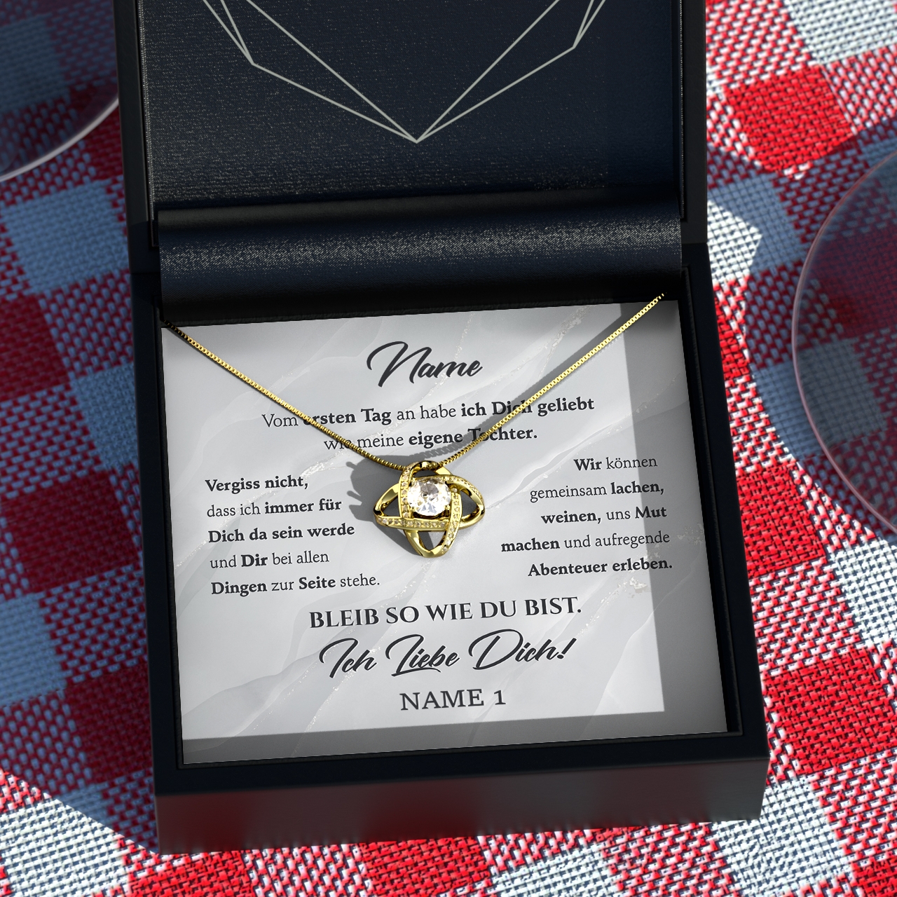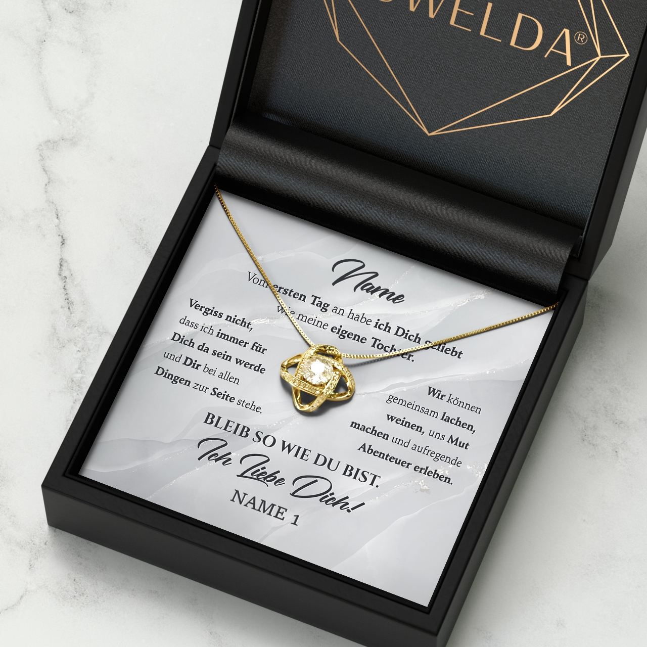 Möchtest Du Dein Geschenk sofort an Deinen Lieblingsmenschen überreichen? Dann solltest Du ein Blick auf die Variante mit der premium Geschenkverpackung werfen. Die Halskette Deiner Wahl und Deine personalisierte Karte werden liebevoll in eine hochwertige Schmuckbox mit Kunstlederüberzug und Samt-Innenbezug gelegt. Damit die Überraschung auch wirklich gut ankommt, wird alles behutsam in eine Geschenktasche gelegt, in Seidenpapier verpackt und mit einer Schleife zugebunden. Hier bekommst Du bereits einen kleinen Vorgeschmack: