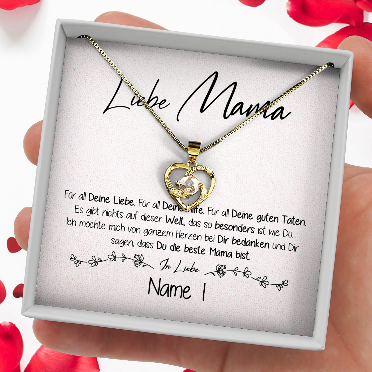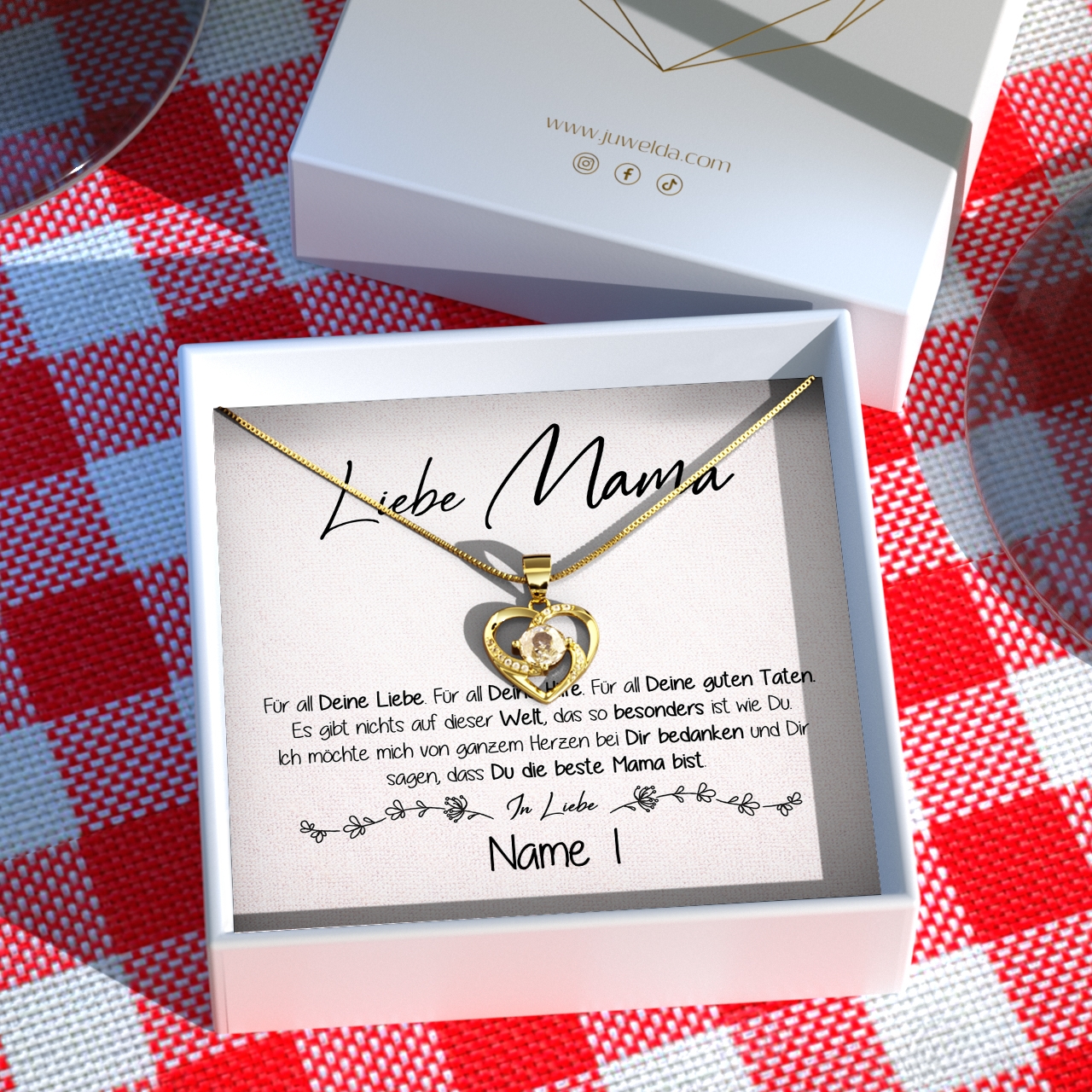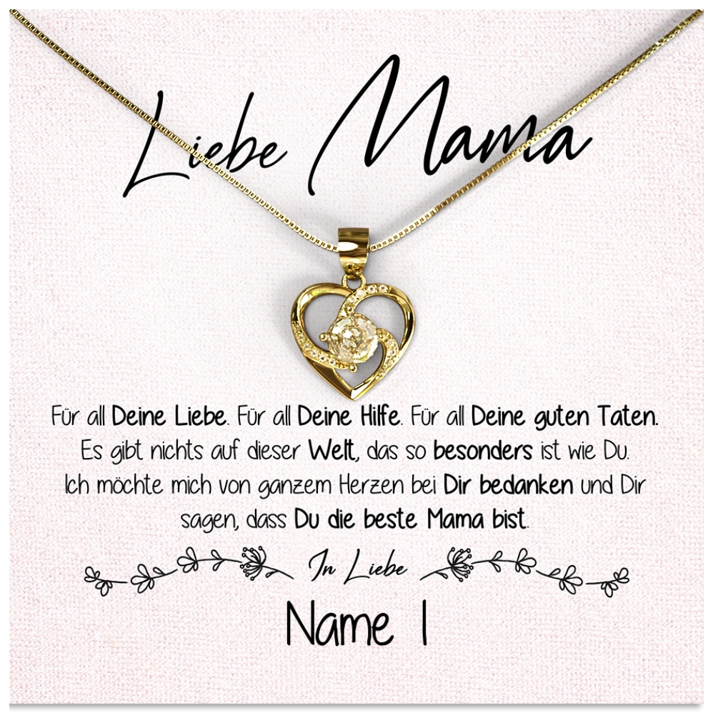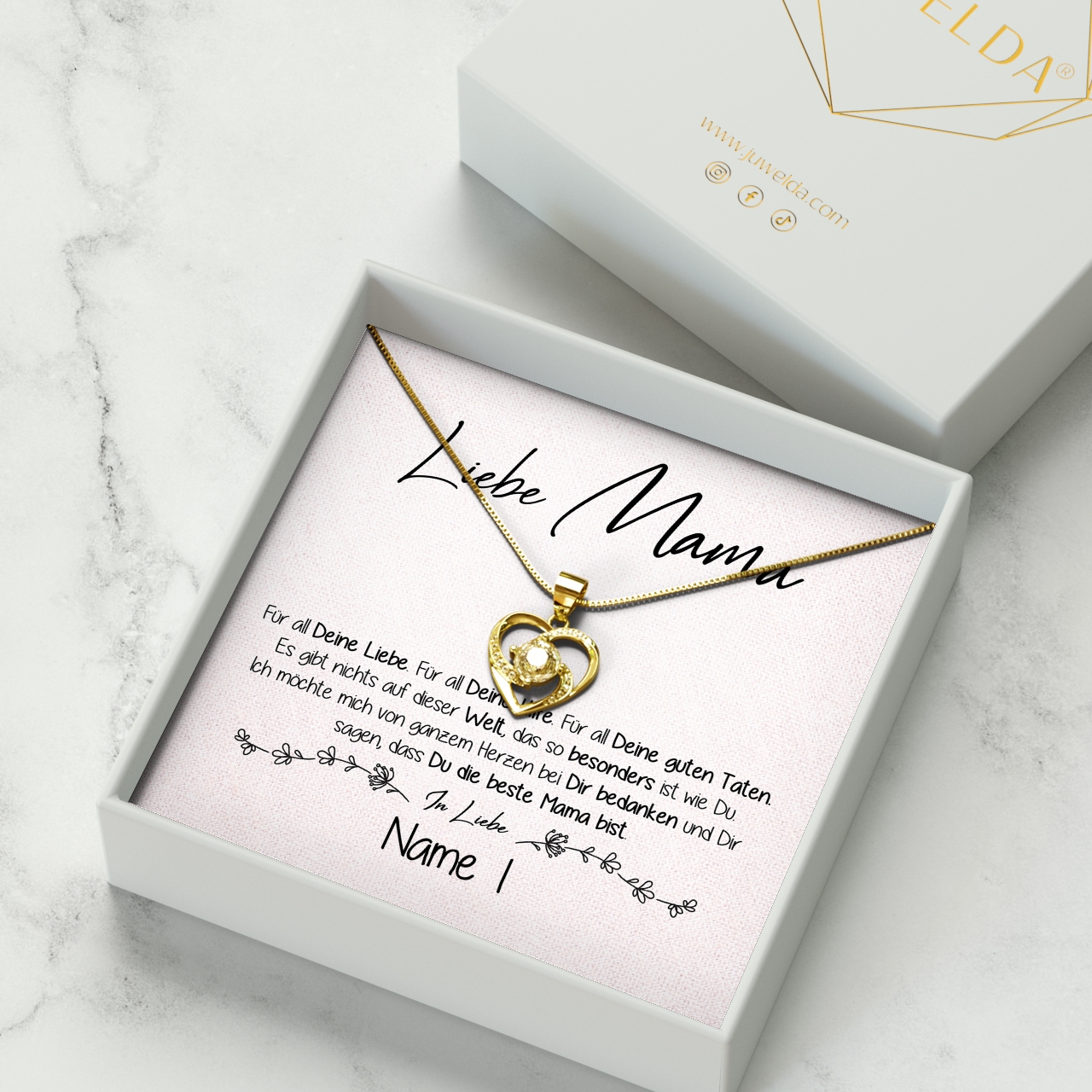 Dein ganz persönliches Geschenk besteht aus einer wunderschönen Halskette, die zusammen mit der personalisierten Karte in einer exklusiven Schmuckbox geliefert wird. Zusätzlich legen wir eine hochwertige Geschenktasche in Dein Paket, damit Du das Präsent sofort an Deine Mutter übergeben kannst.