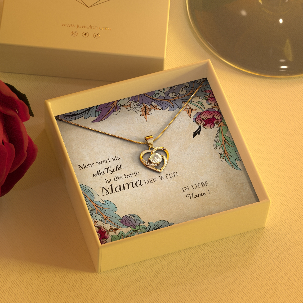 Ohne Mama wäre das Leben trist und langweilig? Sie bringt Dich zum Lachen, wenn Du traurig bist und würde mit Dir Pferde stehlen? Dann bringe sie mit einem ganz besonderen Präsent zum Staunen. Dafür kannst Du mir nur wenigen Klicks bei uns ein individuelles Geschenkpaket zusammenstellen. Die märchenhaft schönen Schmuckstücke sind in vielen Varianten im Angebot. So kannst Du ein Juwel wählen, das perfekt zu Mama passt. Das Vintage-Design dieser personalisierbaren Grußkarte ist elegant und detailliert gestaltet. Verewige Deinen Namen und auch die Namen weiterer Geschwister auf der Grußkarte.
