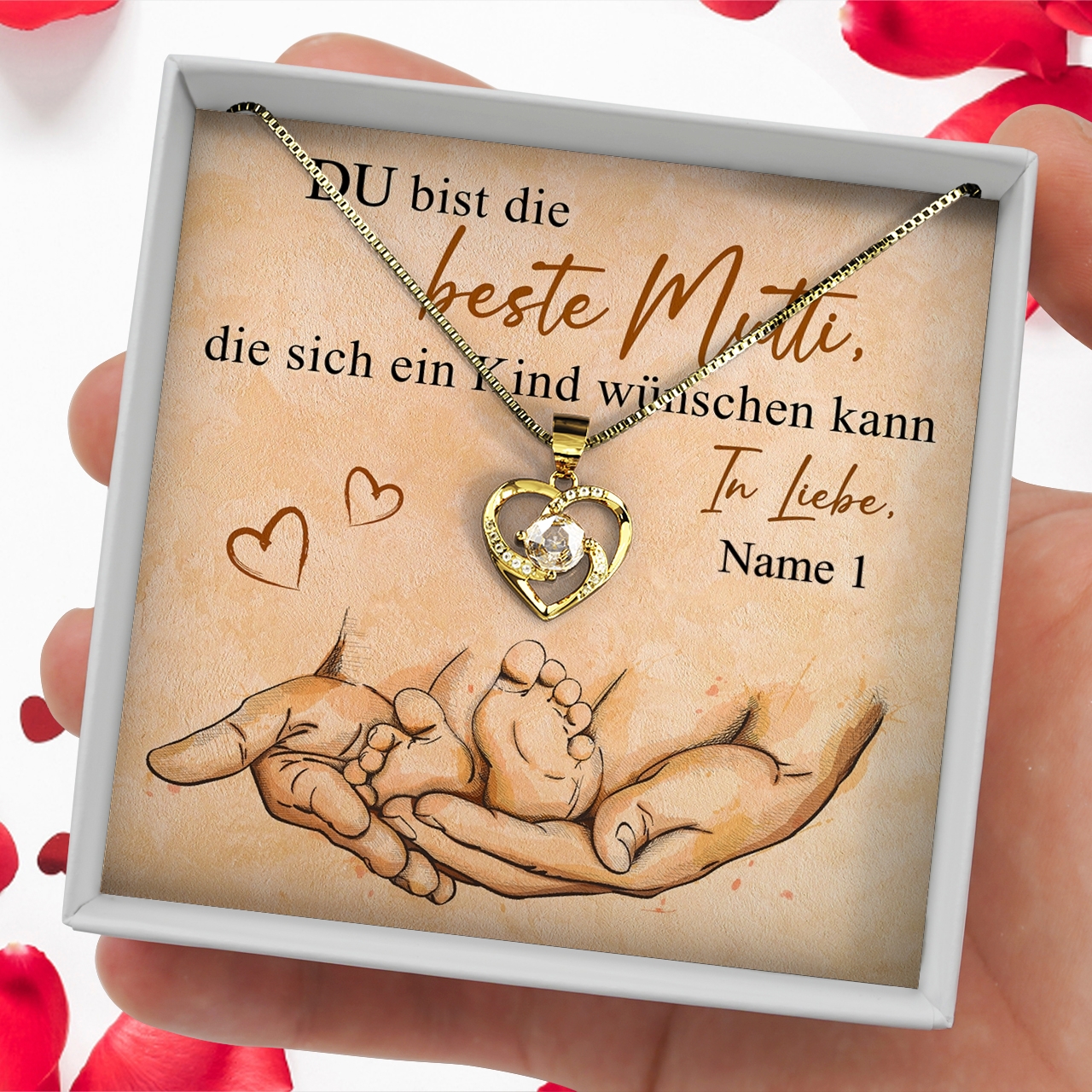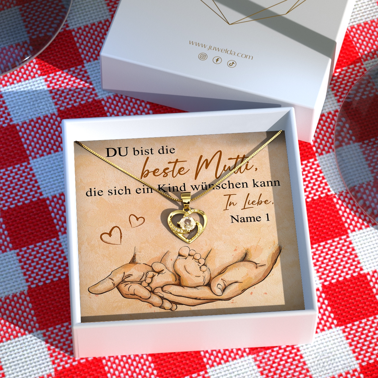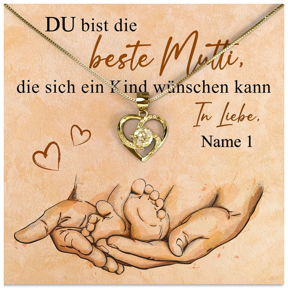 Ob Du Deine Mama überraschen möchtest oder Du der Mama Deines Kindes zum ersten Muttertag ein Geschenk überreichen willst, die Schmuckbox mit der „Beste Mutti der Welt“-Grußkarte ist ein absolutes Highlight. Das schöne Design zeigt eine hübsche Zeichnung und findet genau die richtigen Worte für die Mama. Auf der Karte können ein oder mehrere Namen personalisiert werden. So ist das Schmuckgeschenk garantiert einzigartig.
