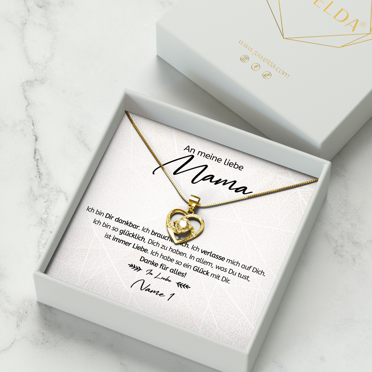 Es ist immer ein ganz tolles Gefühl, einem geliebten Menschen eine Überraschung zu überreichen. Wenn es sich bei diesem Menschen um die eigene Mutter handelt, ist die Freude umso größer. Denn niemand hat es mehr verdient beschenkt zu werden als Mama. Sie hat Dich aufgezogen und viel Zeit mit Dir verbracht. Bist Du ihr dafür dankbar und brauchst noch ein Geschenk zum Muttertag, Geburtstag oder zu Weihnachten? Das Geschenkset von Juwelda „Danke für immer“ besteht aus einer wunderschönen Halskette mit kristallklaren 5A Zirkonia und einer personalisierten Karte. Du kannst bis zu 7 Namen auf der Karte verewigen lassen. Damit kannst Du das ideale Geschenk von Dir und Deinen Geschwistern kreieren.