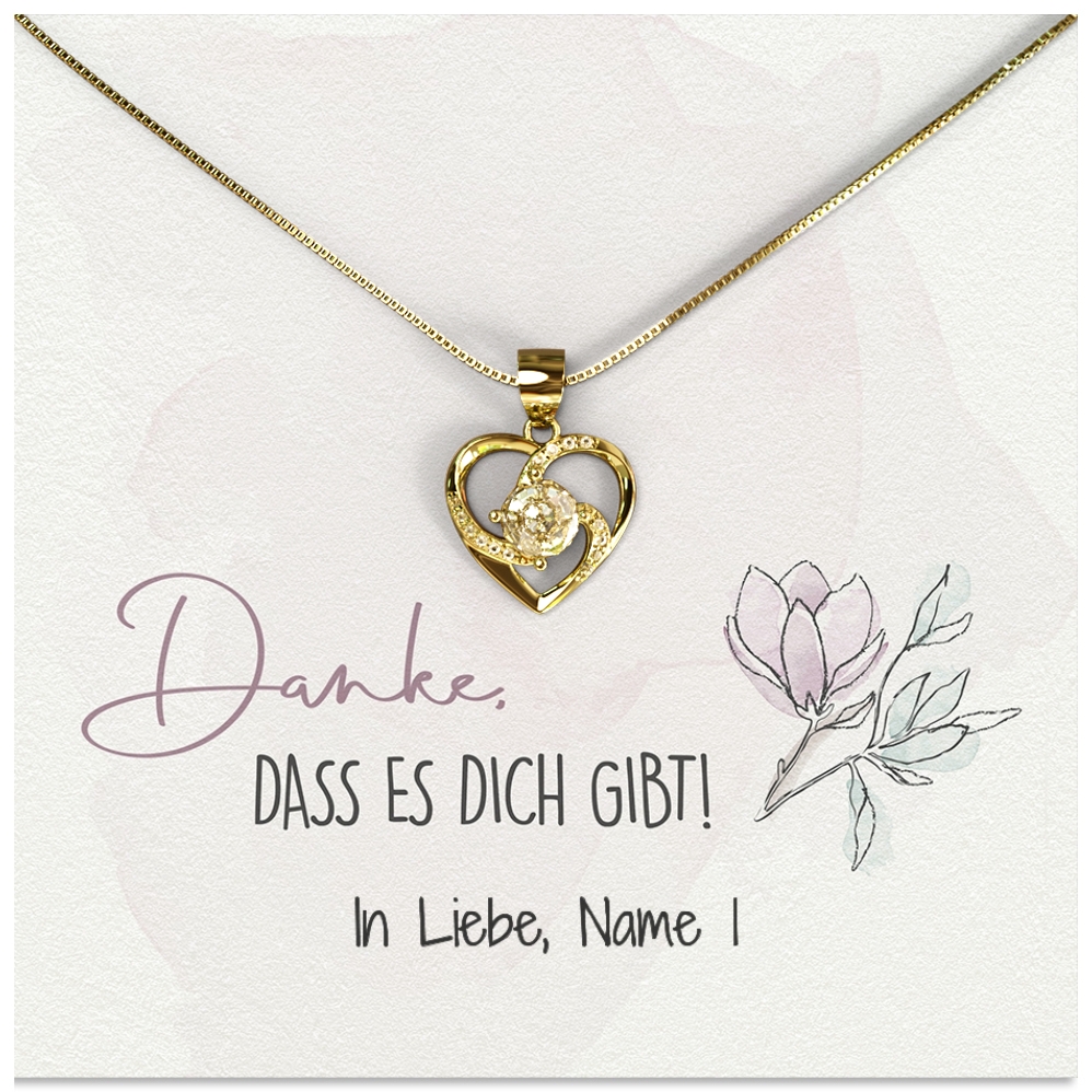 Mama ist der wertvollste Mensch im Leben und Mittelpunkt der Familie. Sie ist immer da, wenn man Hilfe benötigt und tröstet einen in schweren Zeiten. Viel zu oft vergessen wir uns dafür zu bedanken. Mit unserer personalisierten Karte „Danke Mama“ kannst Du jetzt ganz einfach „Danke“ sagen und Deiner Mama ein sehr persönliches Geschenk überreichen. Die Karte überzeugt mit Ihrem schlichten und einfachen Design. Du erhältst eine wunderschöne Halskette aus 925 Sterling Silber mit 5A Zirkonia. Um die Karte zu individualisieren, musst Du lediglich Deine Wunschnamen in den Konfigurator eingeben und kannst Dich in der Live-Vorschau von dem Ergebnis überzeugen.