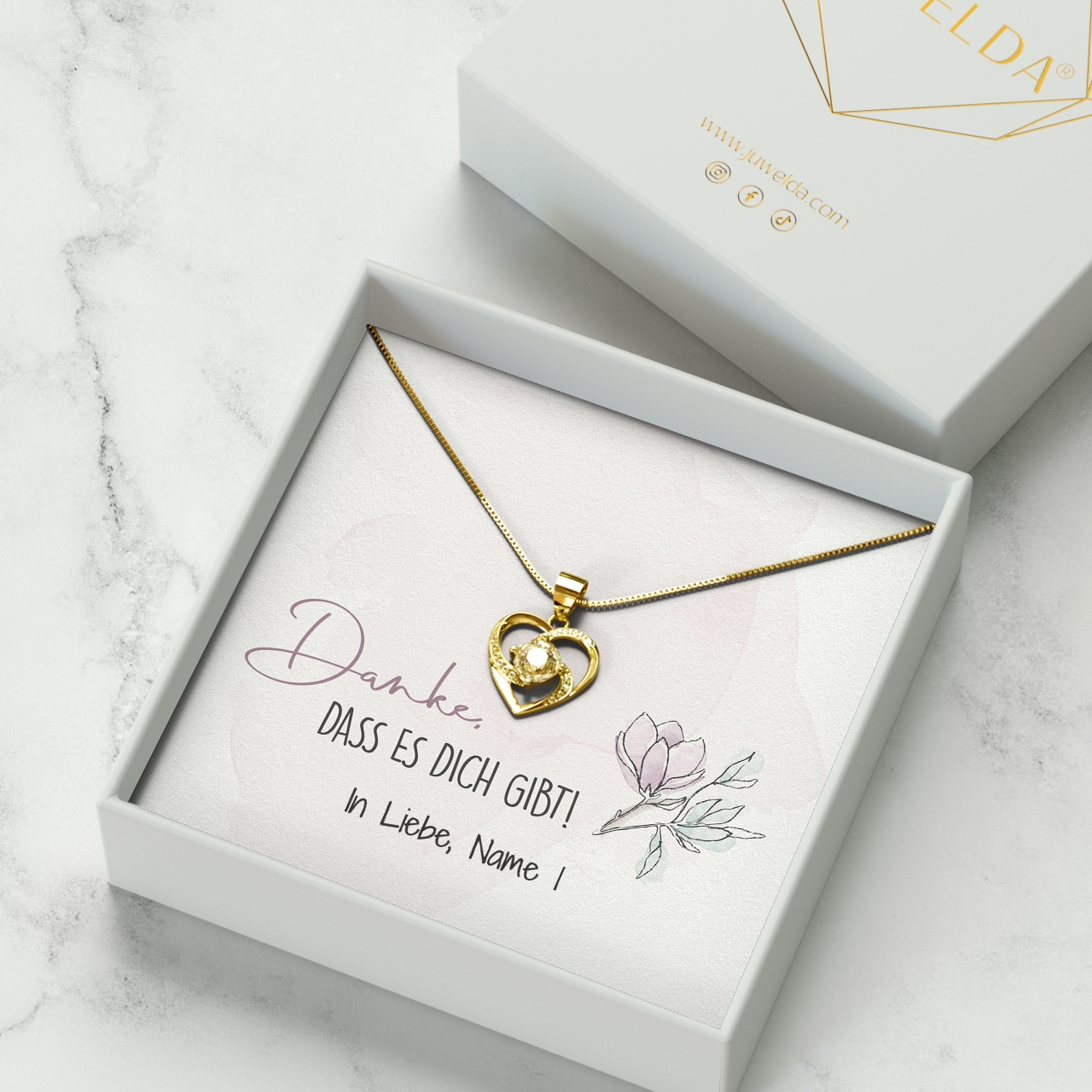Möchtest Du Dein Geschenk sofort an Deinen Lieblingsmenschen überreichen? Dann solltest Du ein Blick auf die Variante mit der premium Geschenkverpackung werfen. Die Halskette Deiner Wahl und Deine personalisierte Karte werden liebevoll in eine hochwertige Schmuckbox mit Kunstlederüberzug und Samt-Innenbezug gelegt. Damit die Überraschung auch wirklich gut ankommt, wird alles behutsam in eine Geschenktasche gelegt, in Seidenpapier verpackt und mit einer Schleife zugebunden. Hier bekommst Du bereits einen kleinen Vorgeschmack: