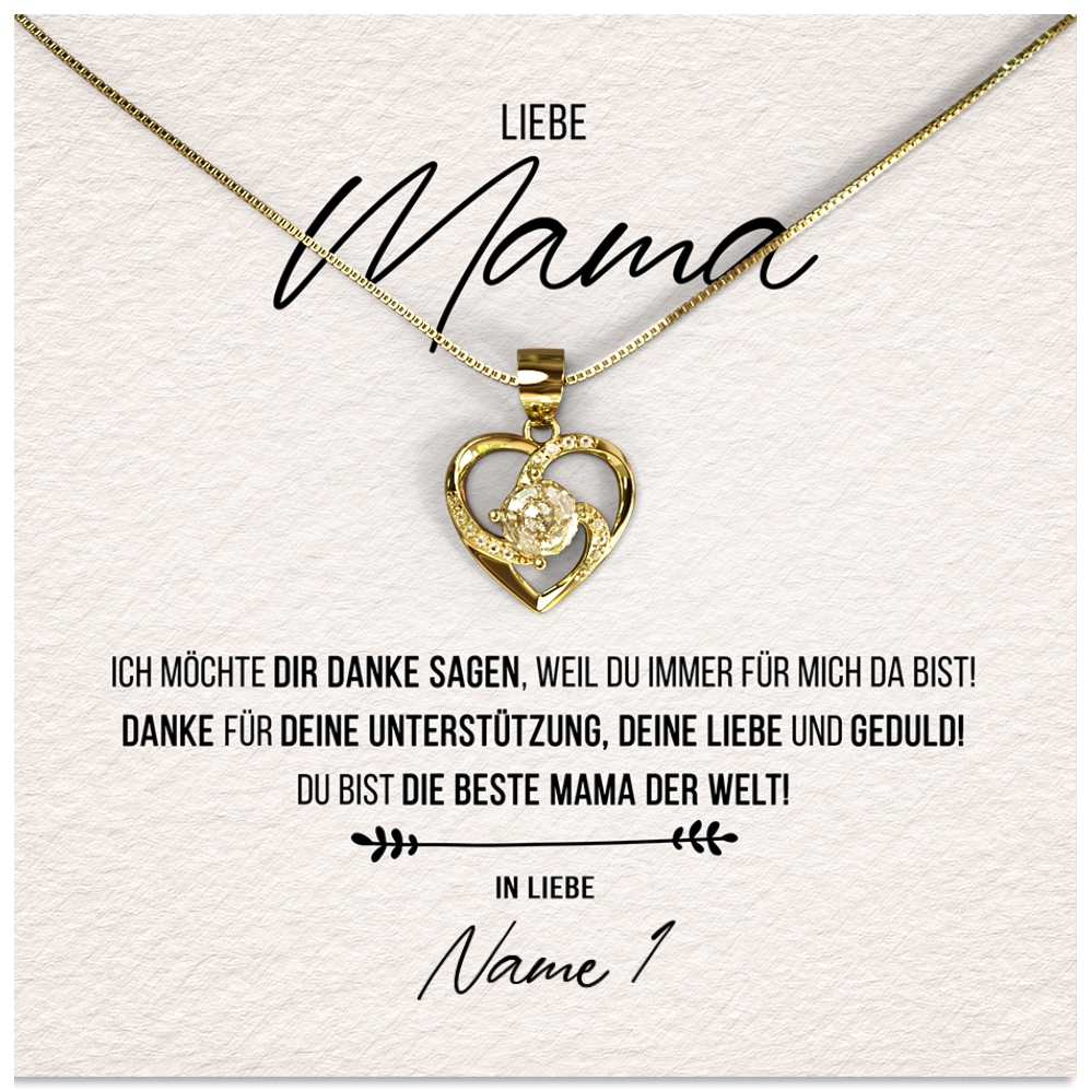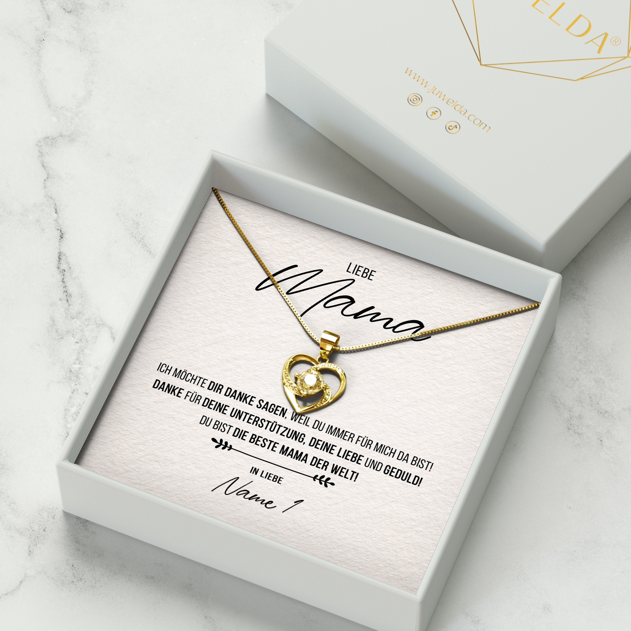 Wir liefern Dir eine hochwertige Halskette aus echtem 925 Sterling Silber in den Farben Silber, Gelbgold oder Rosegold. Außerdem legen wir Deine personalisierte Karte zusammen mit der Halskette in eine exklusive Schmuckbox aus Kunstleder. Um Deiner Mutter eine wirklich große Freude bereiten zu können, legen wir eine schöne Geschenktasche in Dein Paket. Damit hast Du die Möglichkeit, Dein sehr persönliches Geschenk sofort nach Erhalt Deiner Bestellung an Deine geliebte Mama zu übergeben.