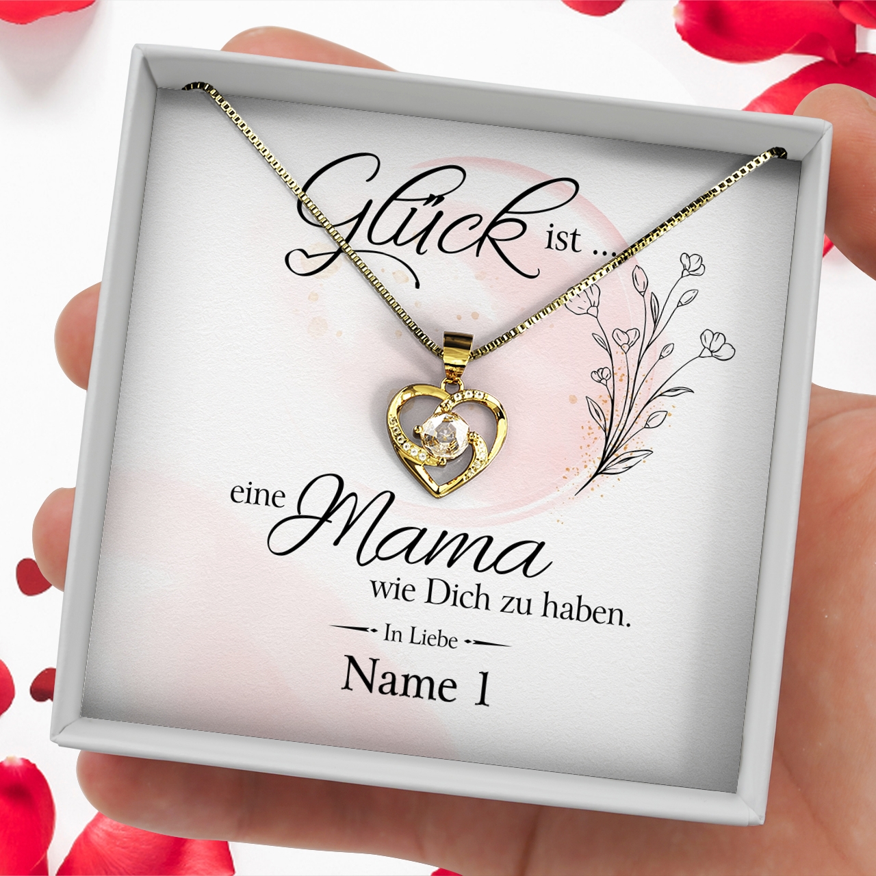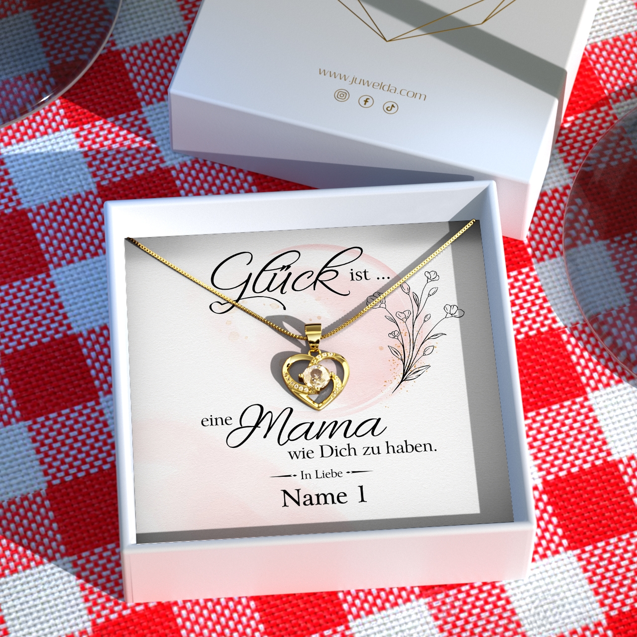 Wir verpacken Dir Dein ganz persönliches Geschenk in unserer Schmuckmanufaktur im wunderschönen Schwarzwald mit viel Liebe und von Hand. In wenigen Tagen hältst Du Dein Paket in der Hand, bestehend aus einer Halskette, einer personalisierten Karte mit Deinem Namen und einer hochwertigen Schmuckbox aus Kunstleder. Außerdem legen wir das alles in eine exklusive Geschenktasche. Somit erhältst Du das perfekte Geschenk und kannst es sofort Deiner Mutter überreichen.