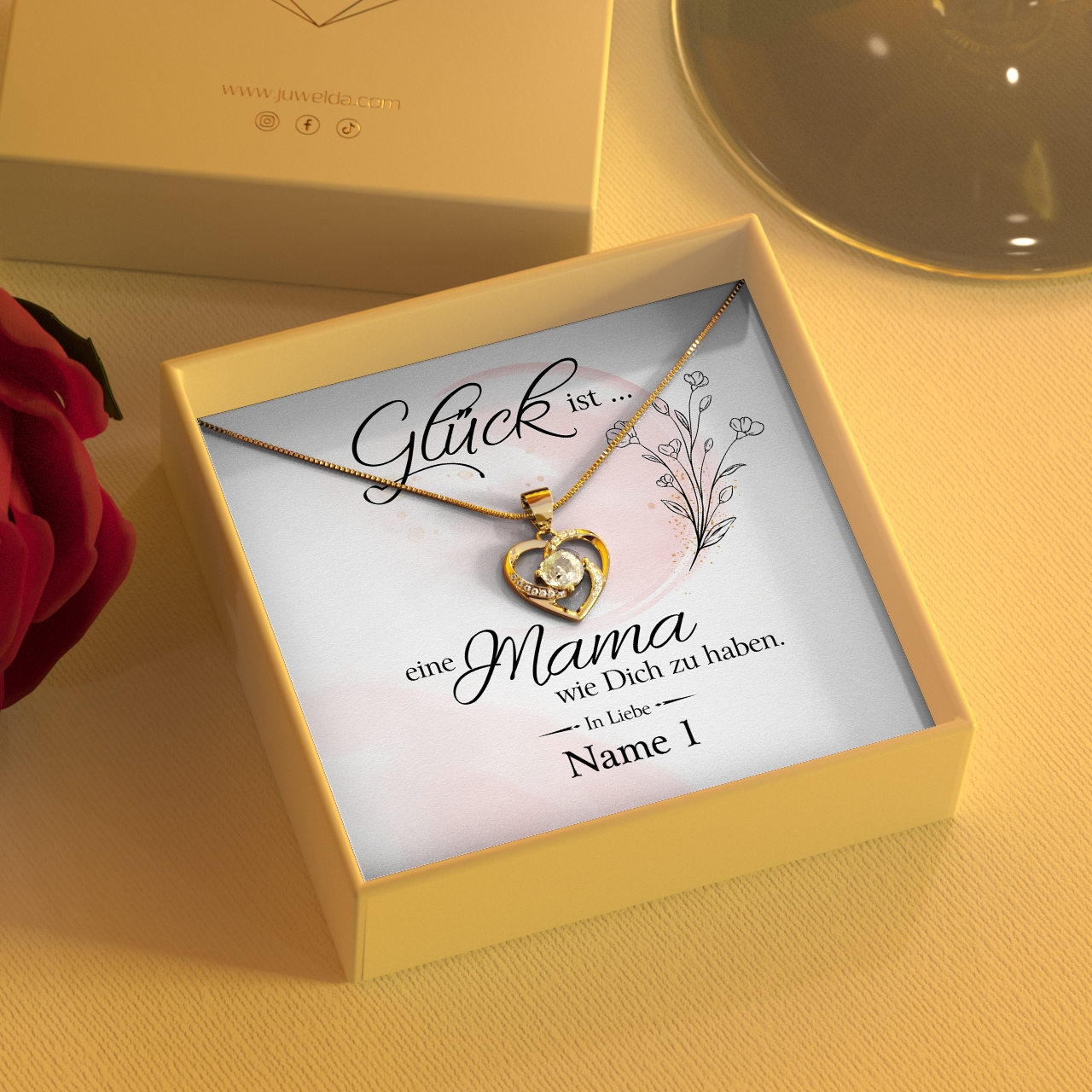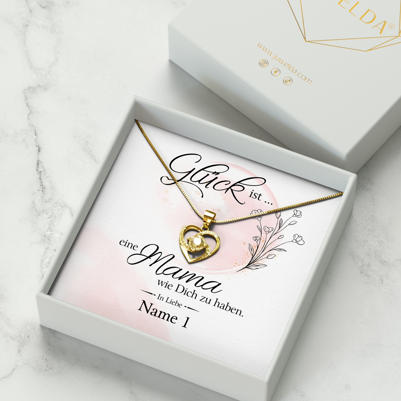 Was schenk ich meiner Mutter? Diese Frage stellen wir uns vor jedem besonderen Anlass, wie z. B. dem Muttertag oder Geburtstag. Viel zu häufig entscheiden wir uns für Blumen oder ein anderes einfallsloses Geschenk. Mit einem Präsent von Juwelda hast Du die Möglichkeit, Deiner Mutter ein unvergessliches und emotionales Geschenk zu überreichen. Unsere personalisierte Karte „Du bist unser Glück“ eignet sich perfekt dafür. Du suchst Dir eine Halskette Deiner Wahl aus und wählst den für Dich passenden Spruch.