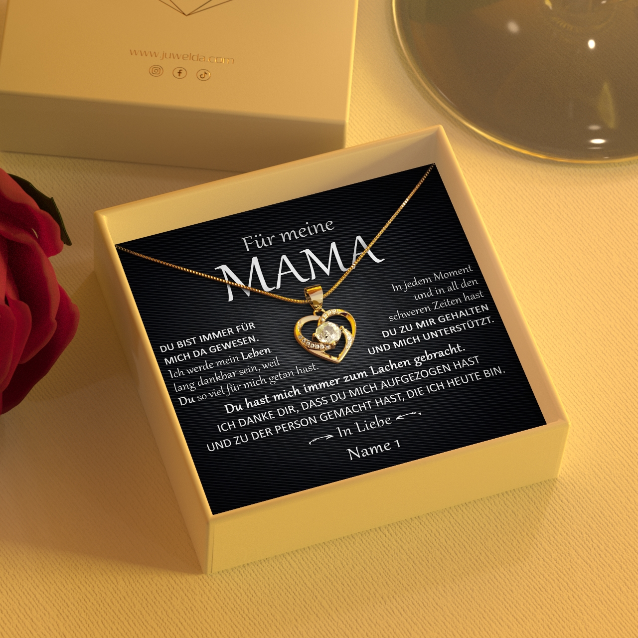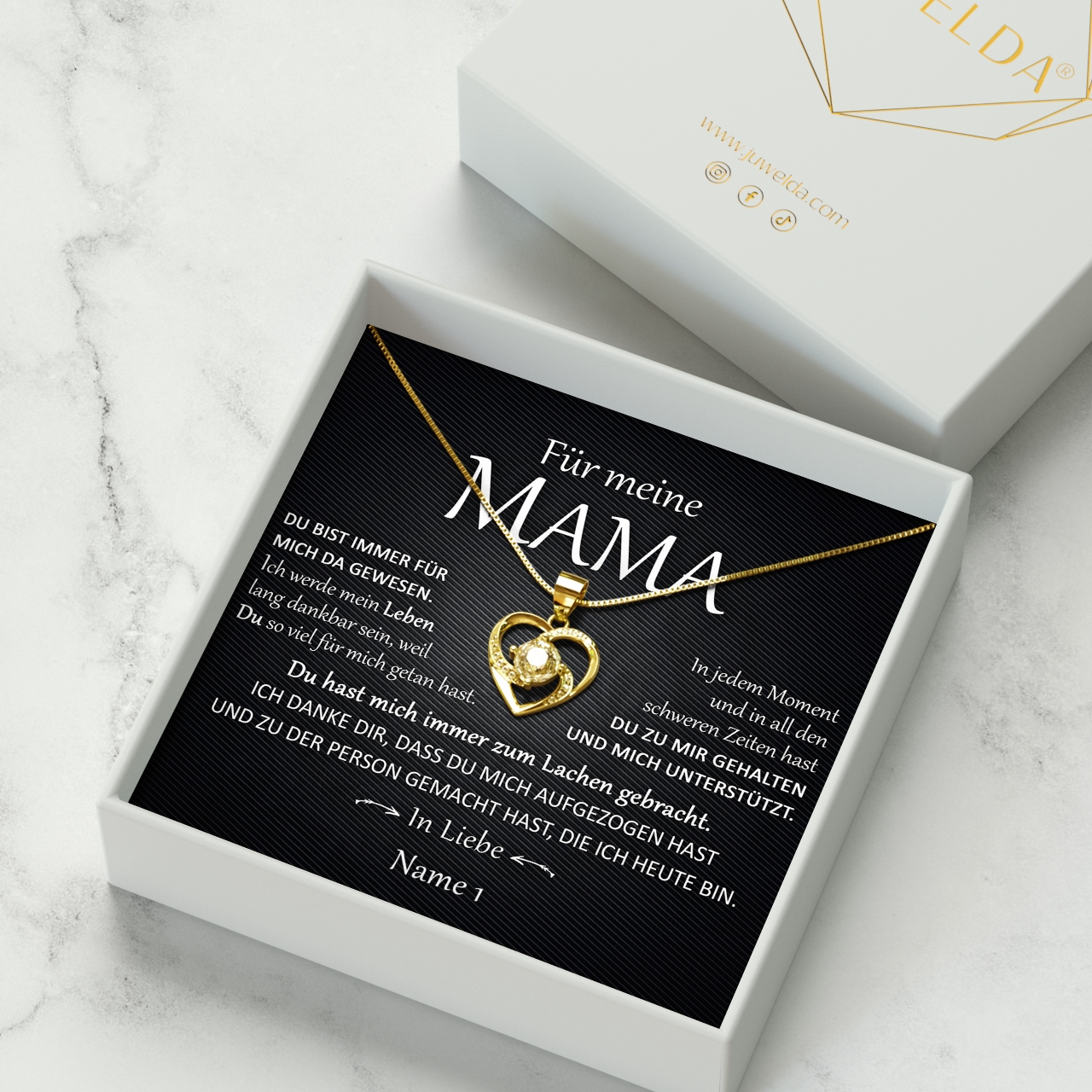 Wir liefern innerhalb von 2-3 Tagen Dein einzigartiges Geschenk. Die Halskette wird zusammen mit der personalisierten Karte in eine schöne Schmuckbox gelegt und inklusive einer hochwertigen Geschenktasche an Dich übergeben. So kannst Du das Präsent sofort an Deine Mutter verschenken. Du sorgst für einen unvergesslichen Moment der Freude und Glück mit einem ganz persönlichen Geschenk von Juwelda.