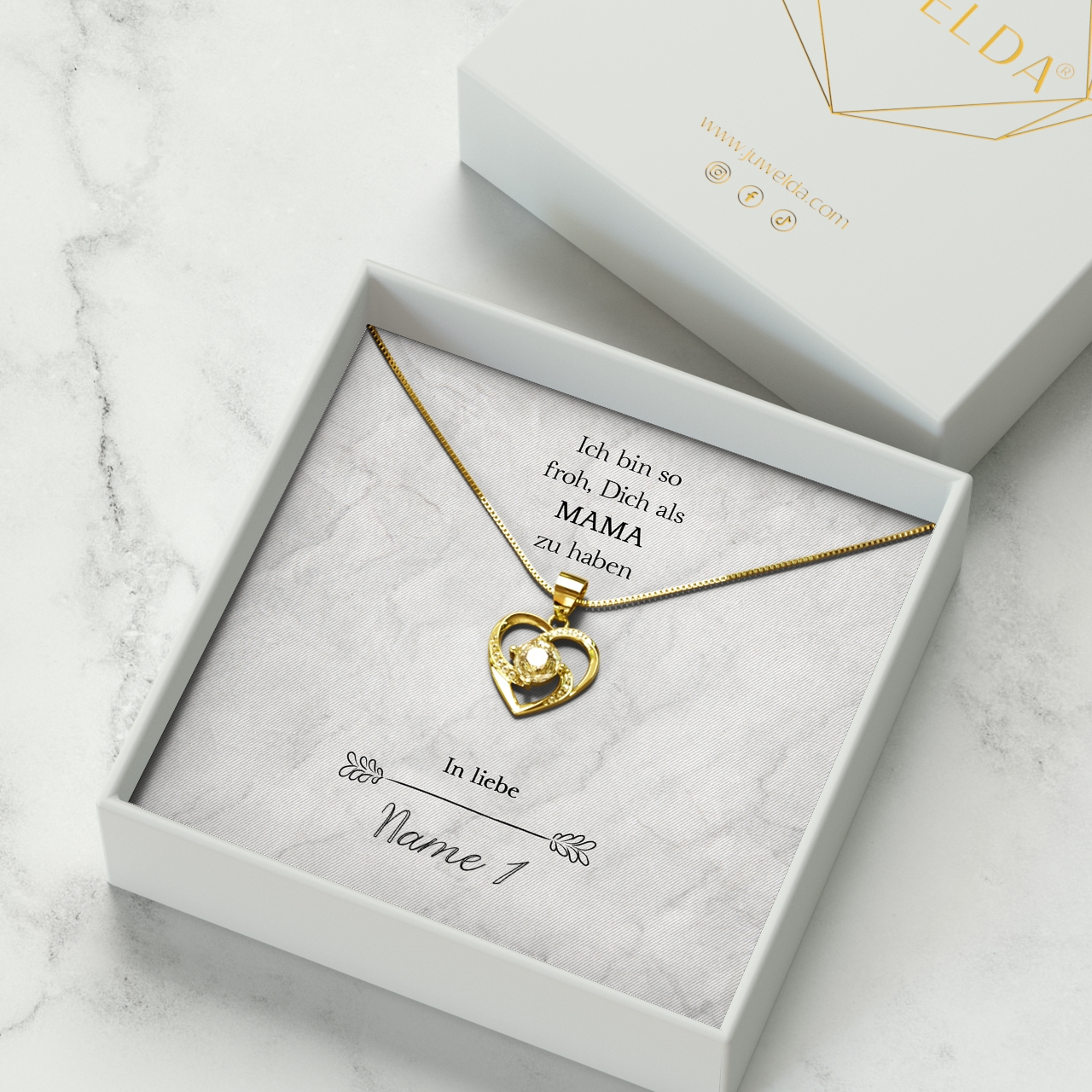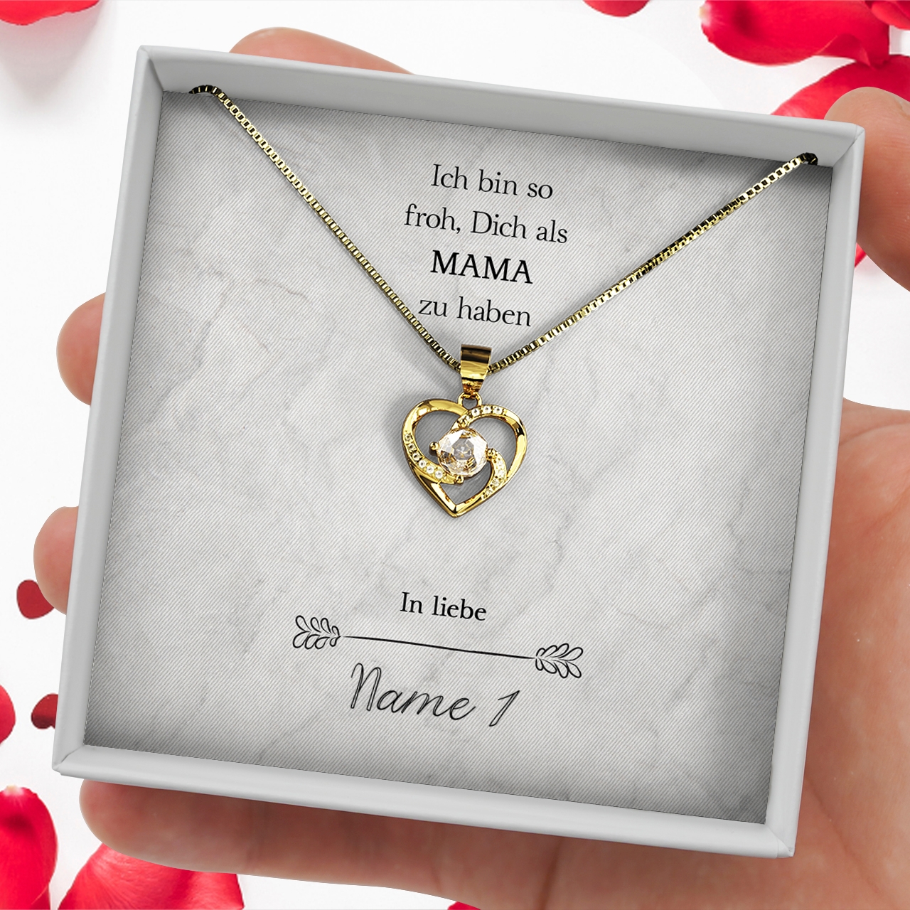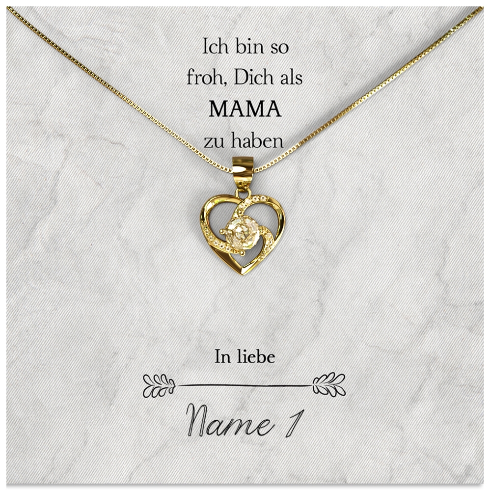 Wir stellen Deine Karte ganz individuell und nur für Dich mit Deinen Wunschnamen her. Zusammen mit der hochwertigen Halskette aus 925 Sterling Silber und der edlen Schmuckbox erhältst Du das perfekte Geschenk, welches Deine Mutter zu Tränen rühren kann. Um das Geschenk sofort an Deine Mama überreichen zu können, legen wir eine gratis Geschenktasche zu jeder Bestellung in das Paket.