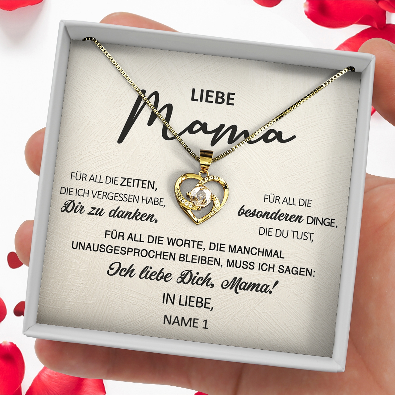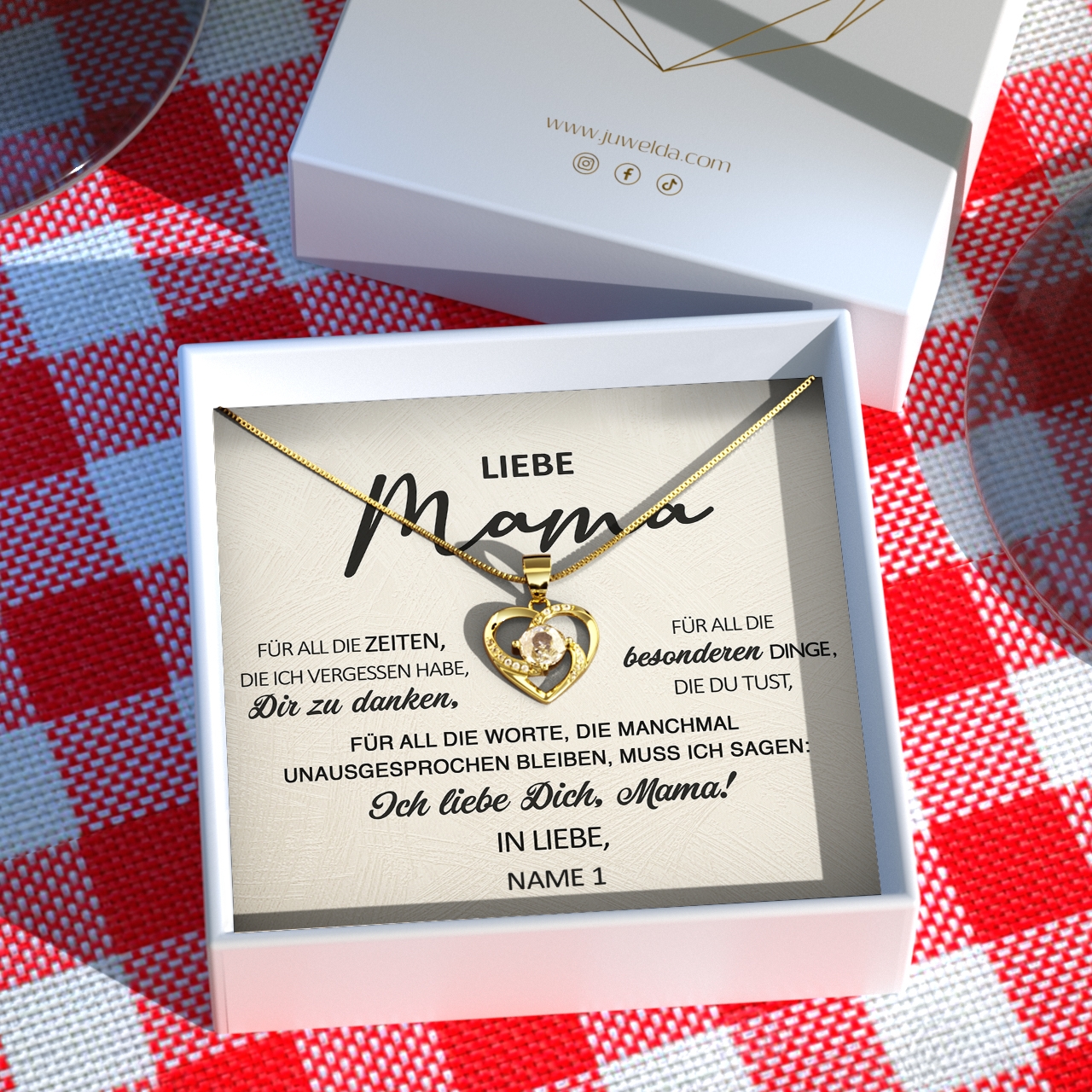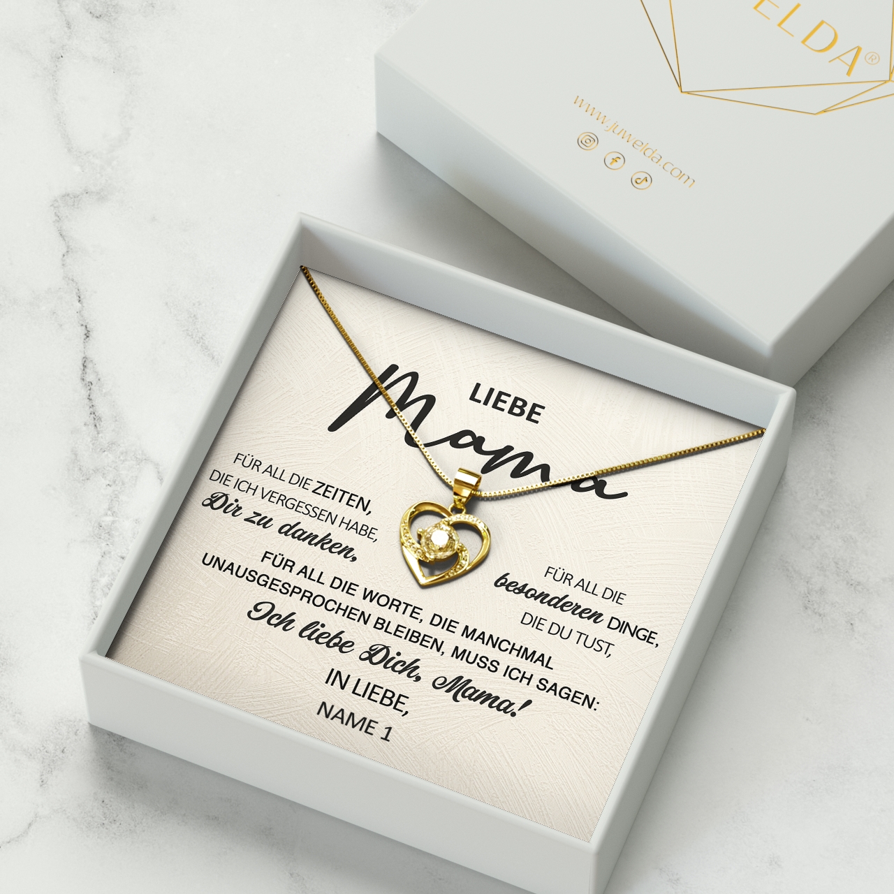 Deine Mama bedeutet Dir sehr viel und Du weißt nicht, wie Du Dich bei Ihr bedanken kannst? Mit einem persönlichen Geschenk von Juwelda wirst Du Deiner Mama ganz bestimmt ein Lächeln ins Gesicht zaubern. Wähle Dein Schmuckstück, such Dir ein Motiv Deiner Wahl aus und trage Deine Wunschnamen in das Personalisierungsfeld ein. Mit der Live-Vorschau kannst Du das Geschenk für Deine Mama ansehen und Änderungen vornehmen. Sobald Du mit Deiner Wahl zufrieden bist und Dein perfektes Geschenk gekauft hast, beginnen wir mit der Arbeit.