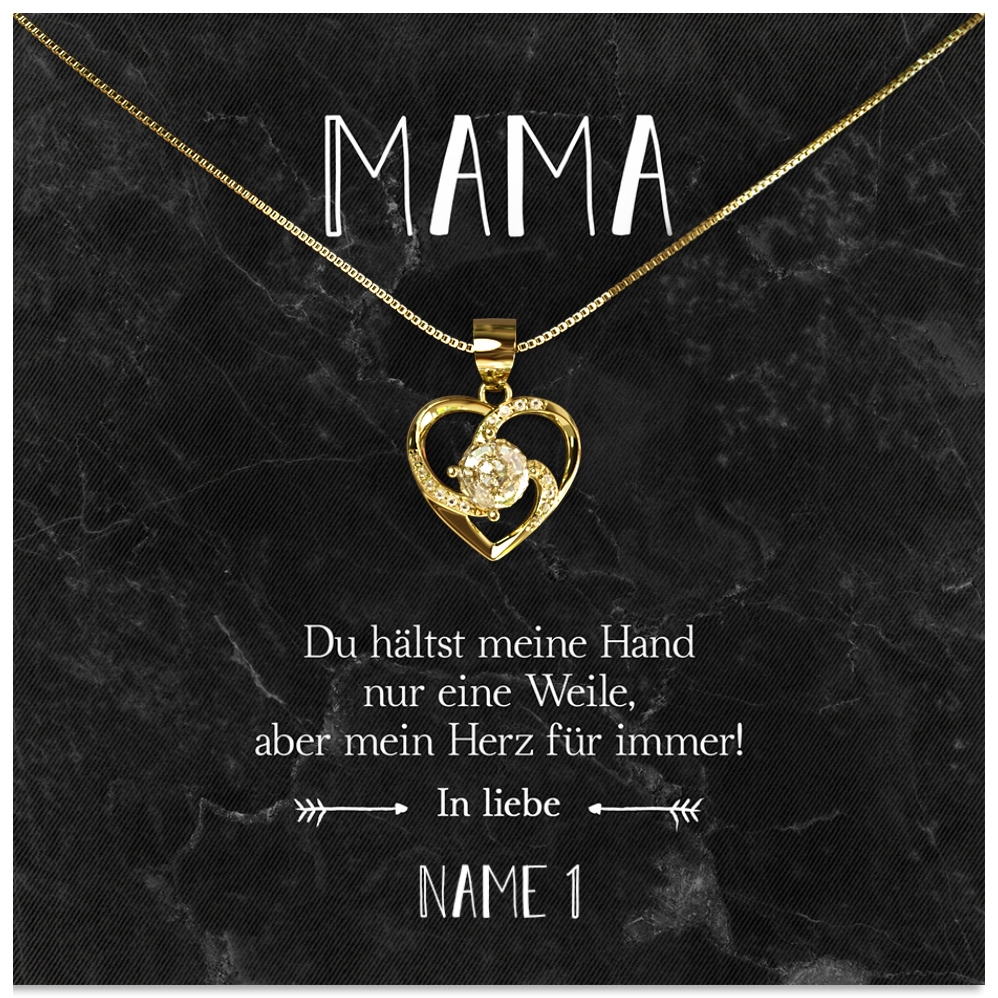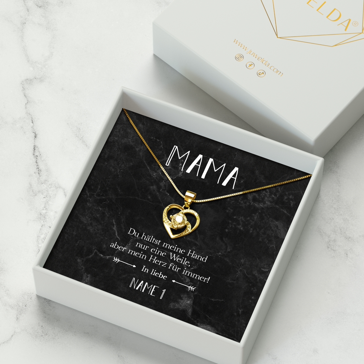 Unsere Karte „Für immer im Herzen“ wird mit bis zu 7 Namen personalisiert. Du hast die Möglichkeit, das Geschenk mit Deinen Geschwistern gemeinsam zu verschenken. Wähle einfach die Anzahl der Namen aus und trage diese in das dafür vorgesehene Feld ein. Wir liefern Dir eine Halskette aus 925 Sterling Silber und Deine personalisierte Karte in einer schönen Schmuckbox.