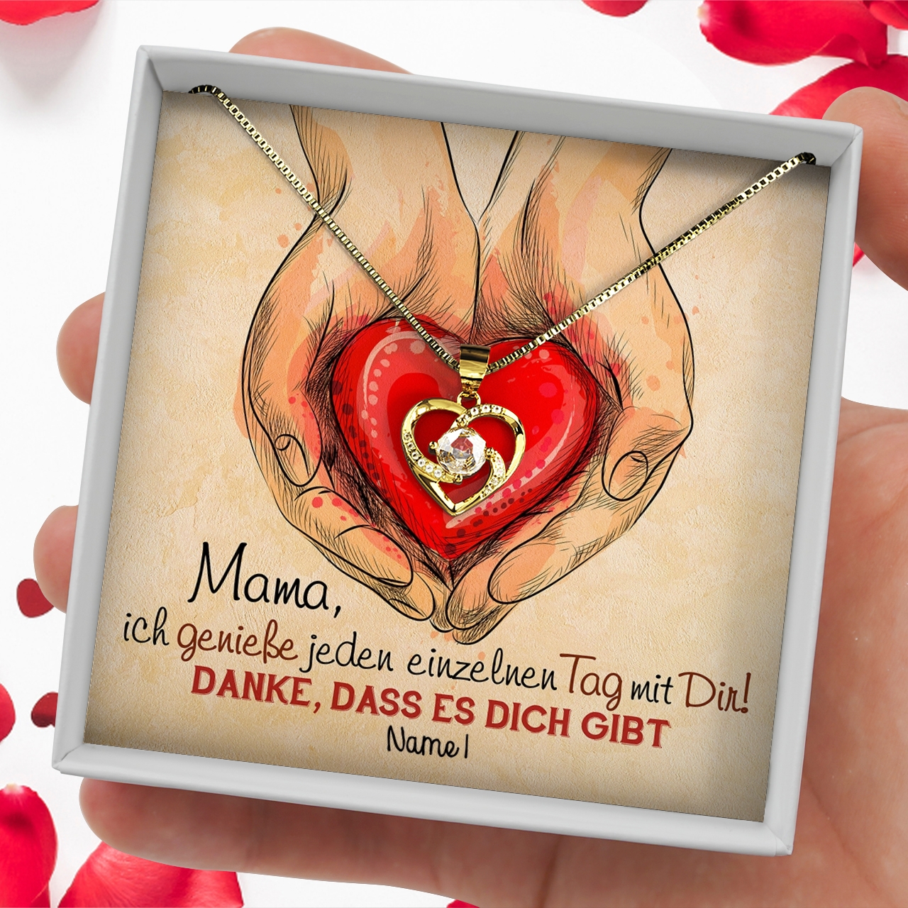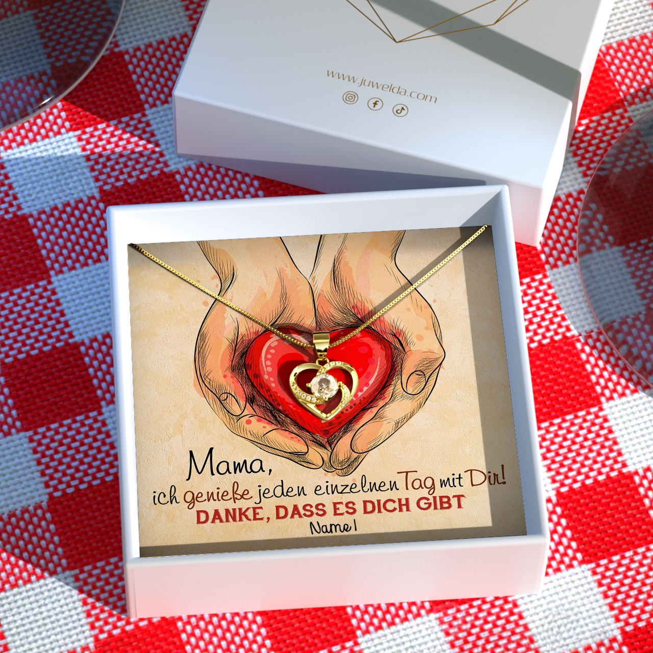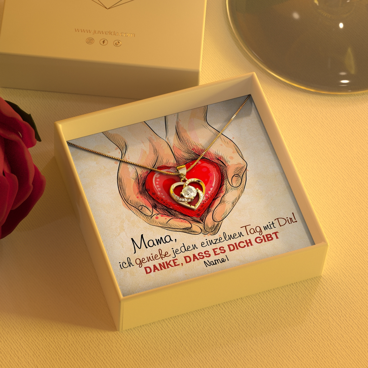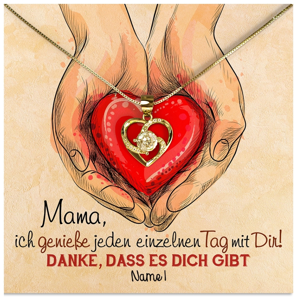 Mama ist immer für Dich da und geht mir Dir durch dick und dünn? Dann ist es an der Zeit, sie in diesem Jahr zum Muttertag mit mehr als nur einem Strauß Blumen zu überraschen. Unsere personalisierbare Karte zum Muttertag kann mit einem oder mehreren Namen gestaltet werden. Sie zeigt ein gezeichnetes Herz, das in zwei Händen gehalten wird. Sie symbolisiert, wie wichtig Deine Mama in Deinem Leben ist. Zu der Karte suchst Du aus unserer exklusiven Kollektion ein Schmuckstück aus, das sie für immer genießen kann.