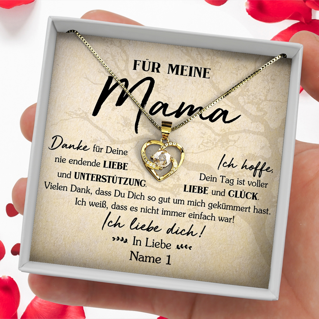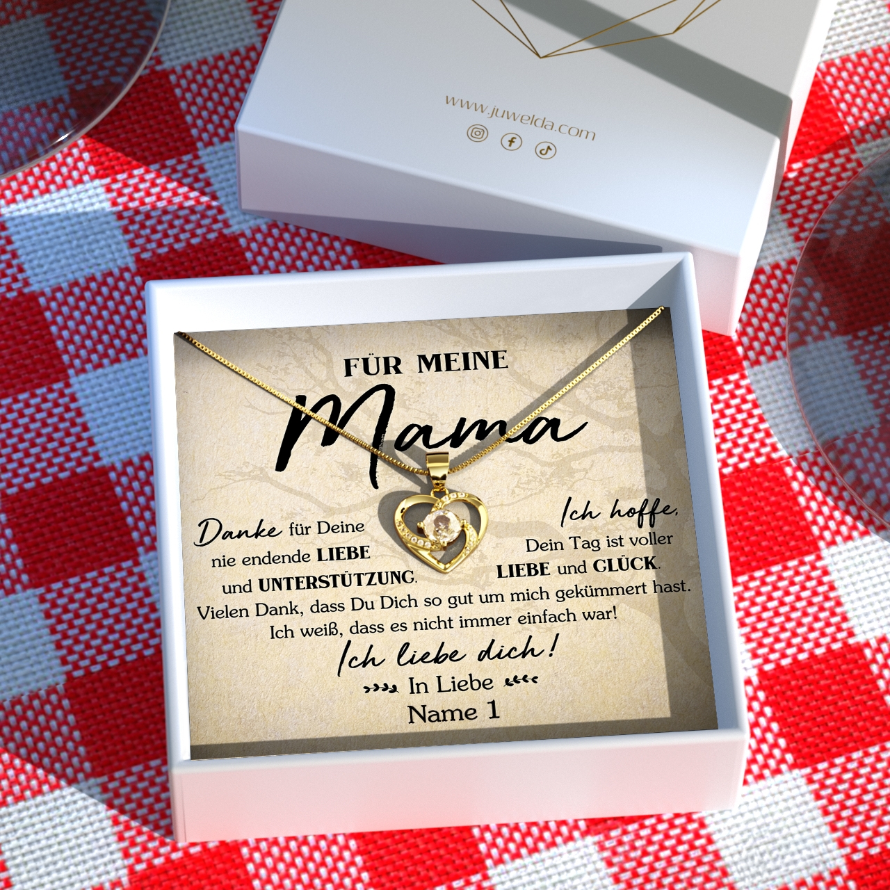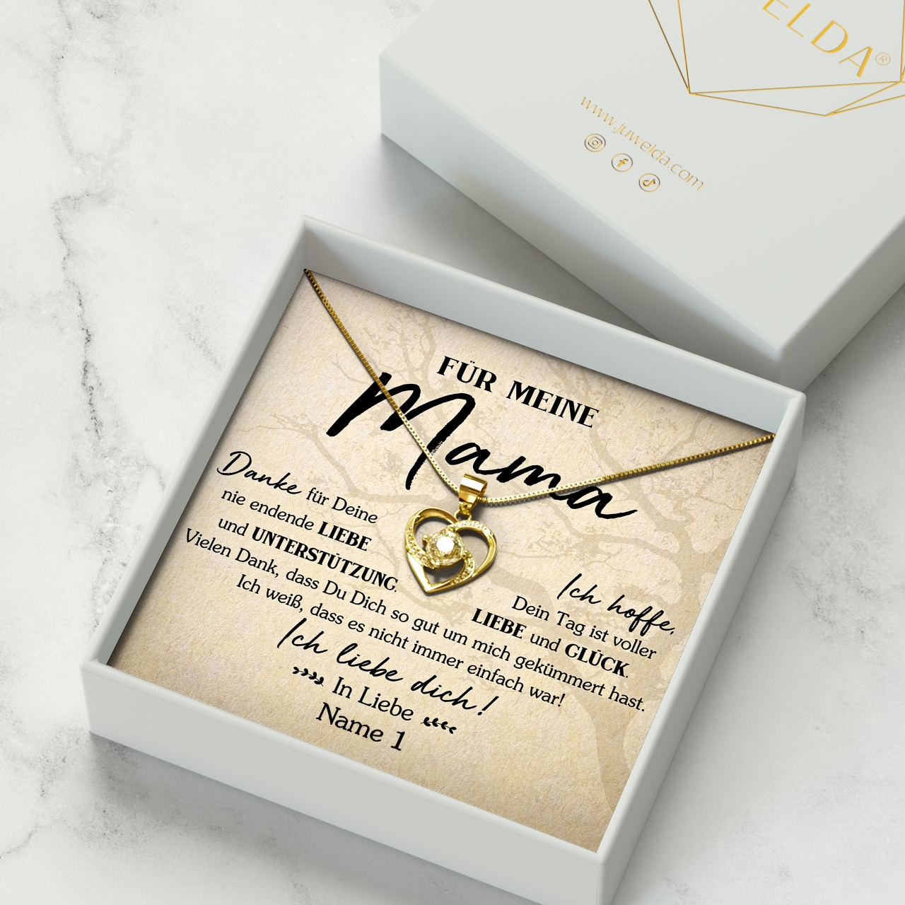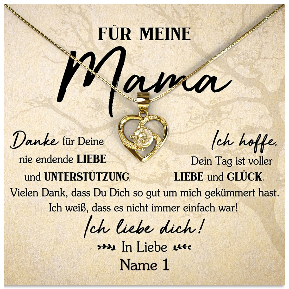 Mama ist das Herz einer jeden Familie. Sie kümmert sich um alles und unterstützt mit ihrer nie endenden Liebe. Möchtest Du Dich gerne bei Deiner Mutter bedanken? In wenigen Schritten kannst Du Dein individuelles Geschenk kreieren. Wähle eine funkelnde Halskette Deiner Wahl, trage Deine Namen in das dafür vorgesehene Feld ein und suche einen passenden Spruch aus. Nachdem Du auf den „Vorschau anzeigen“ Button geklickt hast, kannst Du Dein ganz persönliches Geschenk betrachten.
