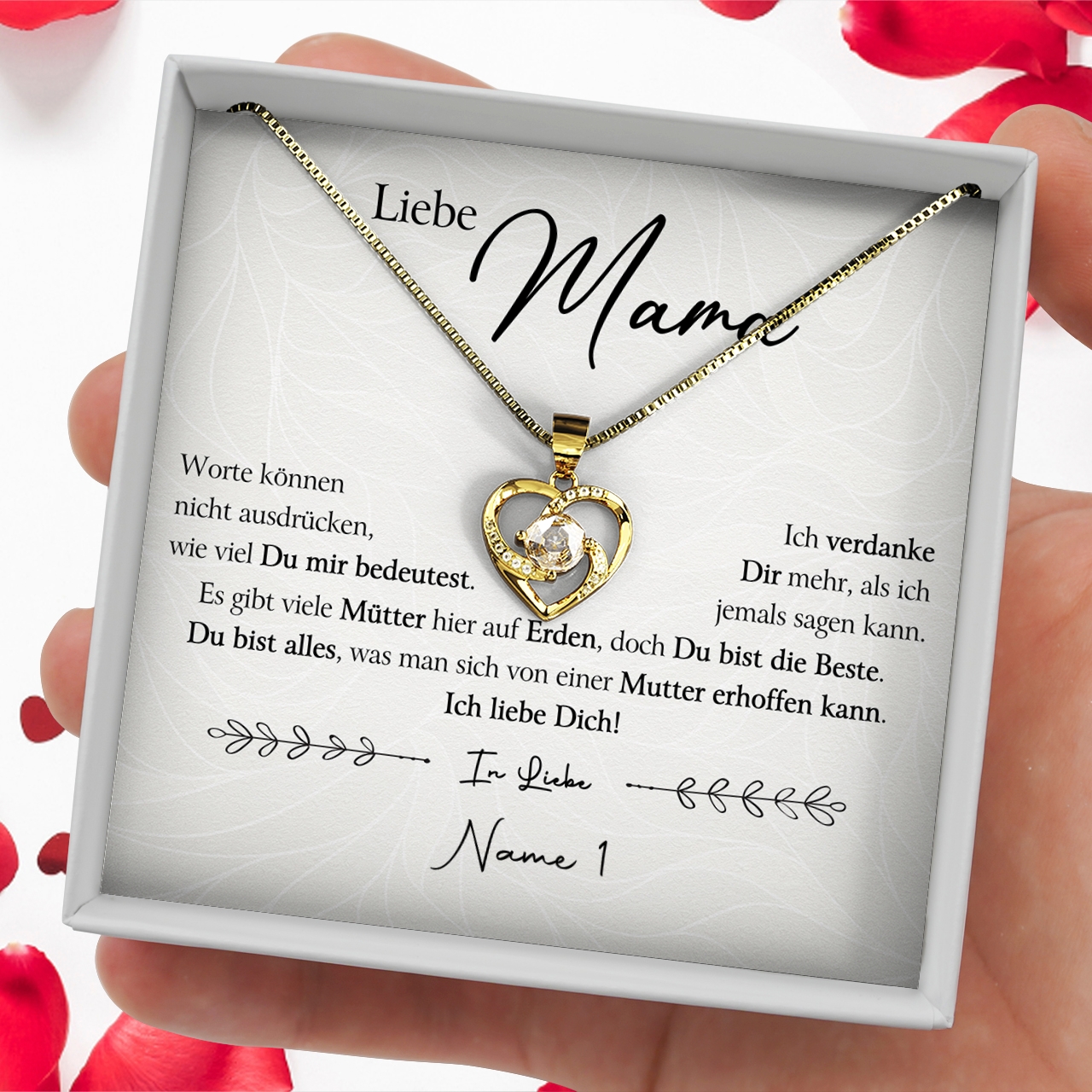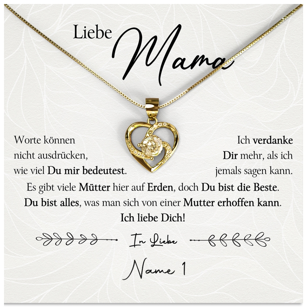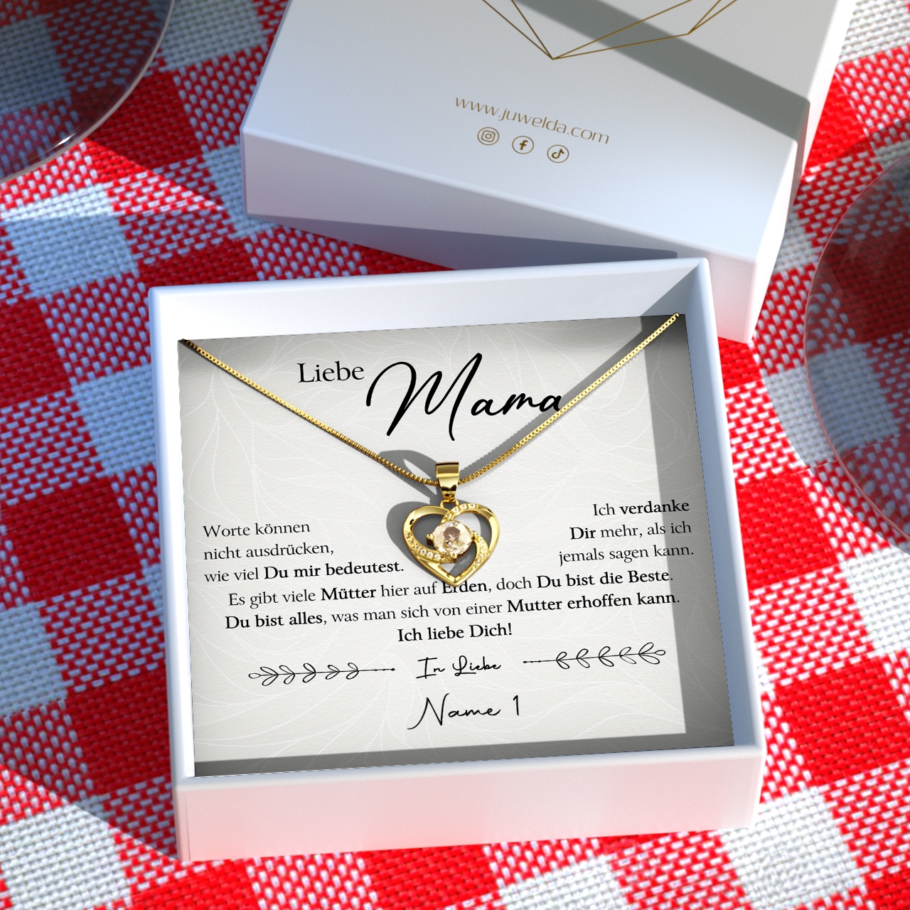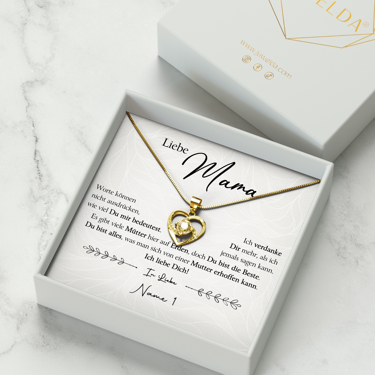 Für jede Situation, in der Du einen Rat brauchst, hat Deine Mutter die richtigen Worte für Dich. Du bist Dir nicht sicher, wie Du Dich für diese Hilfe bedanken sollst und suchst noch nach einem passenden Geschenk? Mit unserer personalisierbaren Karte „Liebevolle Mutter“ kannst Du Dich für all die Ratschläge bei der besten Mutter der Welt bedanken. Du musst Dich nur für eine unserer wunderschönen Halsketten mit Anhänger aus 925 Sterling Silber entscheiden und Deinen Namen in das dafür vorgesehene Feld eintragen. Schon kannst Du Dir eine Live-Vorschau generieren und Dein perfektes Geschenk anschauen.