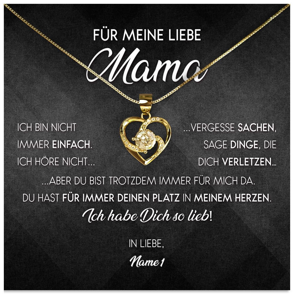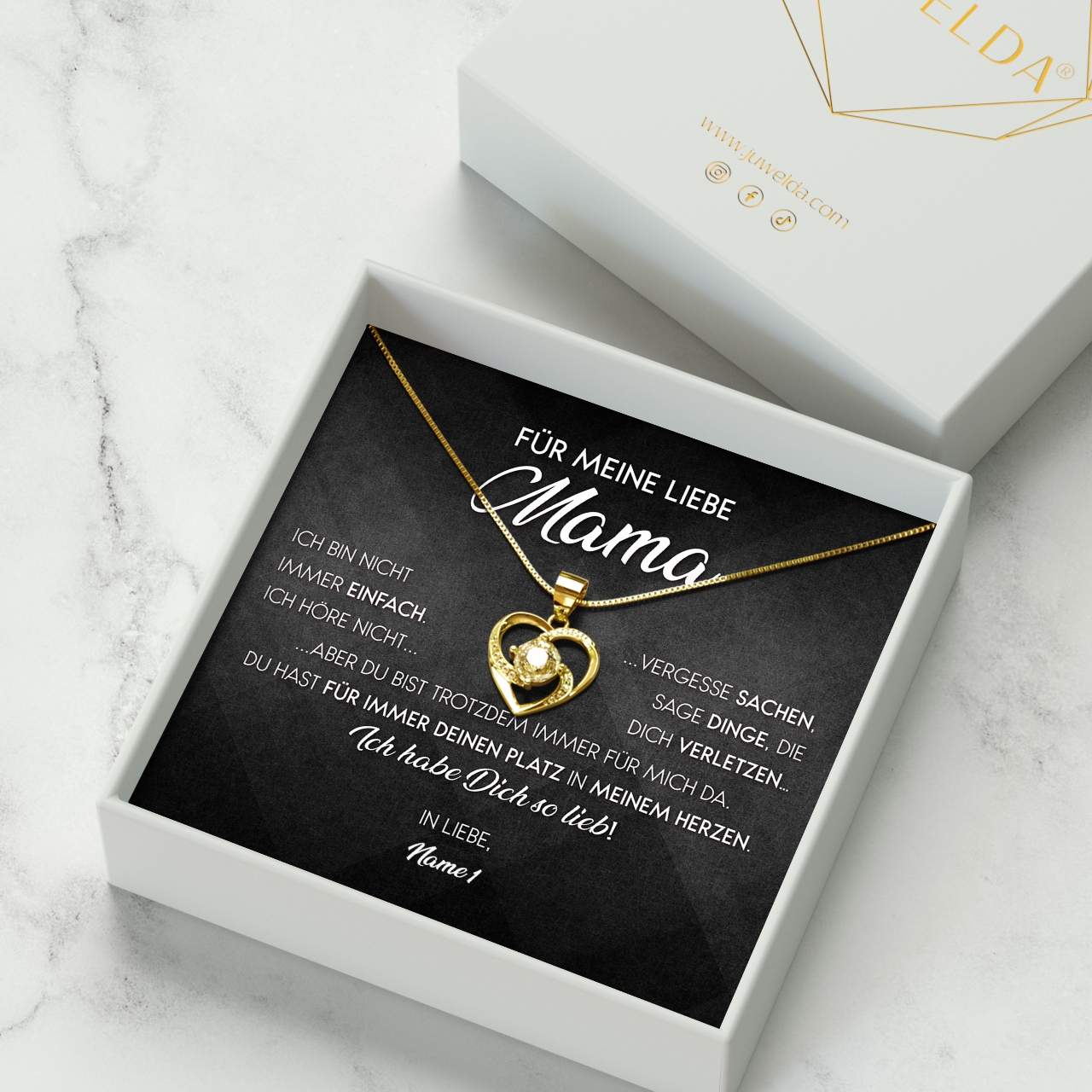 Du möchtest, dass Deine Mama vor Freude strahlt und sich riesig freut? Dann überrasche Sie mit einer eleganten Halskette und der personalisierten Karte „Nicht immer einfach“. Du musst nur Deine Wunschnamen in das Personalisierungsfeld eintragen und kannst Deine ganz persönliche Karte mit Deinem ausgewählten Spruch in der Live-Vorschau betrachten. Gefällt Dir die Live-Vorschau? Dann musst Du nur Deine gewünschte Zahlungsmethode wählen und auf „Jetzt Kaufen“ klicken. Während Du Dich entspannt zurücklehnen kannst, übernehmen wir die Arbeit und fertigen Dein individuelles Geschenk für Dich an.