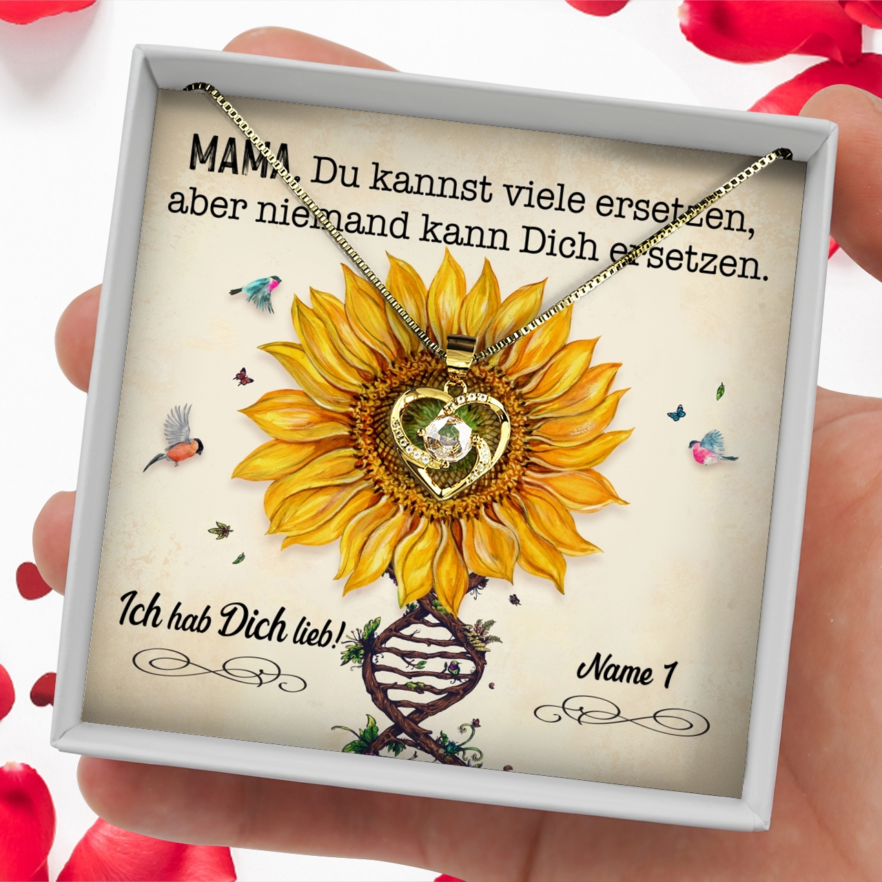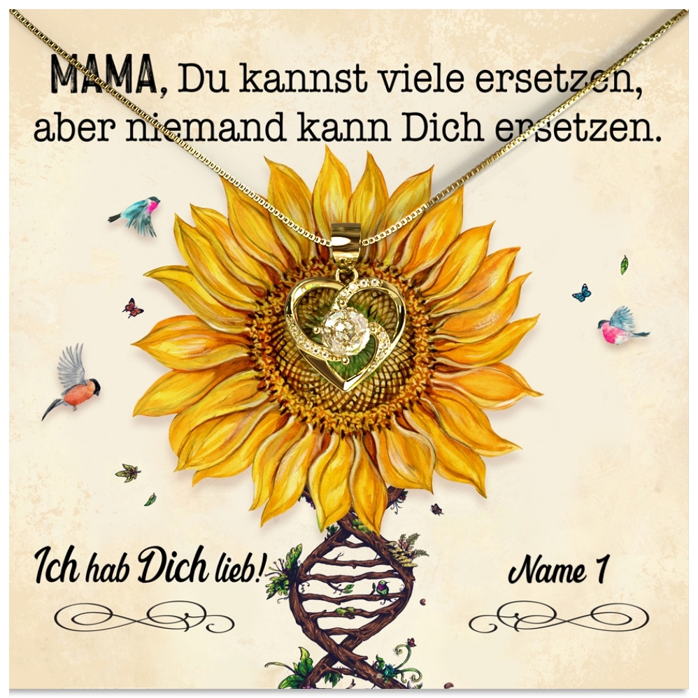 Du möchtest in diesem Jahr für den Muttertag mehr als nur einen Strauß Blumen überreichen. Dann entscheide Dich für eines unserer wunderbaren Schmuckstücke und diese herzliche, personalisierbare Grußkarte. Die große Sonnenblume in der Kartenmitte bringt sofort gute Laune. Die schönen Worte machen deutlich, dass Deine Mama nur das Beste verdient hat. Das Kartendesign kann mit Deinem Namen und den Namen von den Geschwistern individuell angepasst werden.