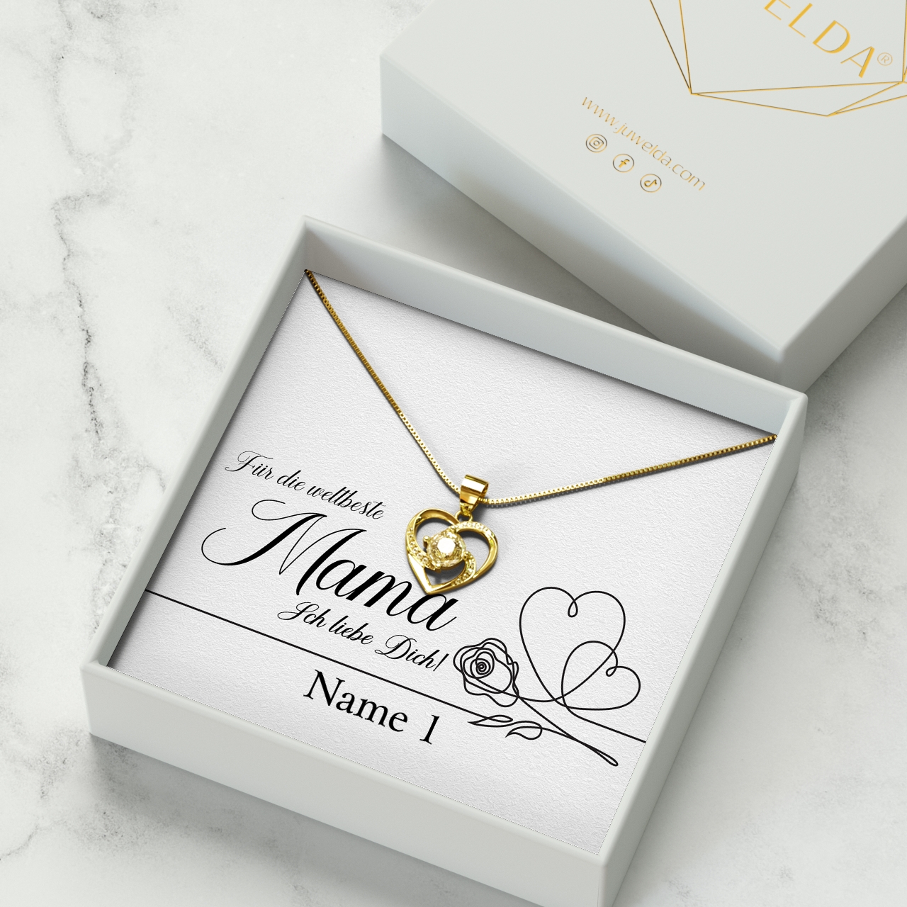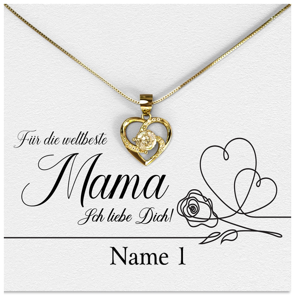 Deine Mutter ist die beste Mama auf der ganzen Welt? Du bist wieder auf der Suche nach einem passenden Geschenk und bist Dir nicht sicher, was Du Deiner Mama schenken sollst? Mit einer eleganten Halskette und der personalisierten Karte „Weltbeste Mama“ überreichst Du Deiner Mama ein Geschenk, welches sie sich mehr als verdient hat. Die Karte überzeugt mit ihren liebevollen Details und Deinem ganz persönlichen Namen. Möchtest Du das Geschenk mit Deinen Geschwistern verschenken? Kein Problem! Du kannst die Anzahl der Namen auswählen, Deine Wunschnamen eintragen und anschließend Deine personalisierte Karte in der Live-Vorschau betrachten.