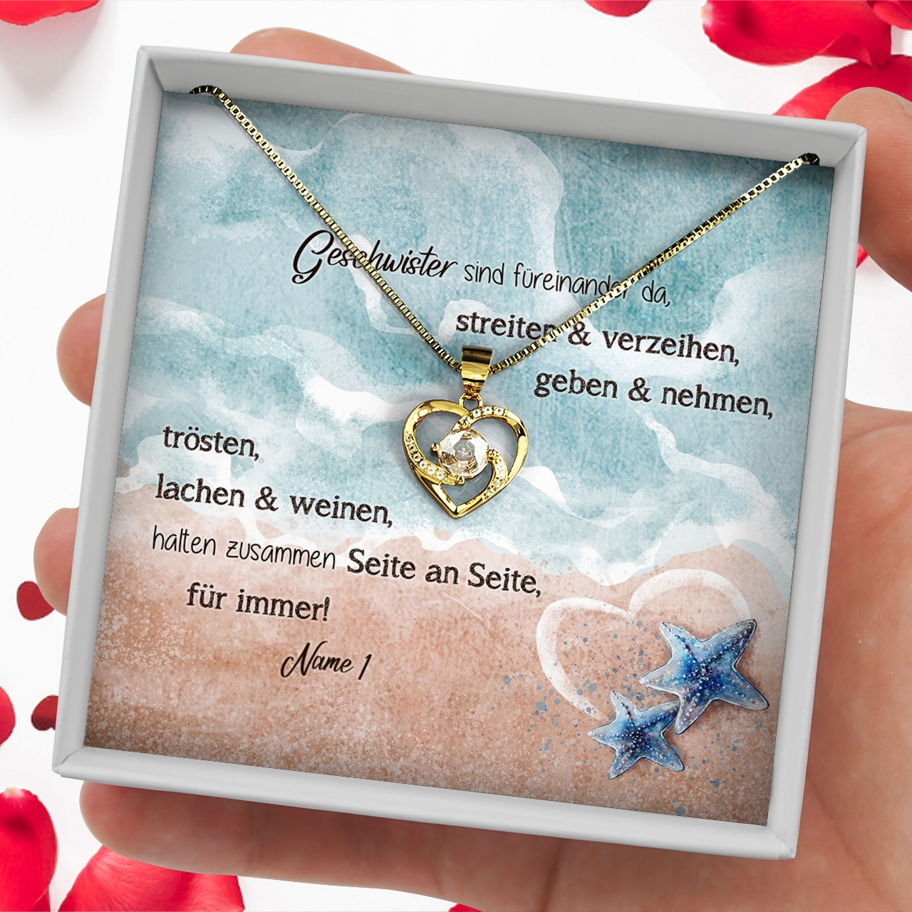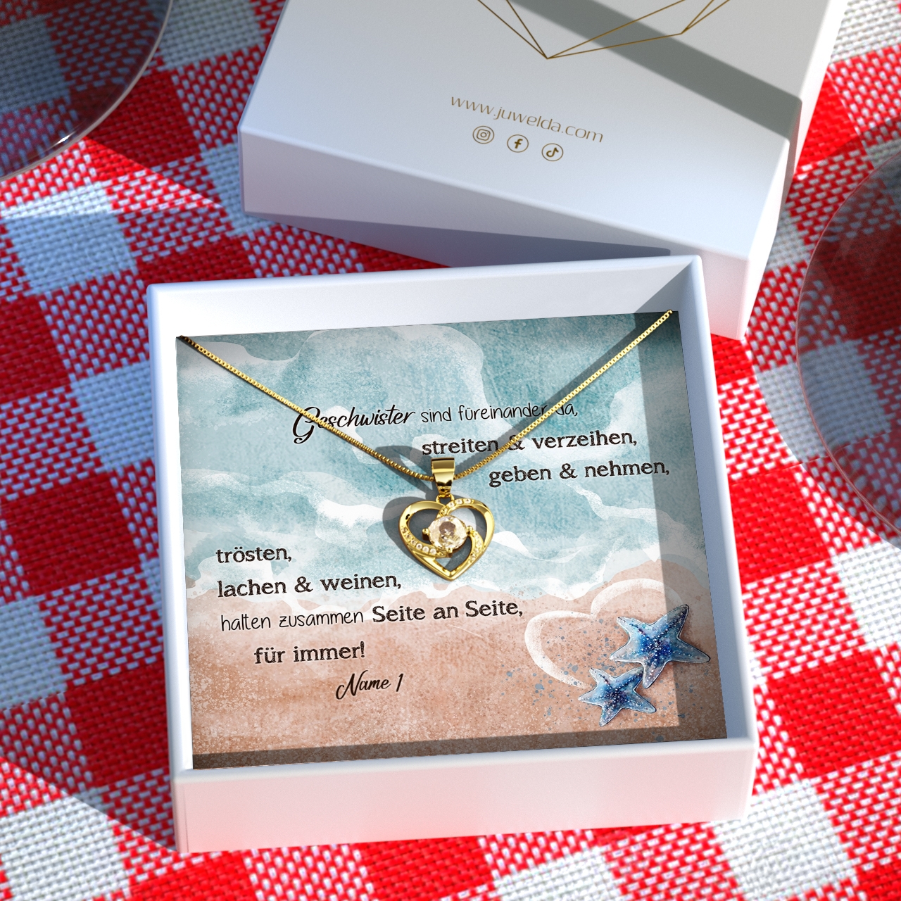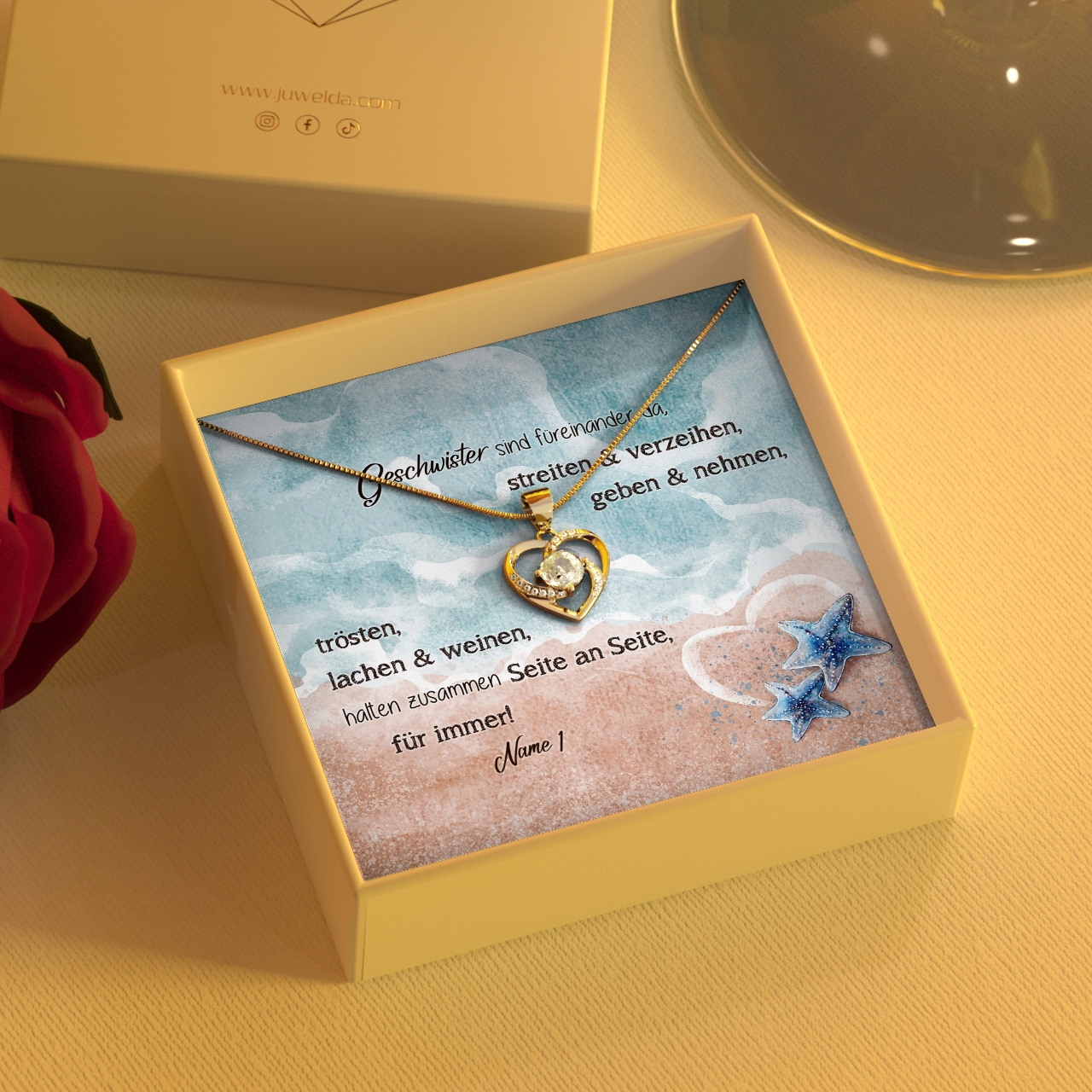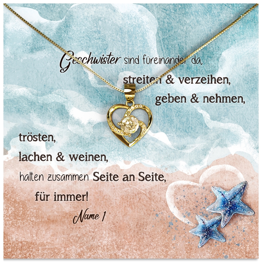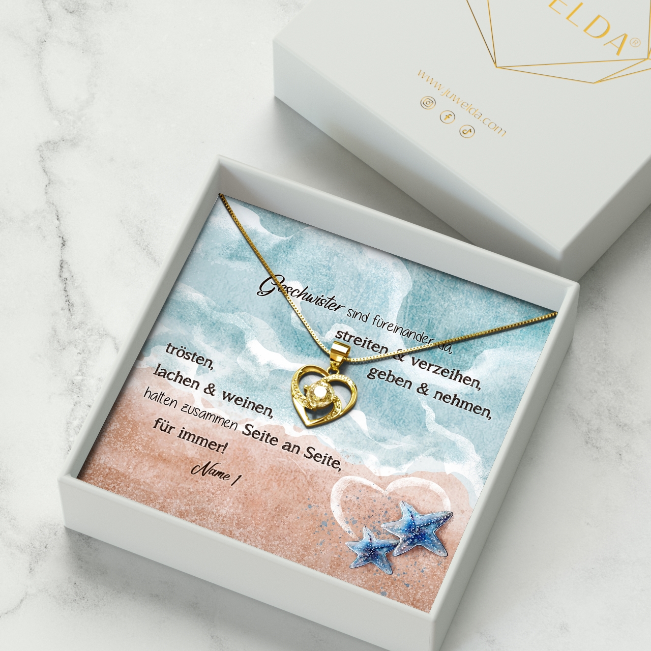 Deine Schwester ist ein echter Engel? Sie ist für Dich da, wenn Du sie brauchst und es ist ganz einfach an der Zeit, ihr zu zeigen, was sie Dir bedeutet? Finde in unserem Sortiment ein Schmuckstück für sie und überreiche es zusammen mit dieser schönen personalisierbaren Grußkarte. Das Motiv „Geschwister halten zusammen“ lässt sich mit Euren Namen und auch den Namen weiterer Geschwister personalisieren. Ein ideales Geschenk für Deine Schwester.