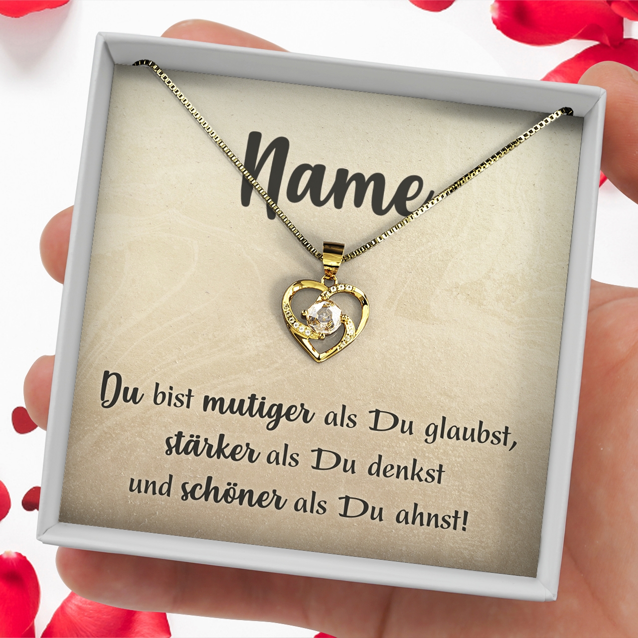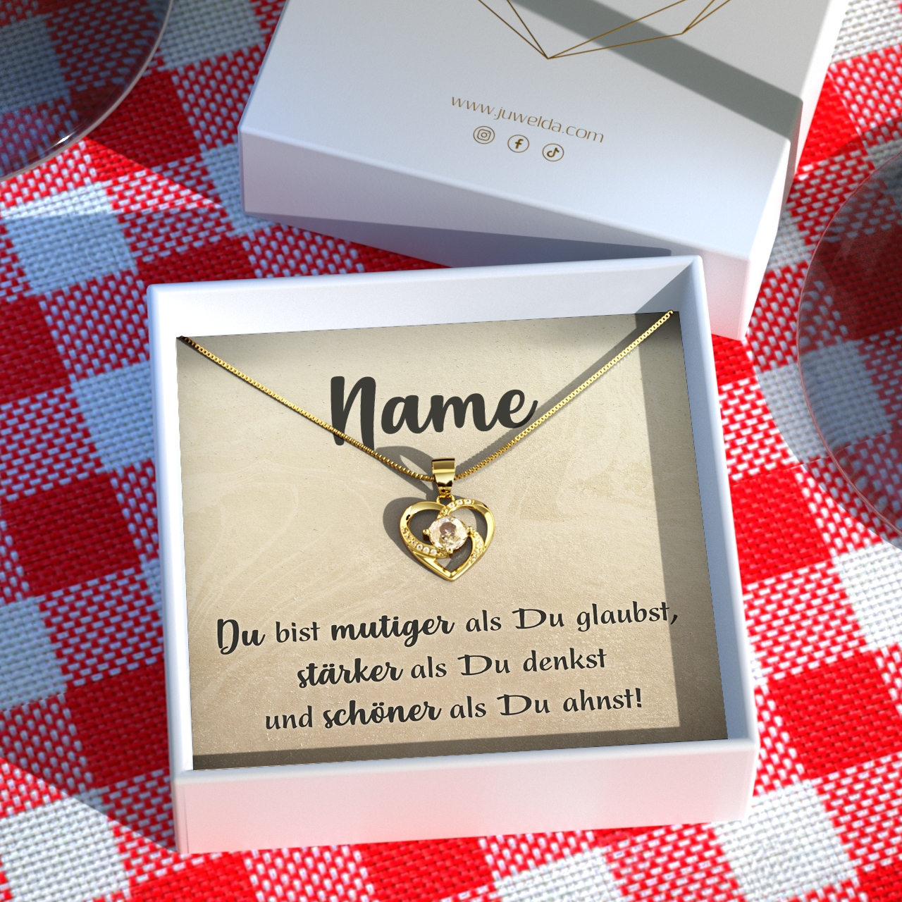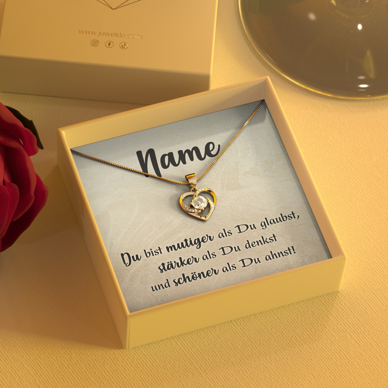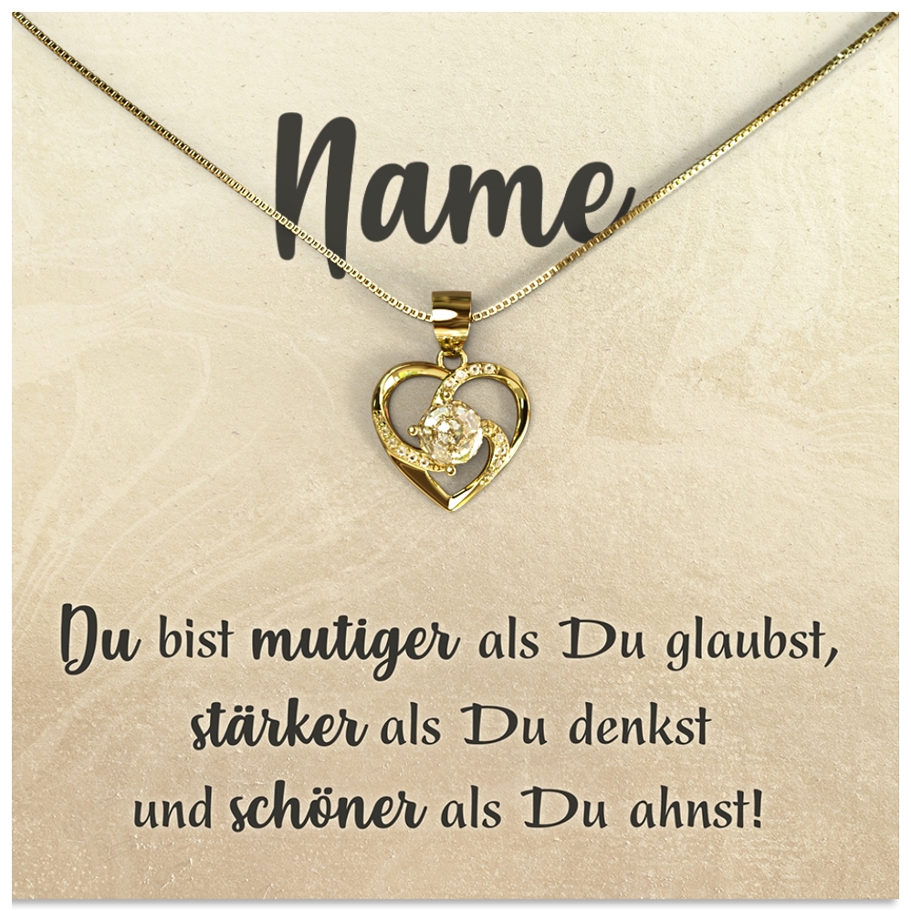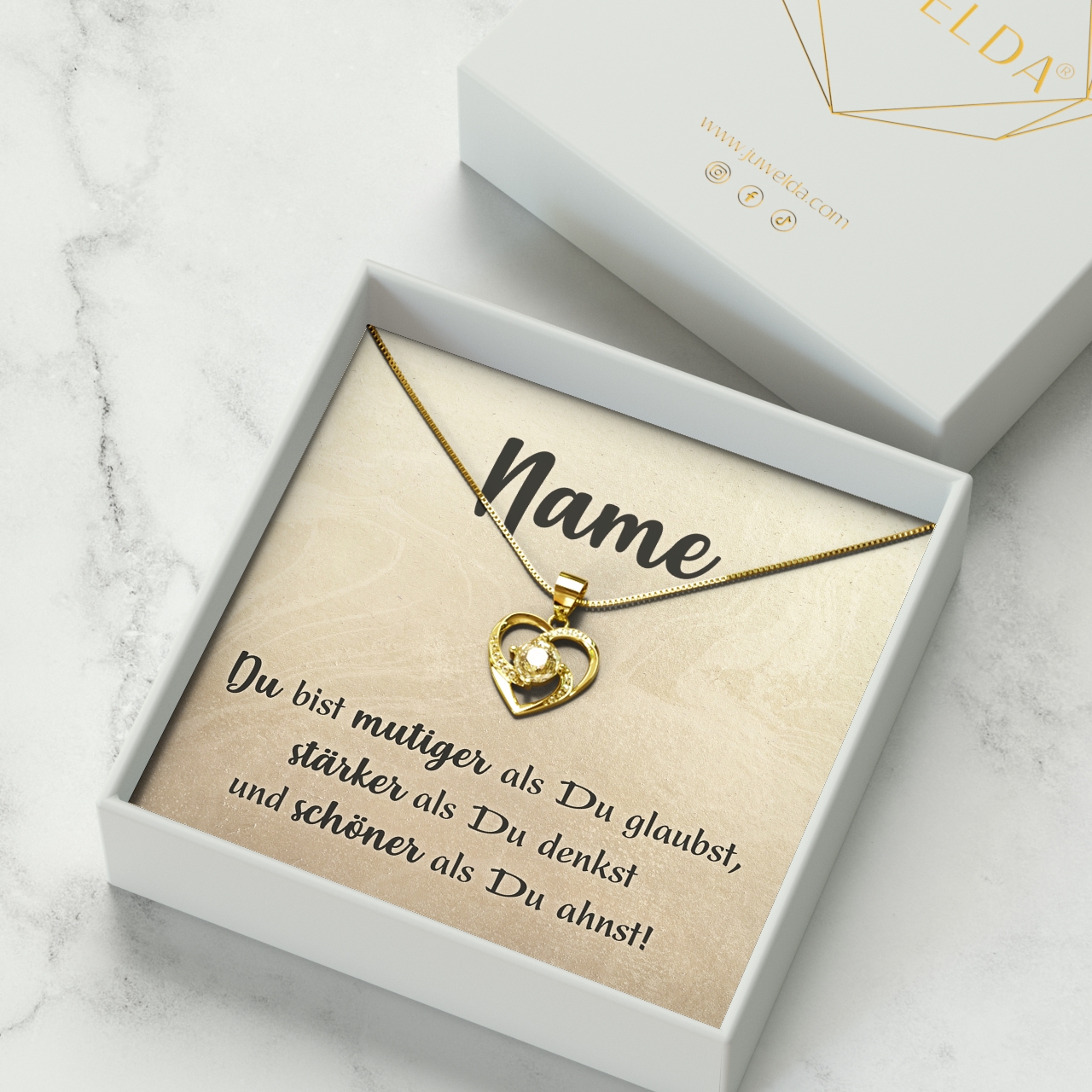 Du möchtest Deiner Tochter ein persönliches Geschenk überreichen, das für viel Freude sorgen wird – ihr sagen, wie toll sie ist und wie stolz du darauf bist, so eine mutige, intelligente und herzliche Tochter zu haben? Dann ist das Kartenmotiv „Mutiger, stärker, schöner“ die schönste Art, ihr eine große Überraschung zu bereiten. Das Kartenmotiv bezaubert mit seinem schlichten Design in beiger Marmoroptik. Das liebevolle Zitat sticht sofort ins Auge und sorgt garantiert für die ein oder andere Freudenträne. Personalisiere die emotionale Grußkarte mit dem Namen Deiner Tochter und kreiere so ein persönliches Geschenk, das es nur einmal auf der Welt gibt. Mit der von Dir ausgewählten Halskette machst Du die Überraschung komplett. Beim Tragen dieser Kette wird sich Deine Tochter immer wieder an diesem wundervollen Überraschungsmoment erinnern.