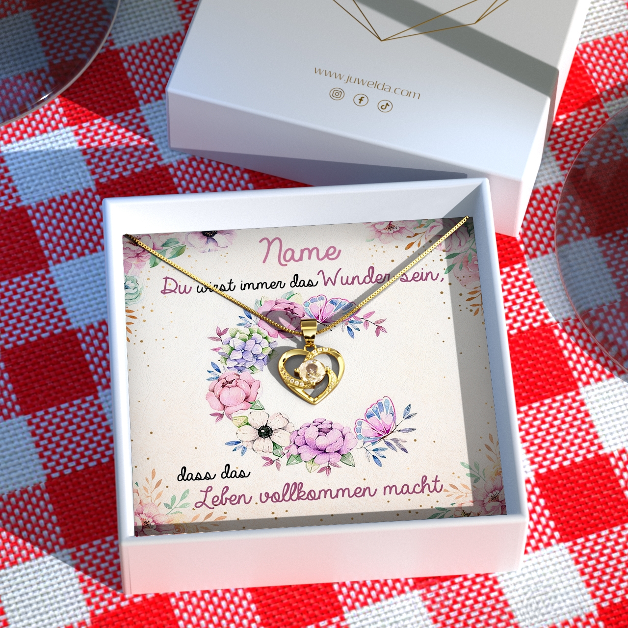 Die Beziehung zwischen Mutter und Tochter ist besonders kostbar. Kaum jemand ist Dir so nahe und wichtig wie Deine Tochter. Deshalb ist es nur passend, dass Du ihr ein ganz besonderes Geschenk mit einem wunderschönen Schmuckstück überreichst. Diese personalisierbare Grußkarte ist in einem verspielten Design gehalten. Die schönen Blumen im Aquarell-Stil sind filigran und voller Leben zugleich. Personalisiere die Geschenkbox mit den Namen Deiner Tochter. Das fertige Design kannst Du Dir dafür vor der endgültigen Bestellung in der Live-Vorschau ansehen.