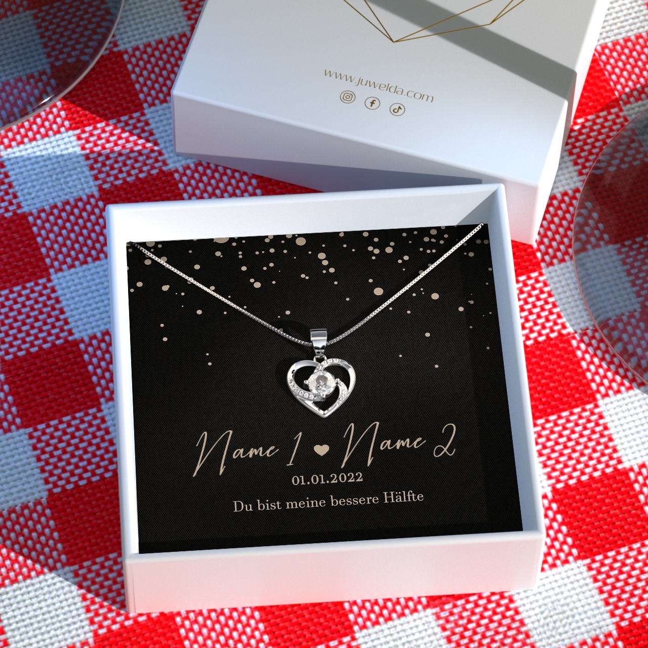 Überrasche Deinen Schatz mit einem ganz besonderen Präsent – ein persönliches Geschenk, das Deinen Gefühlen Ausdruck verleiht! Das Kartendesign „Zwei Herzen für immer“ besticht mit seinem schlichten Design und seiner romantischen Aussagekraft. Personalisiere die romantische Grußkarte mit Euren Namen und Eurem Jahrestag und kreiere zusammen mit dem hochwertigen Schmuckstück Deiner Wahl ein individuelles Geschenk-Set, das von tiefsten Herzen kommt. Mit diesem Geschenk zeigst Du Deinem Liebling, wie sehr Du sie schätzt und wie unendlich Deine Liebe zu ihr ist. Dieses Präsent wird das Herz Deines Schatzes garantiert höherschlagen lassen.