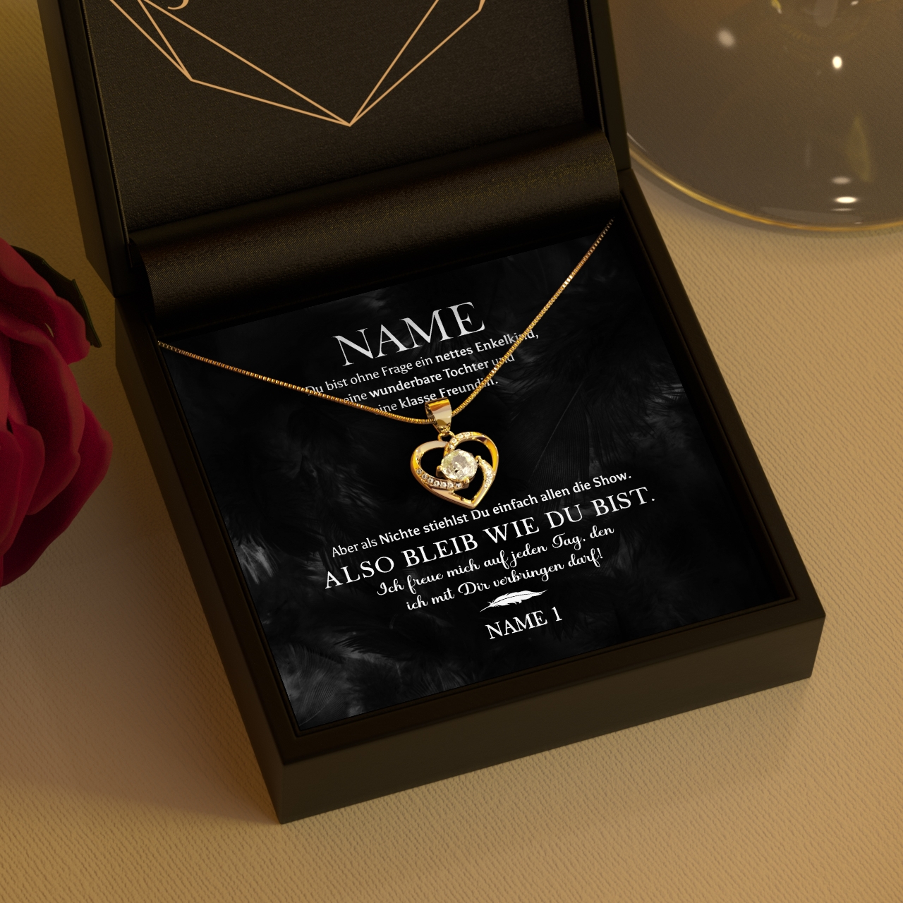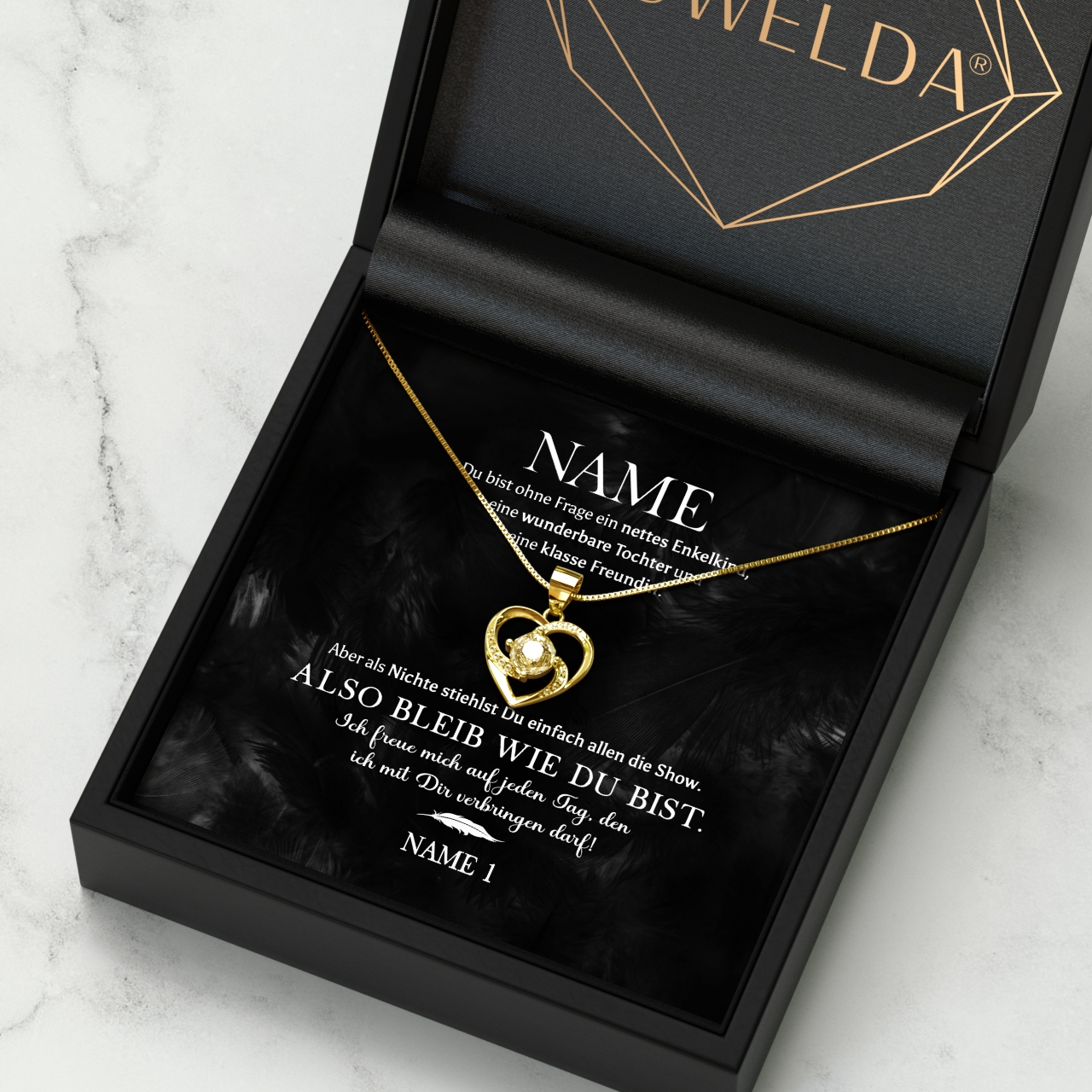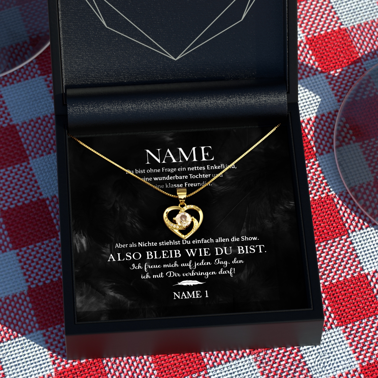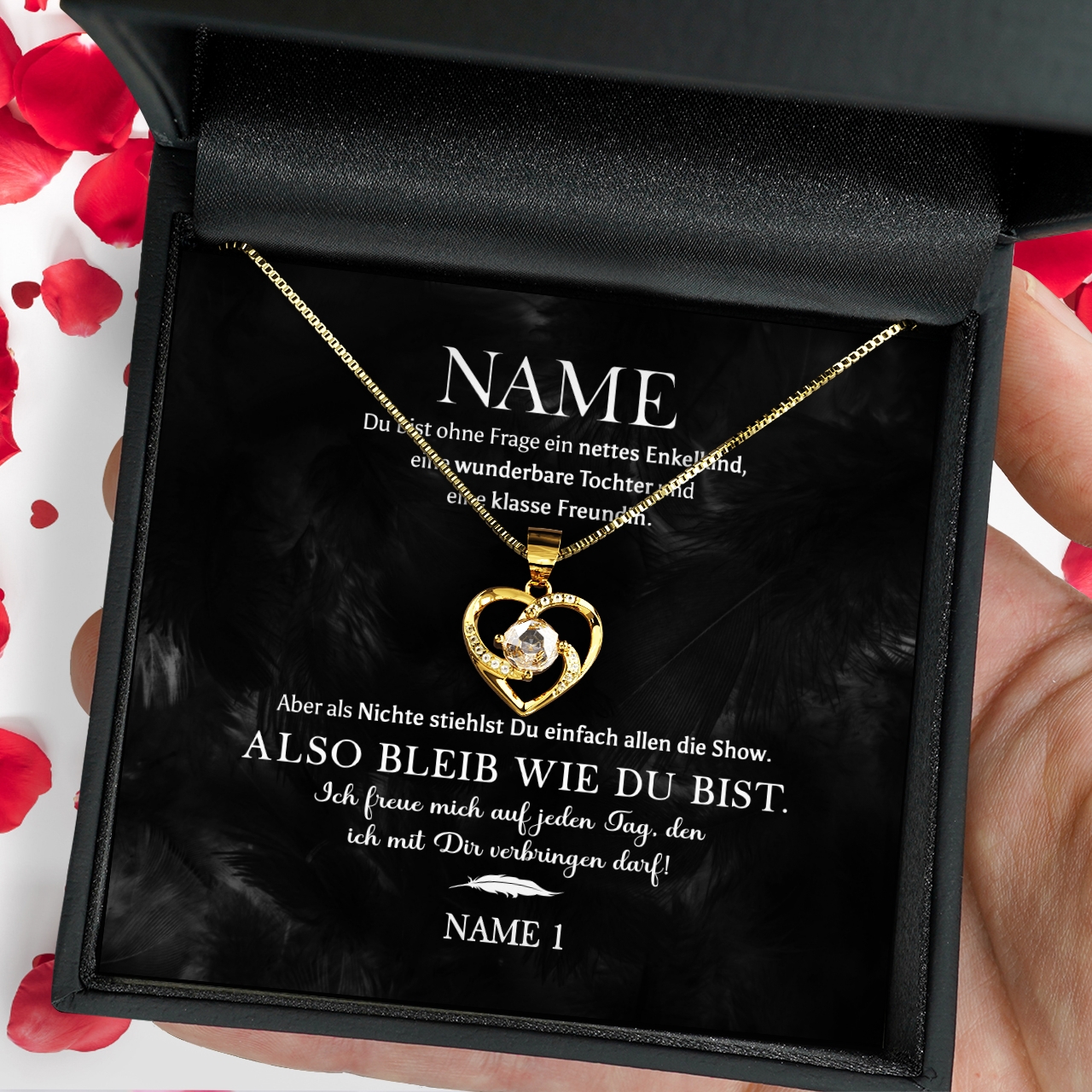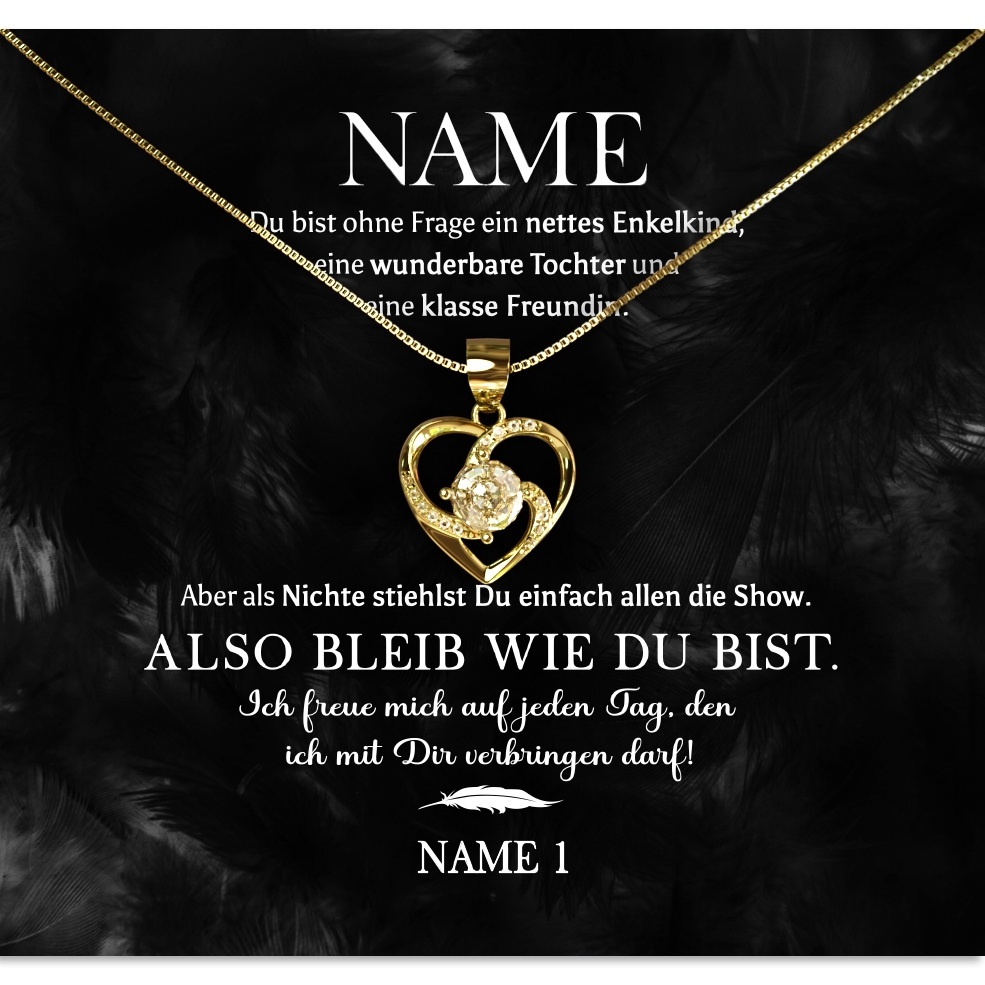 Du suchst ein Geschenk für Deine Nichte? Dann ist unsere Halskette aus 925 Sterling Silber genau das Richtige! Die Grußkarte ist personalisiert mit Deinem Namen und dem Namen Deiner Nichte. Auf der Grußkarte ist Deine persönliche Botschaft niedergeschrieben. Mit dem Konfigurator kannst Du ganz einfach Deinen Namen und den Namen Deiner Nichte eintragen und in der Vorschau anschauen, wie die personalisierte Grußkarte aussieht. Wenn Du möchtest, kannst Du zusätzlich eine optionale Geschenkverpackung wählen. Wir verpacken die Halskette dann für Dich zu einem schönen Geschenk mit Seidenpapier, einer Geschenktasche und einer schönen Schleife.