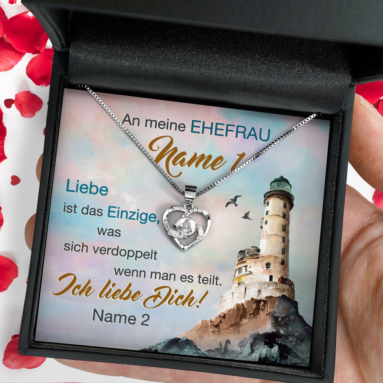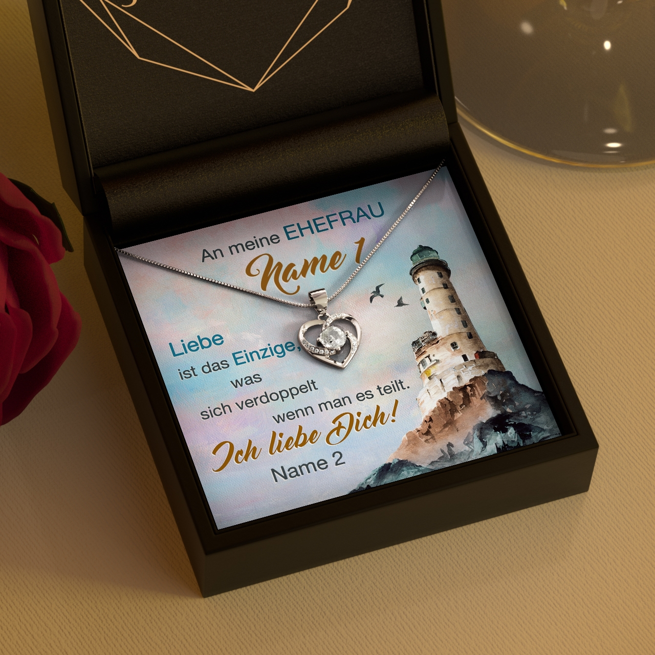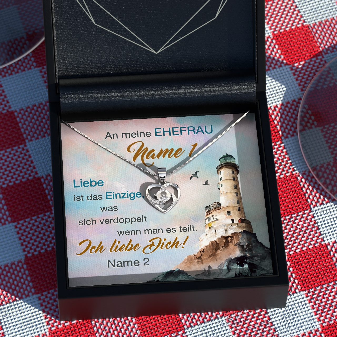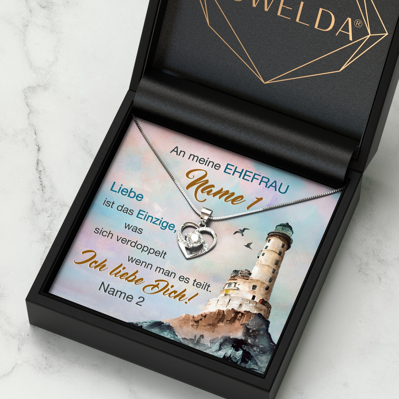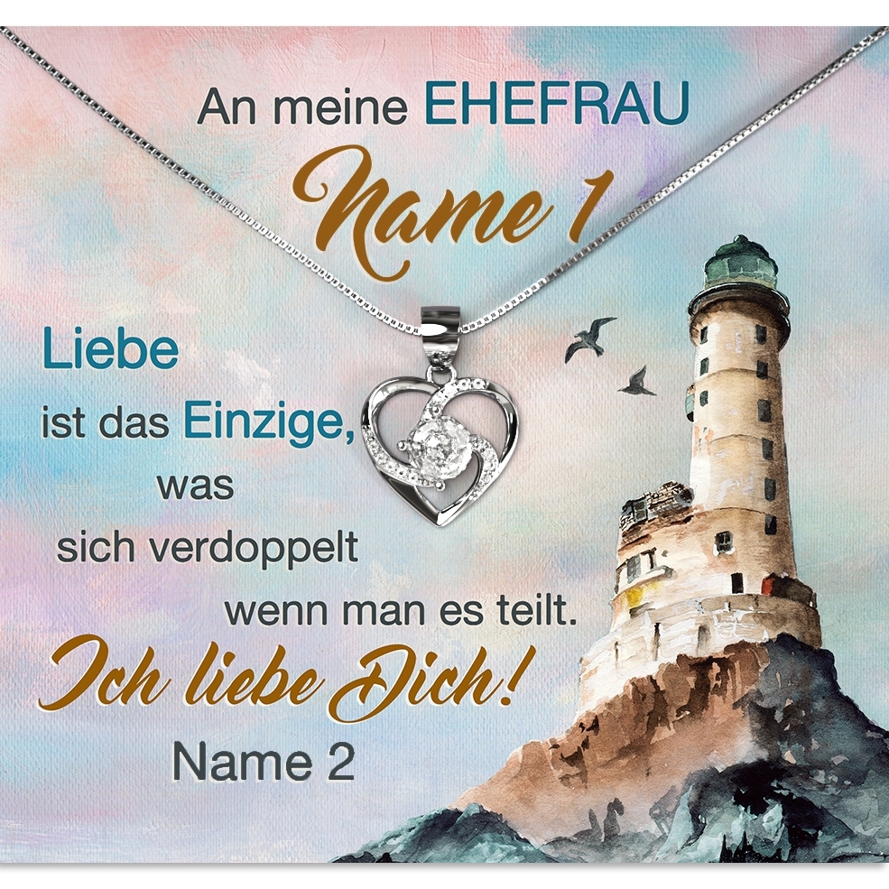 Wahre Liebe ist wie das helle Licht eines Leuchtturms – sie bringt Dich immer wieder sicher in den Hafen des Lebens. Zeige Deiner Frau, wie viel sie Dir bedeutet und beschenke sie mit unserer personalisierbaren Grußkarte im Leuchtturm-Design. Die Karte ist passend zu dem von Dir ausgewählten Schmuckgeschenk aus unserem Sortiment. Gib bei der Bestellung einfach den Namen Deiner Frau und Deinen Namen an. Wir zeigen Dir in der Live-Vorschau, wie das finale Design aussehen wird.