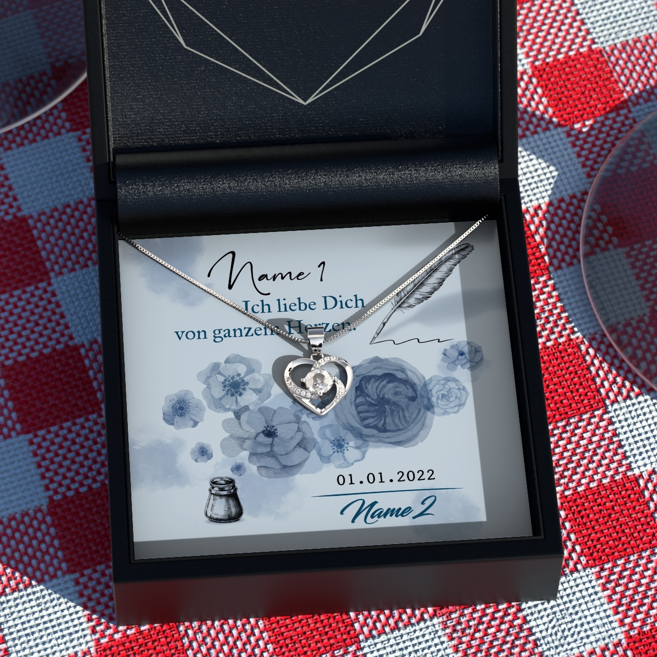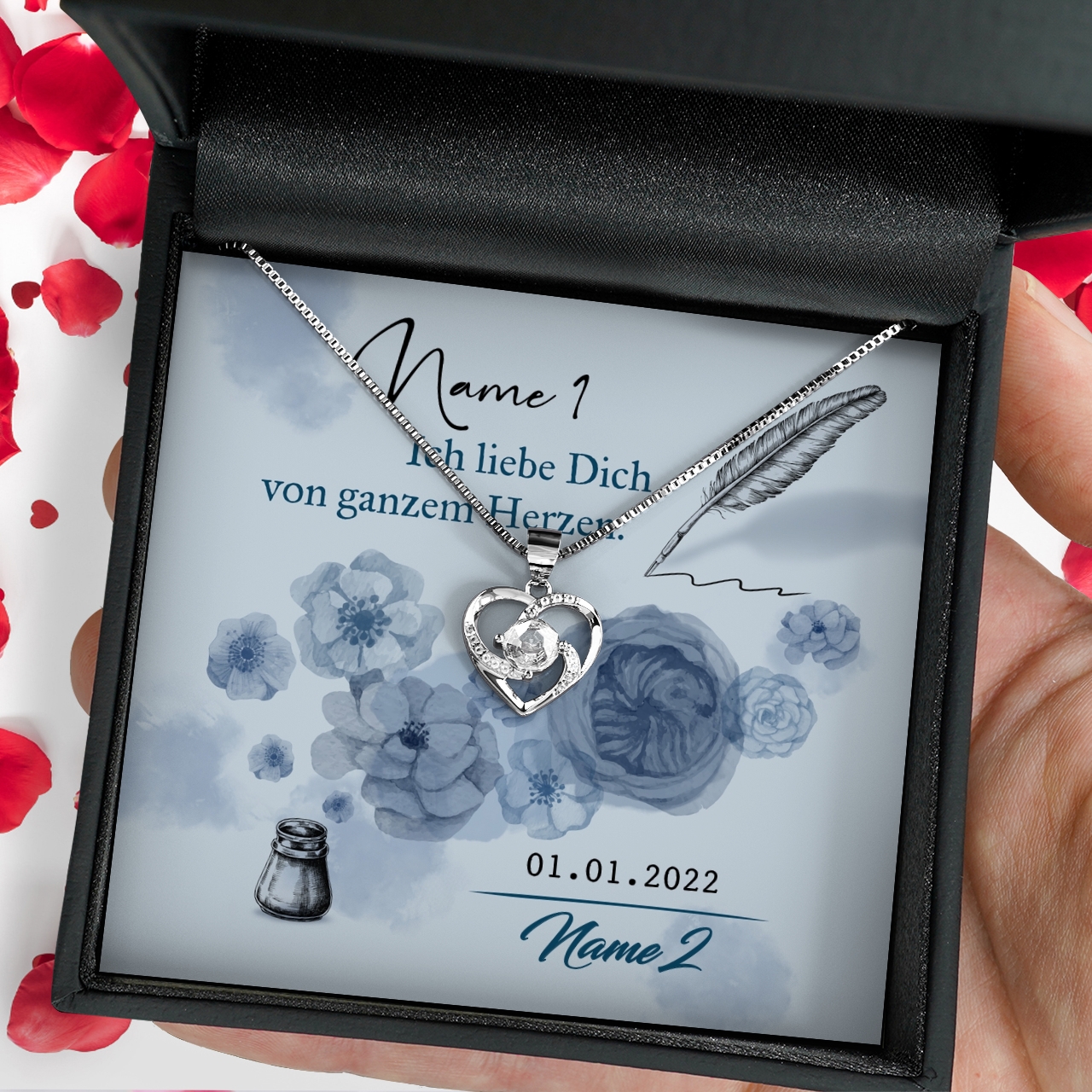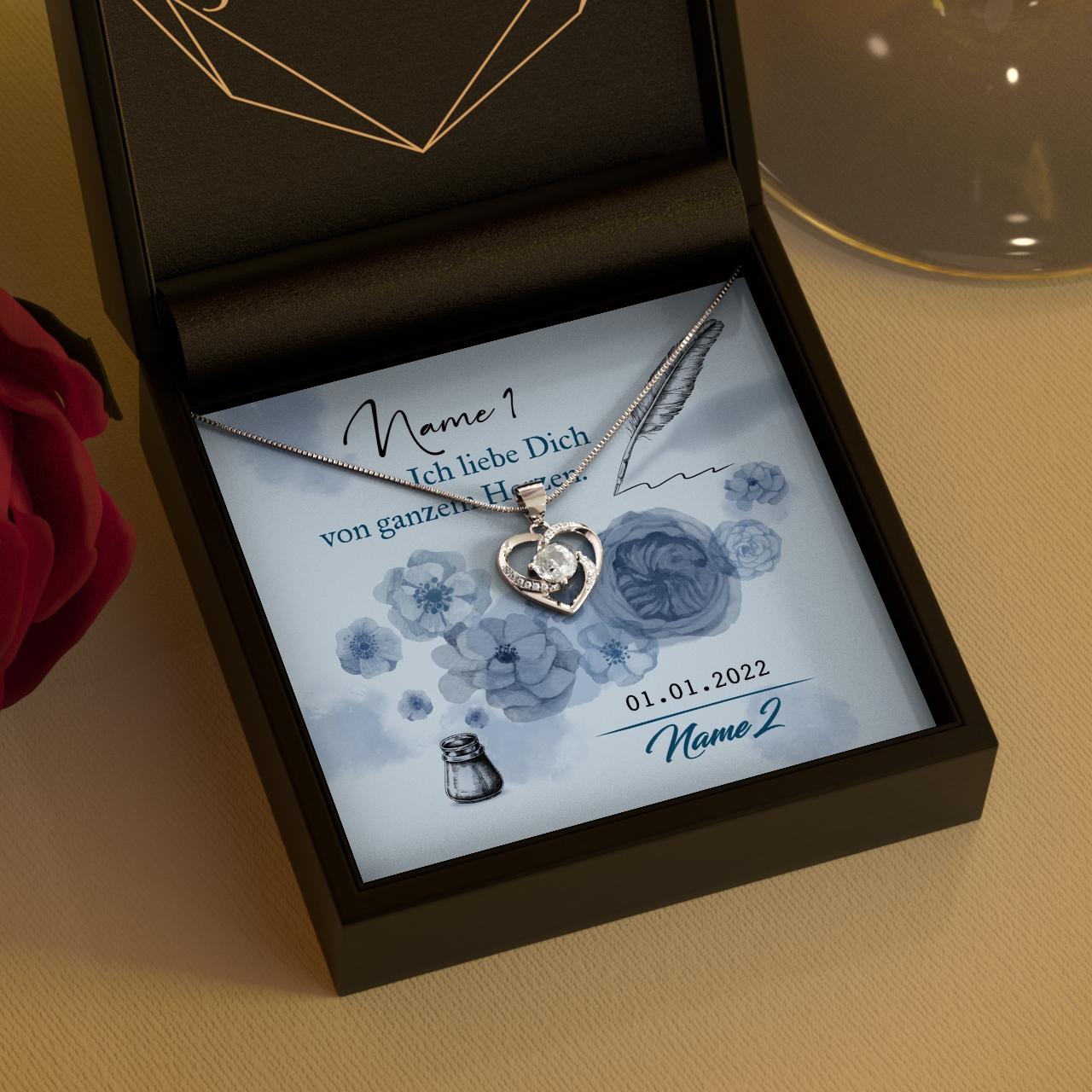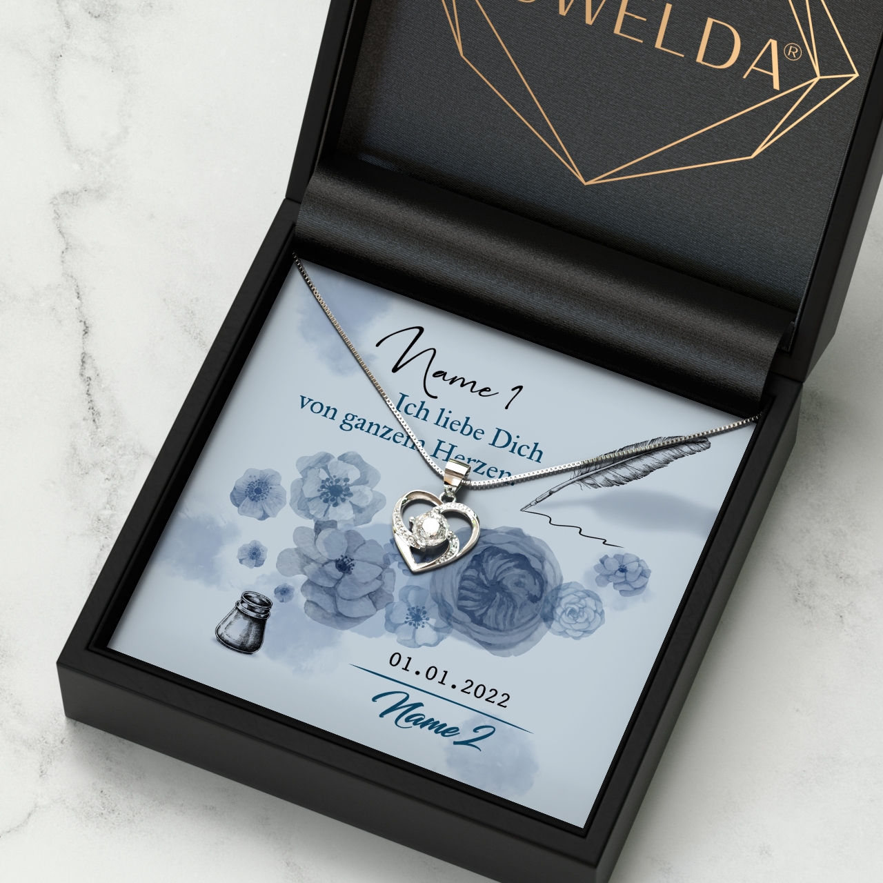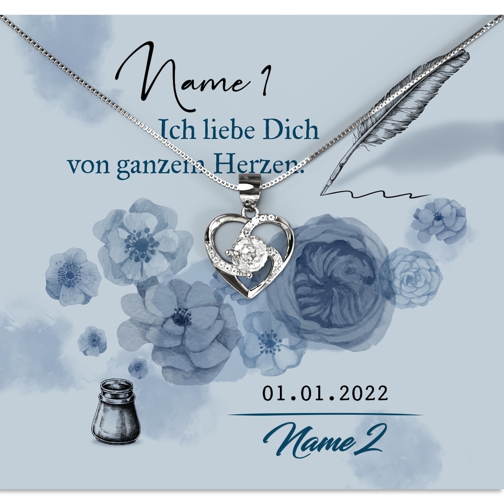 Du und Deine Frau feiern den ersten oder auch den 20. Hochzeitstag? Das ist immer ein Grund, sie mit einem sehr besonderen wie persönlichen Geschen zu beglücken. Bei uns erhältst Du wunderschöne Geschenk-Boxen mit einem edlen Schmuckstück und einer personalisierbaren Grußkarte. Das „Von ganzem Herzen“ Design ziert ein romantischer Spruch und Blumen in Pastellblau, die im Aquarell-Stil gehalten sind. Der Name Deiner Frau wird in Federschreibschrift aufgedruckt und wirkt so besonders filigran.