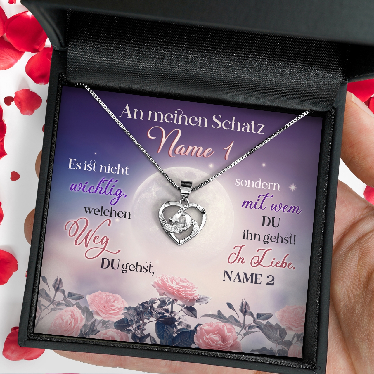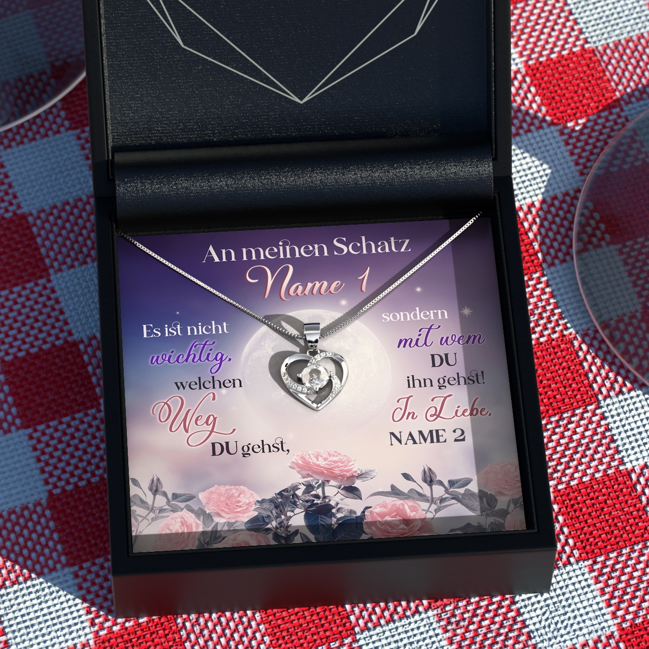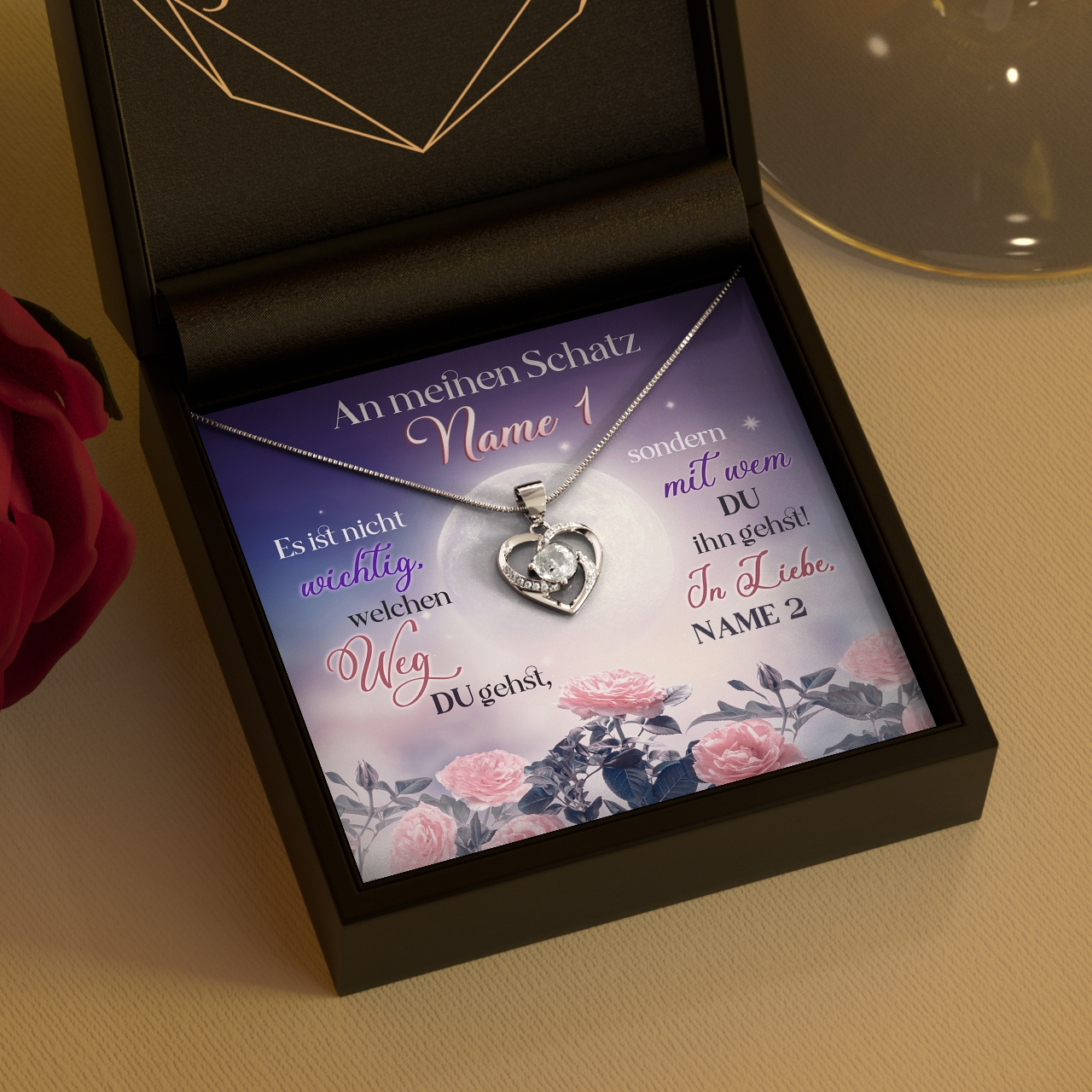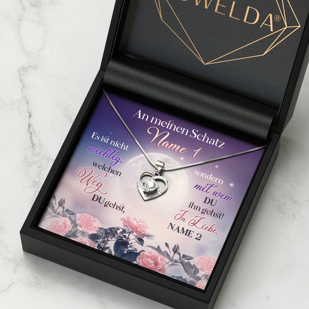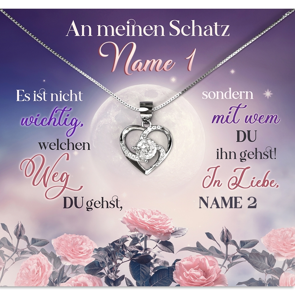 Was gibt es Schöneres als eine Liebeserklärung, die von Herzen kommt? Wenn Du Deiner Frau einfach mal wieder sagen möchtest, wie wichtig sie Dir ist, dann ist die personalisierbare Grußkarte „Wege der Liebe“ genau passend. Du wählst ein wunderschönes Schmuckstück, das Deiner Frau ein Lächeln ins Gesicht zaubern wird und übergibst es mit einer persönlichen Karte. Die romantischen Worte werden ihr noch lange in Erinnerung bleiben. Das schöne Motiv mit den Rosen und einem strahlenden Vollmond ist ein wunderbares Symbol für Eure ewige Liebe.