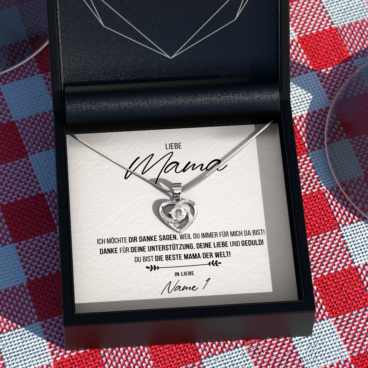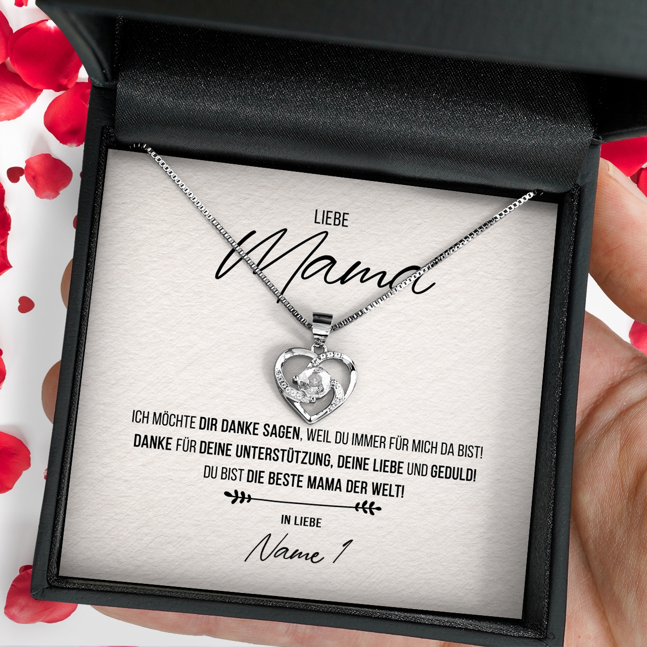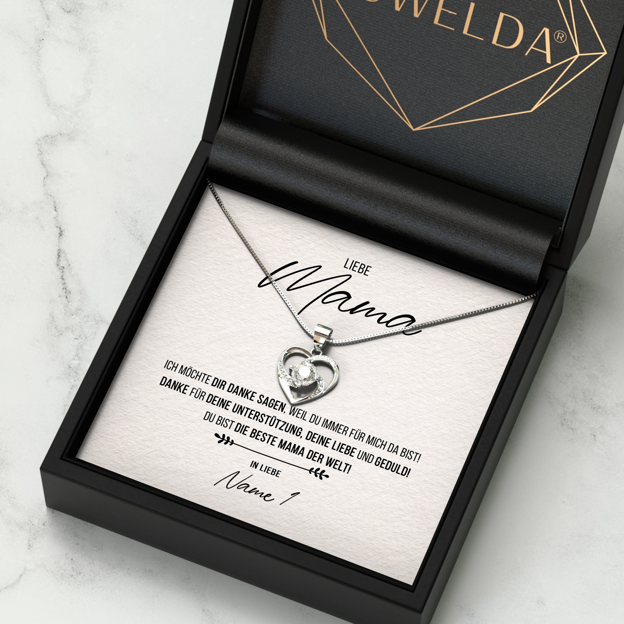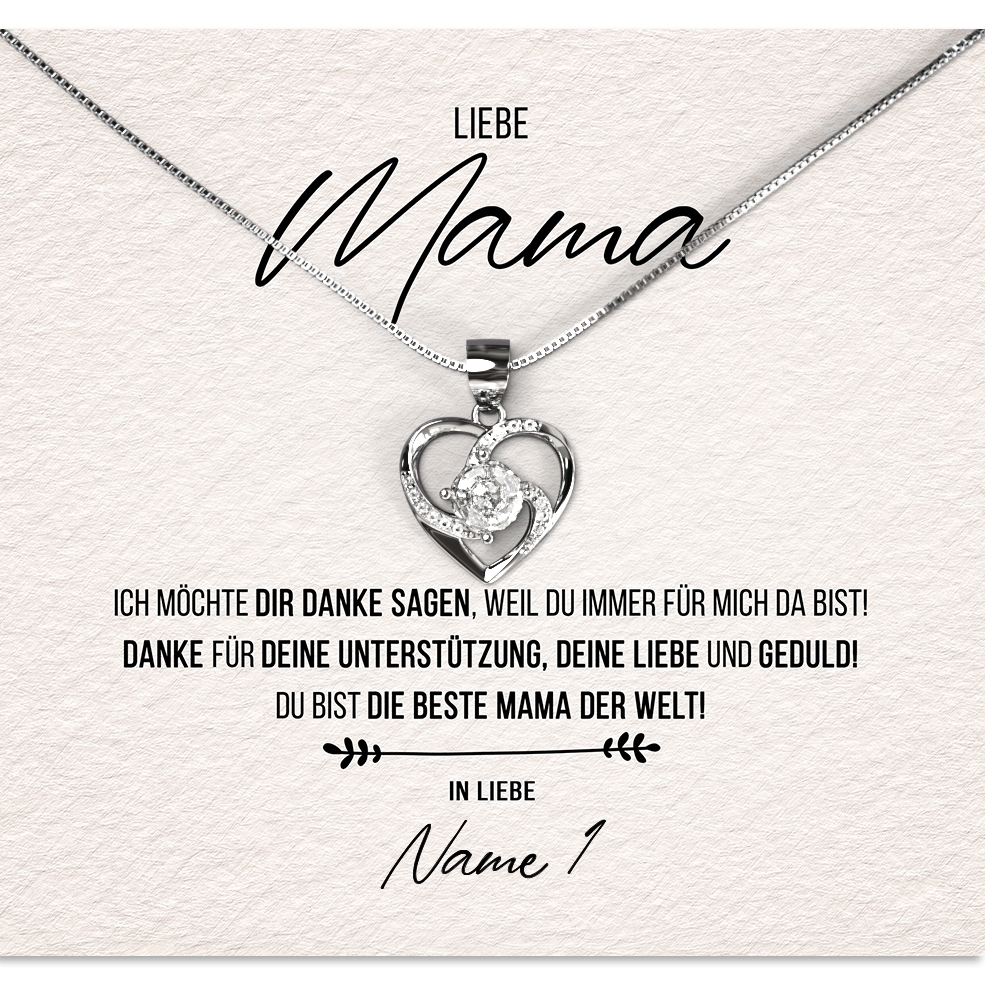 Wir liefern Dir eine hochwertige Halskette aus echtem 925 Sterling Silber in den Farben Silber, Gelbgold oder Rosegold. Außerdem legen wir Deine personalisierte Karte zusammen mit der Halskette in eine exklusive Schmuckbox aus Kunstleder. Um Deiner Mutter eine wirklich große Freude bereiten zu können, legen wir eine schöne Geschenktasche in Dein Paket. Damit hast Du die Möglichkeit, Dein sehr persönliches Geschenk sofort nach Erhalt Deiner Bestellung an Deine geliebte Mama zu übergeben.