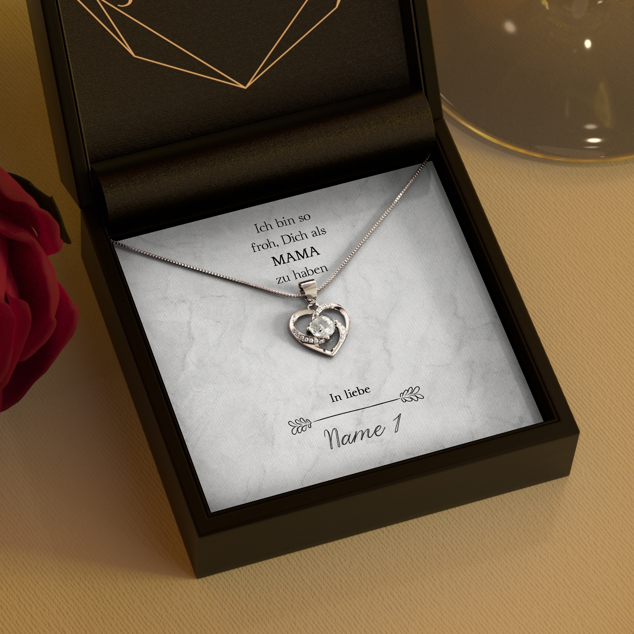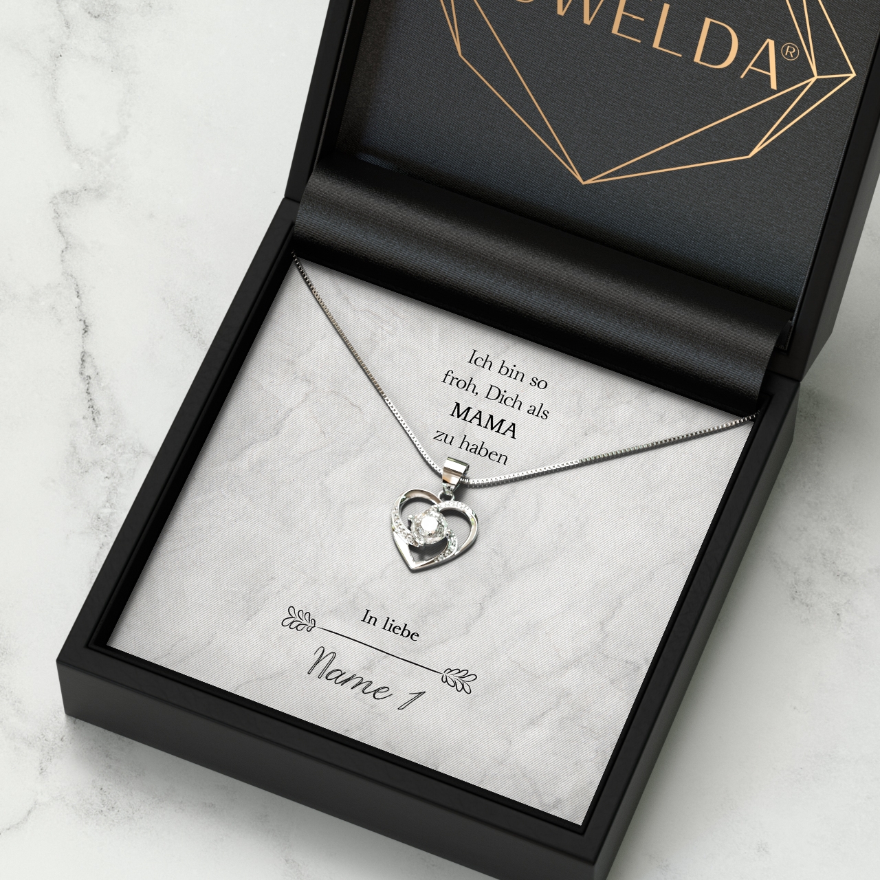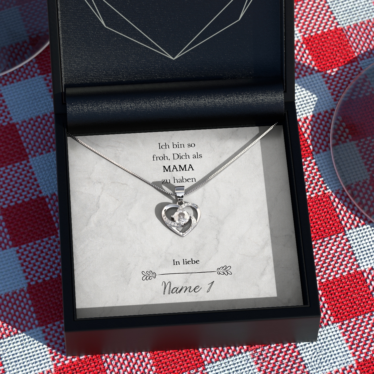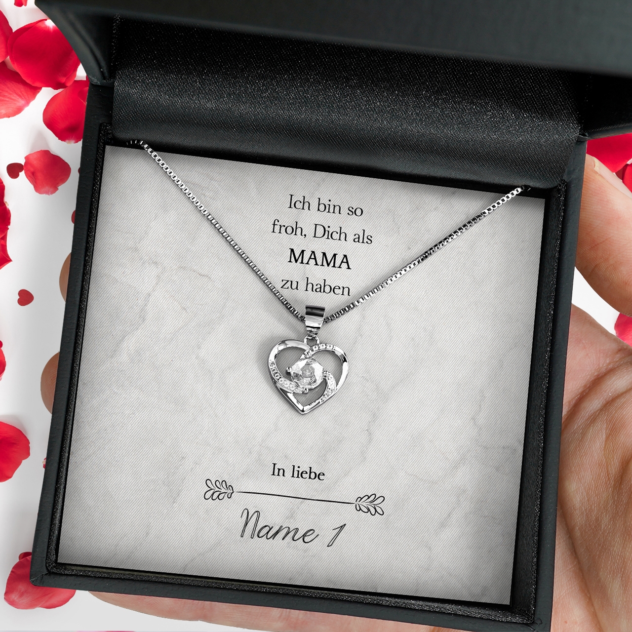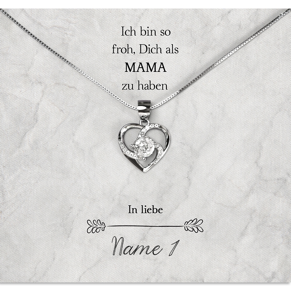 Wir stellen Deine Karte ganz individuell und nur für Dich mit Deinen Wunschnamen her. Zusammen mit der hochwertigen Halskette aus 925 Sterling Silber und der edlen Schmuckbox erhältst Du das perfekte Geschenk, welches Deine Mutter zu Tränen rühren kann. Um das Geschenk sofort an Deine Mama überreichen zu können, legen wir eine gratis Geschenktasche zu jeder Bestellung in das Paket.