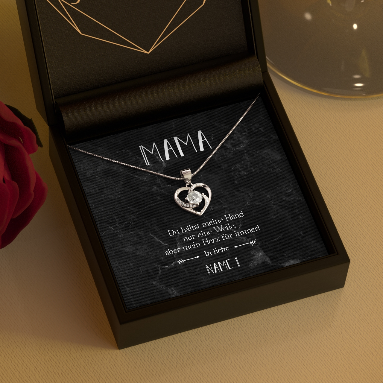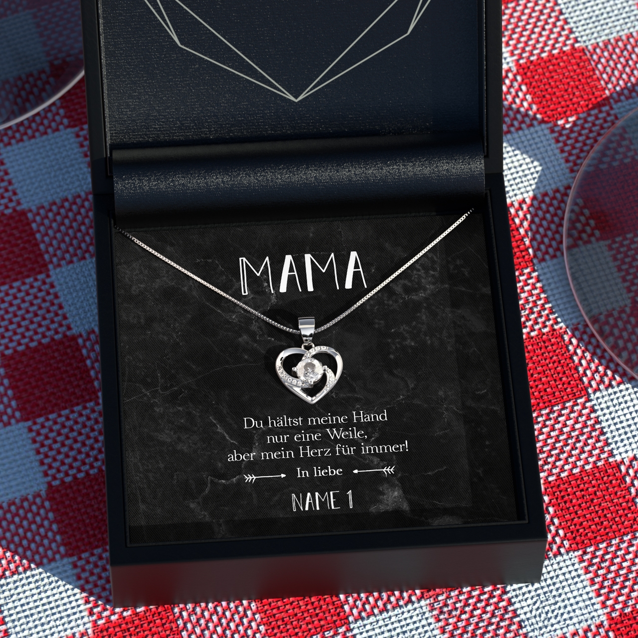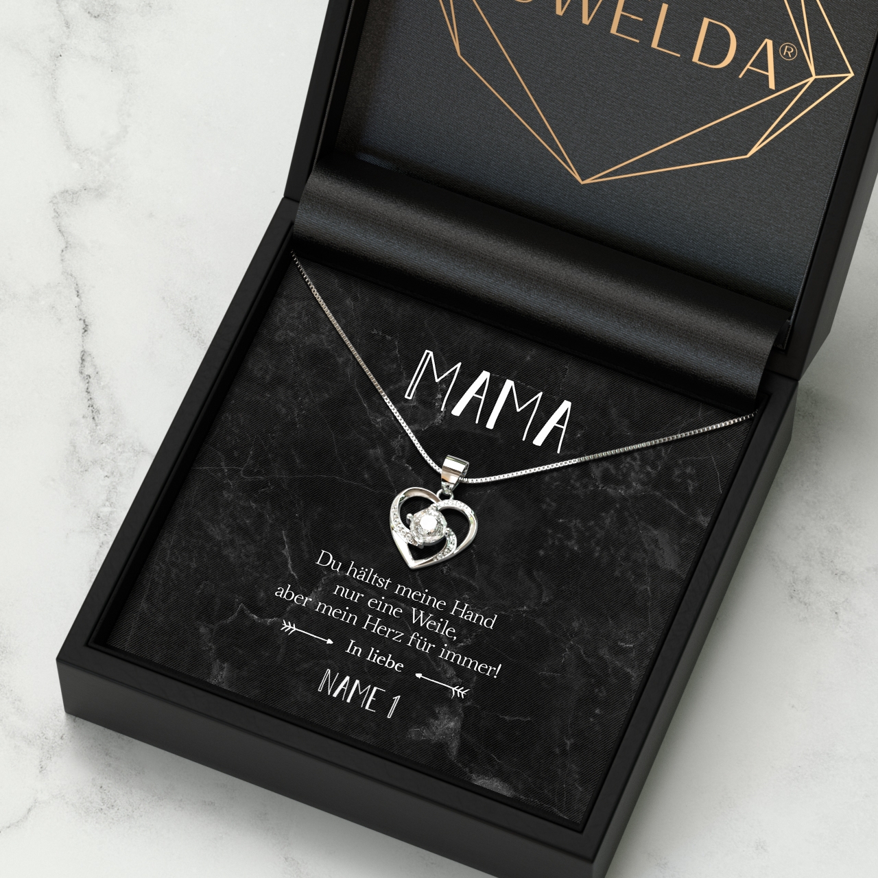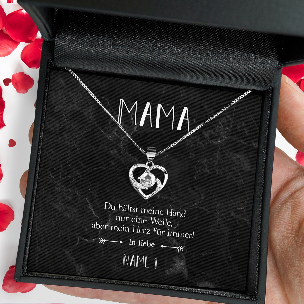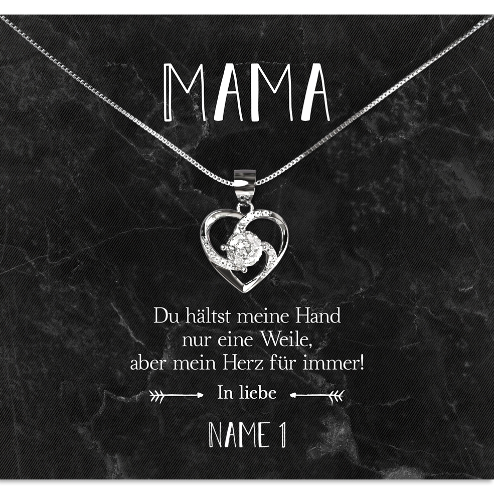 Unsere Karte „Für immer im Herzen“ wird mit bis zu 7 Namen personalisiert. Du hast die Möglichkeit, das Geschenk mit Deinen Geschwistern gemeinsam zu verschenken. Wähle einfach die Anzahl der Namen aus und trage diese in das dafür vorgesehene Feld ein. Wir liefern Dir eine Halskette aus 925 Sterling Silber und Deine personalisierte Karte in einer schönen Schmuckbox.