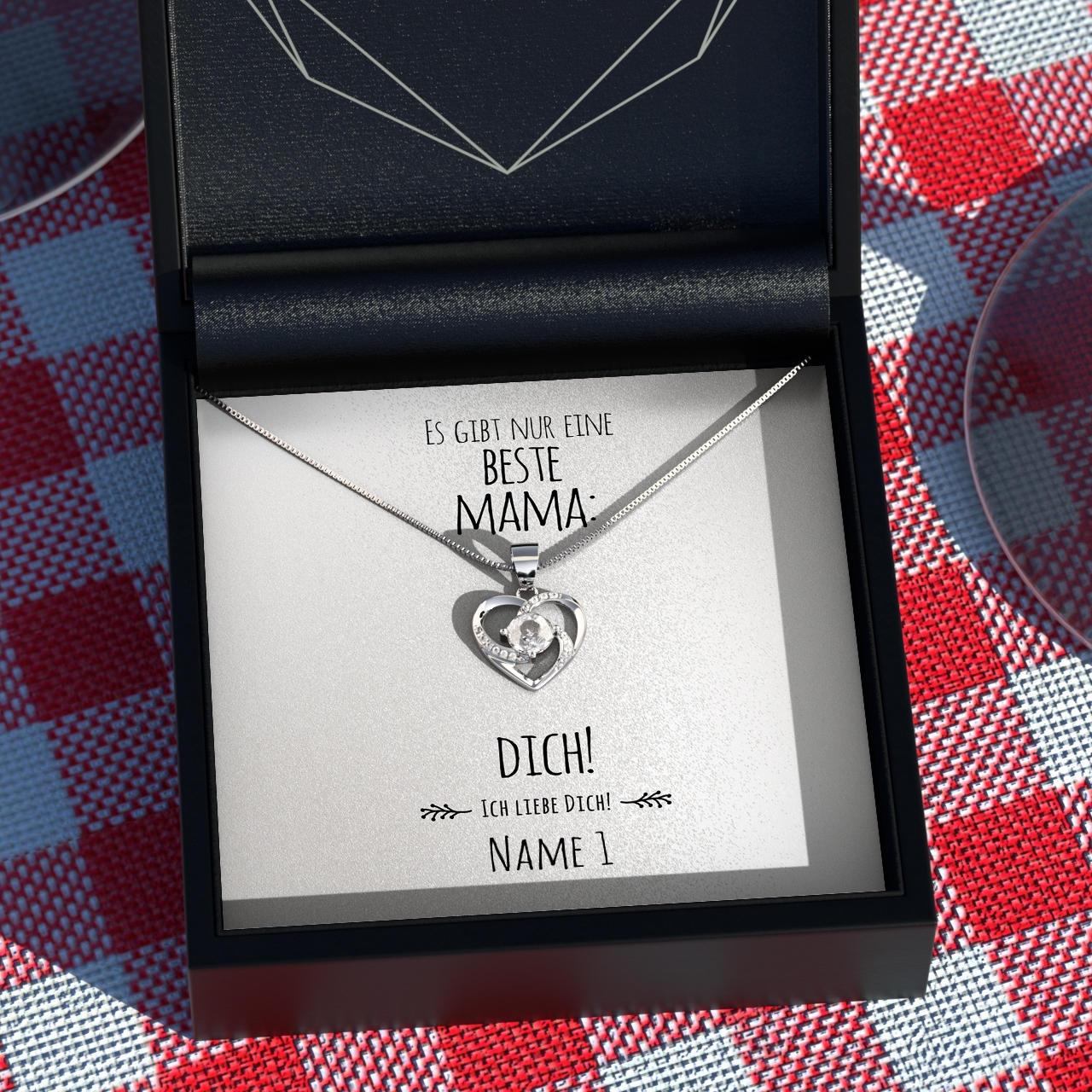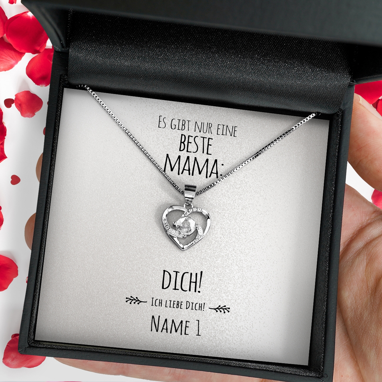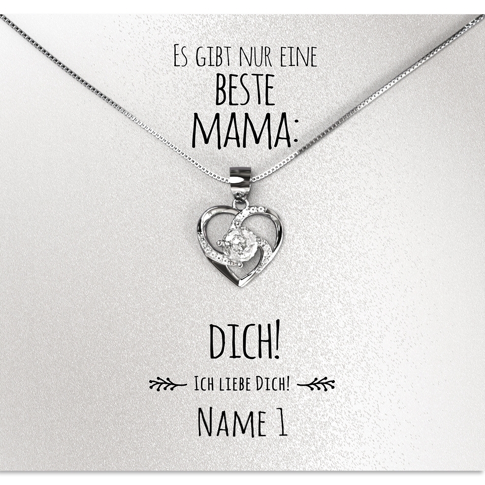Zusammen mit der personalisierten Karte liefern wir Dir ein Schmuckstück aus echten 925 Sterling Silber und ein Schmucketui aus Kunstleder mit einer Samt-Innenverkleidung. Im handgepackten Paket befindet sich außerdem eine schöne Geschenktasche, mit der Du Dein individuelles Geschenk sofort an Deine Mama verschenken kannst.
