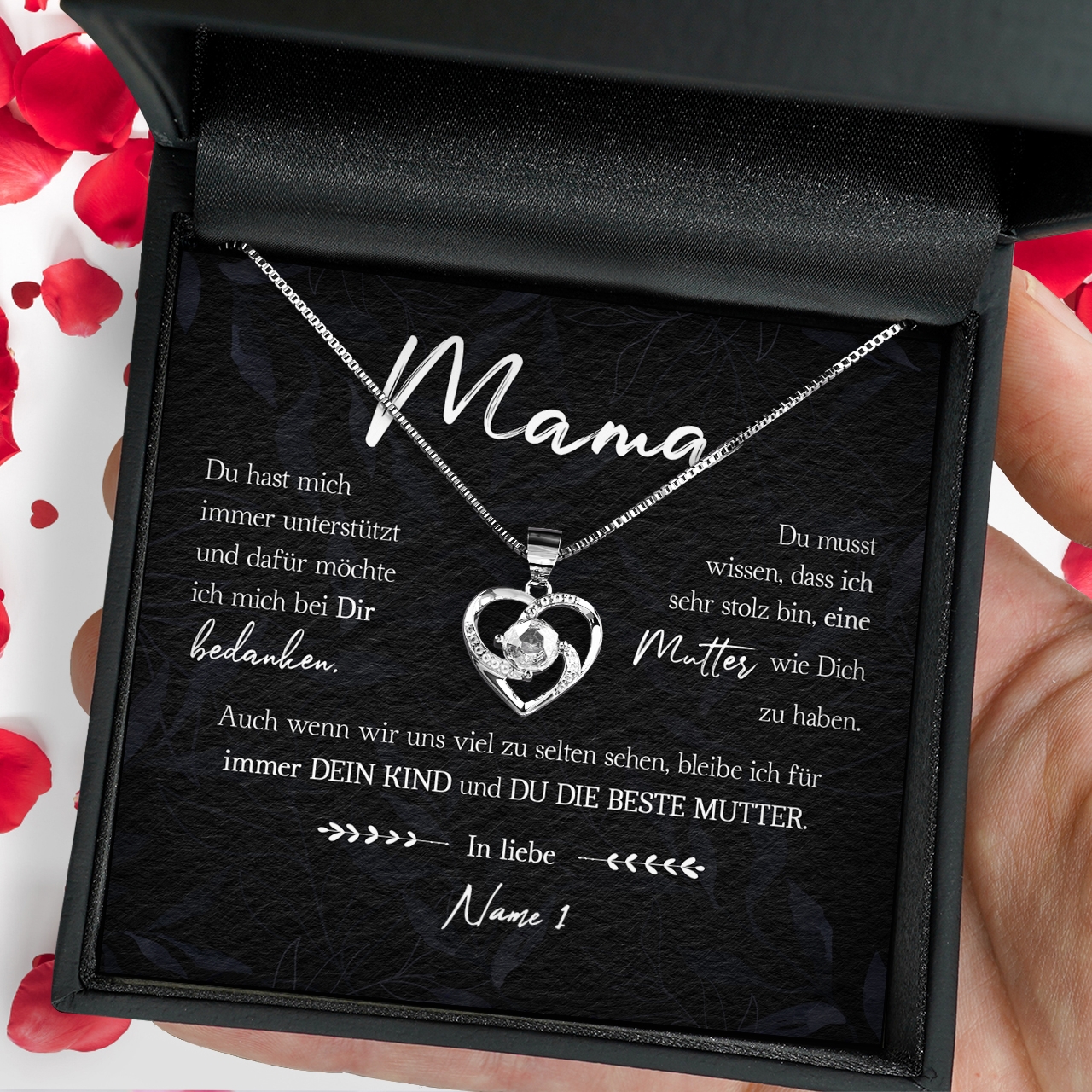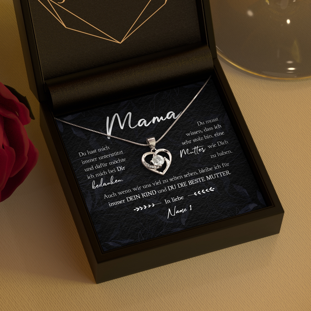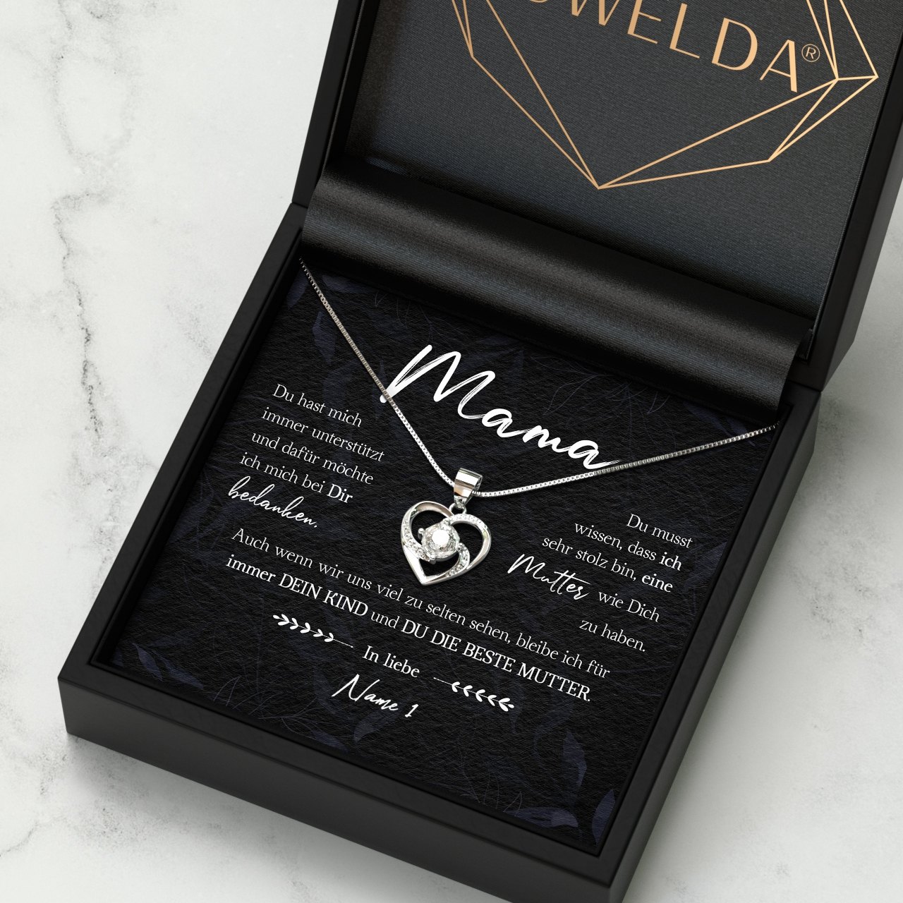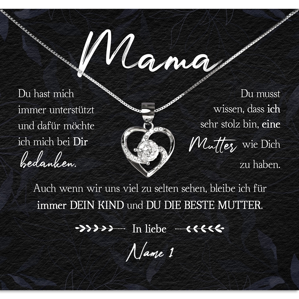 Wir drucken Deine personalisierte Karte mit Deinen Wunschnamen und legen diese zusammen mit der funkelnden Halskette in eine hochwertige Schmuckbox. Damit Du das Geschenk bei Deinem nächsten Besuch bei Deiner Mutter sofort überreichen kannst, legen wir zusätzlich eine schöne Geschenktüte in Dein Paket. Somit erhältst Du ein rundum vollkommenes Geschenk, das bestimmt in Erinnerung bleiben wird!