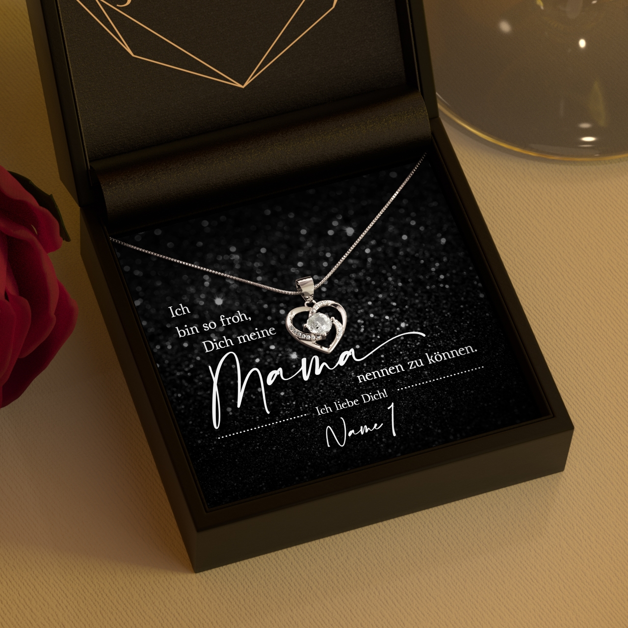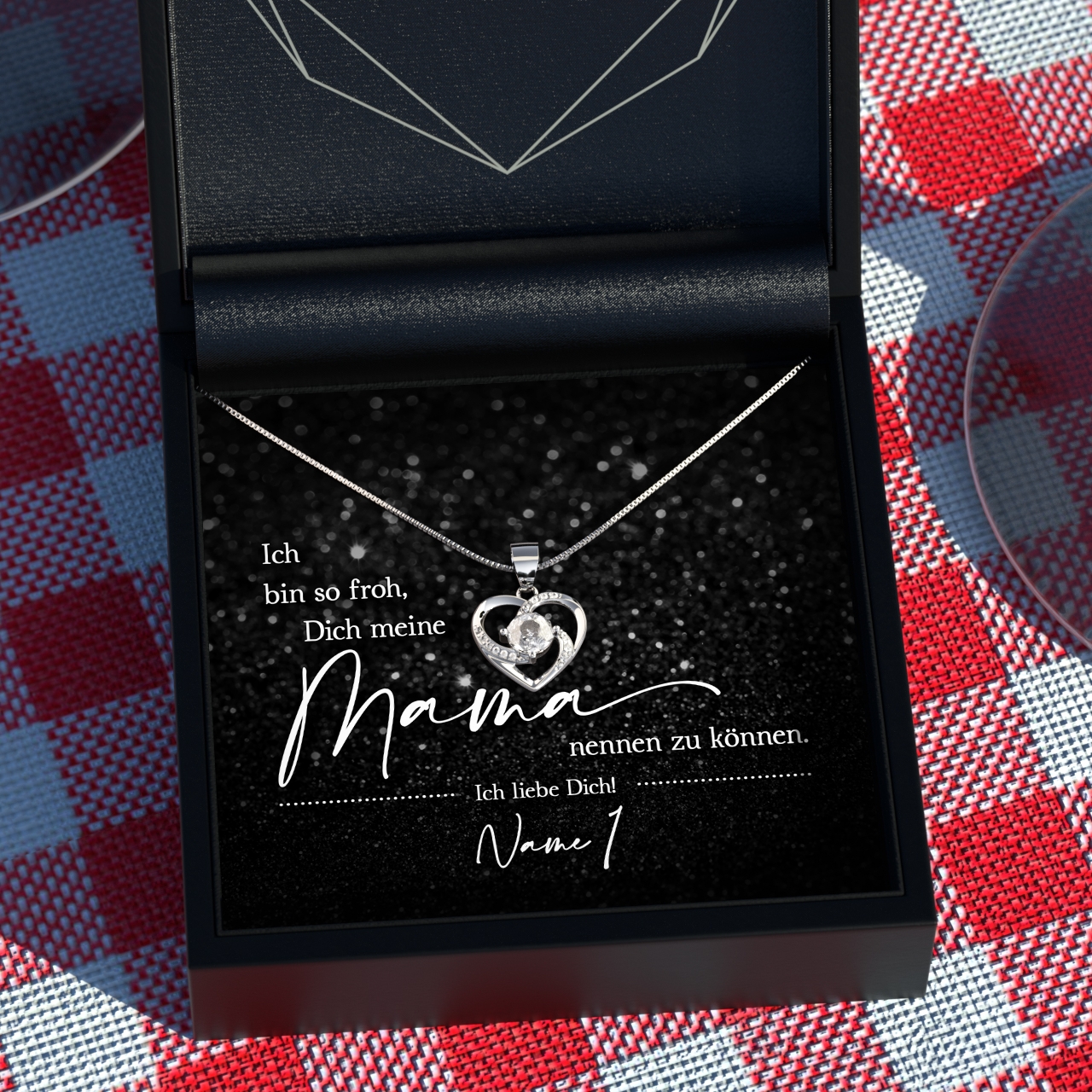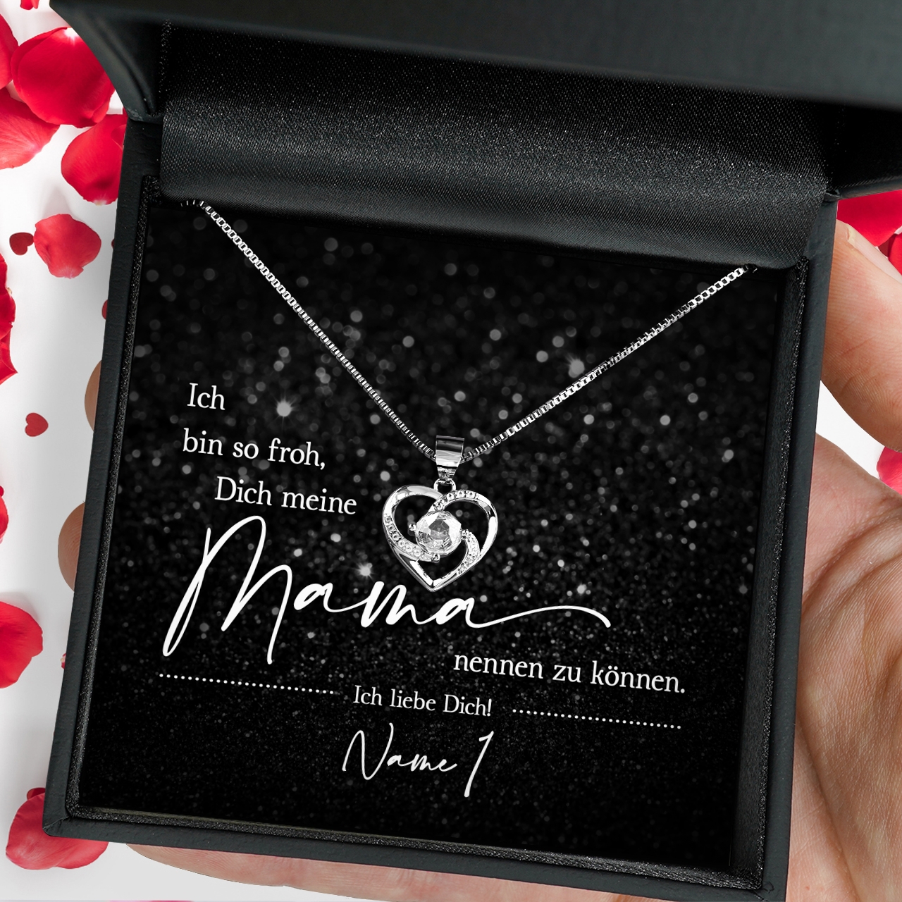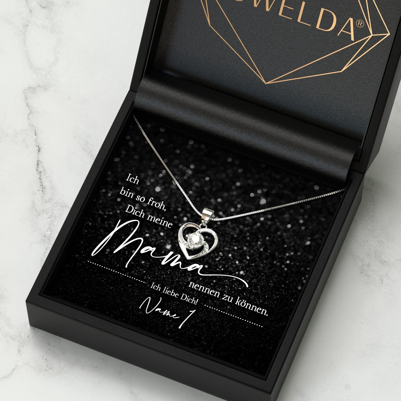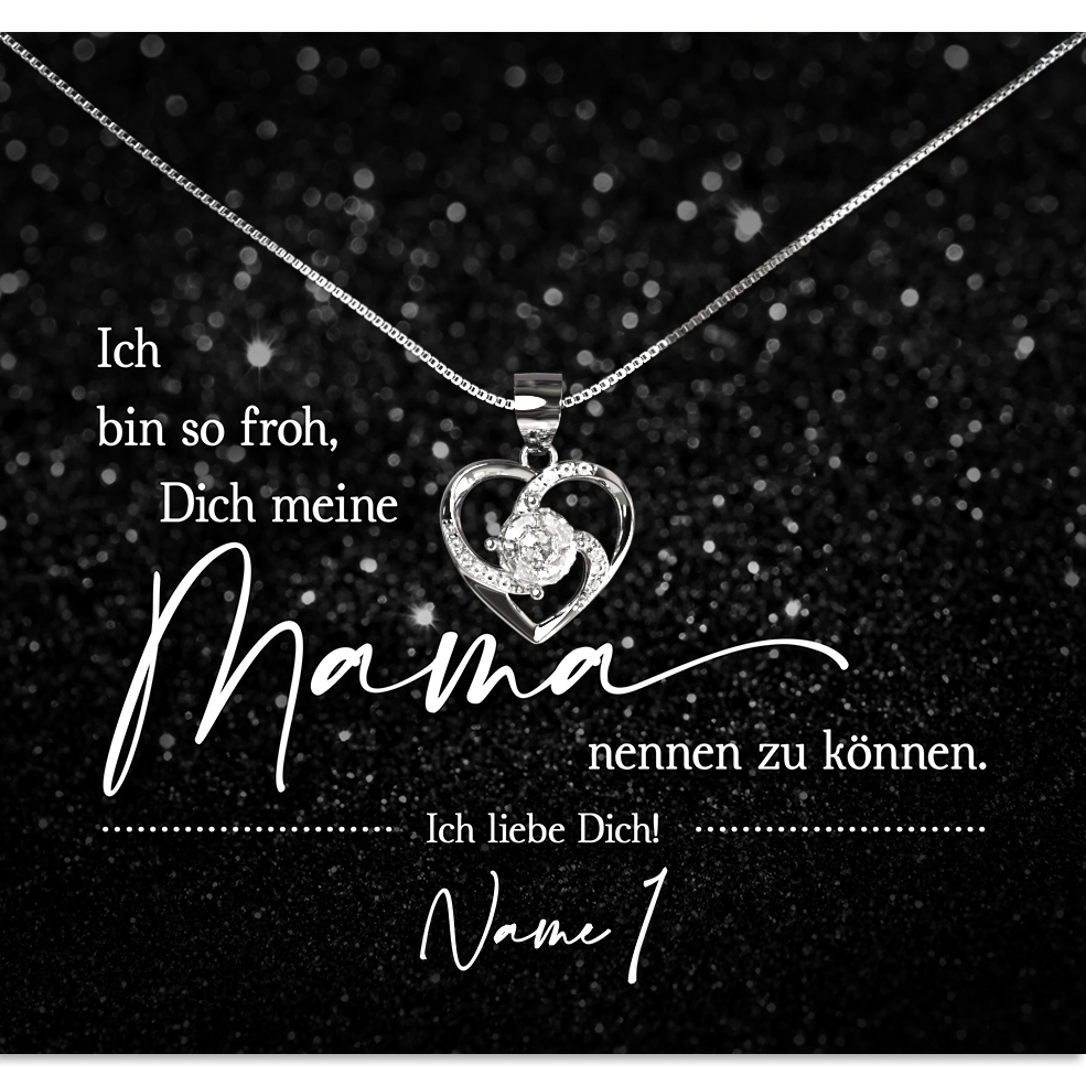 In dem Geschenkset ist eine Halskette aus 925 Sterling Silber, Deine personalisierte Karte und eine hochwertige Schmuckbox aus Kunstleder enthalten. Zusätzlich erhältst Du eine edle Geschenktasche, damit Du Dein Geschenk sofort an Deine Mama verschenken kannst. Wir verpacken Dein persönliches Geschenk von Hand in unserer kleinen Schmuckmanufaktur im schönen Westerwald.