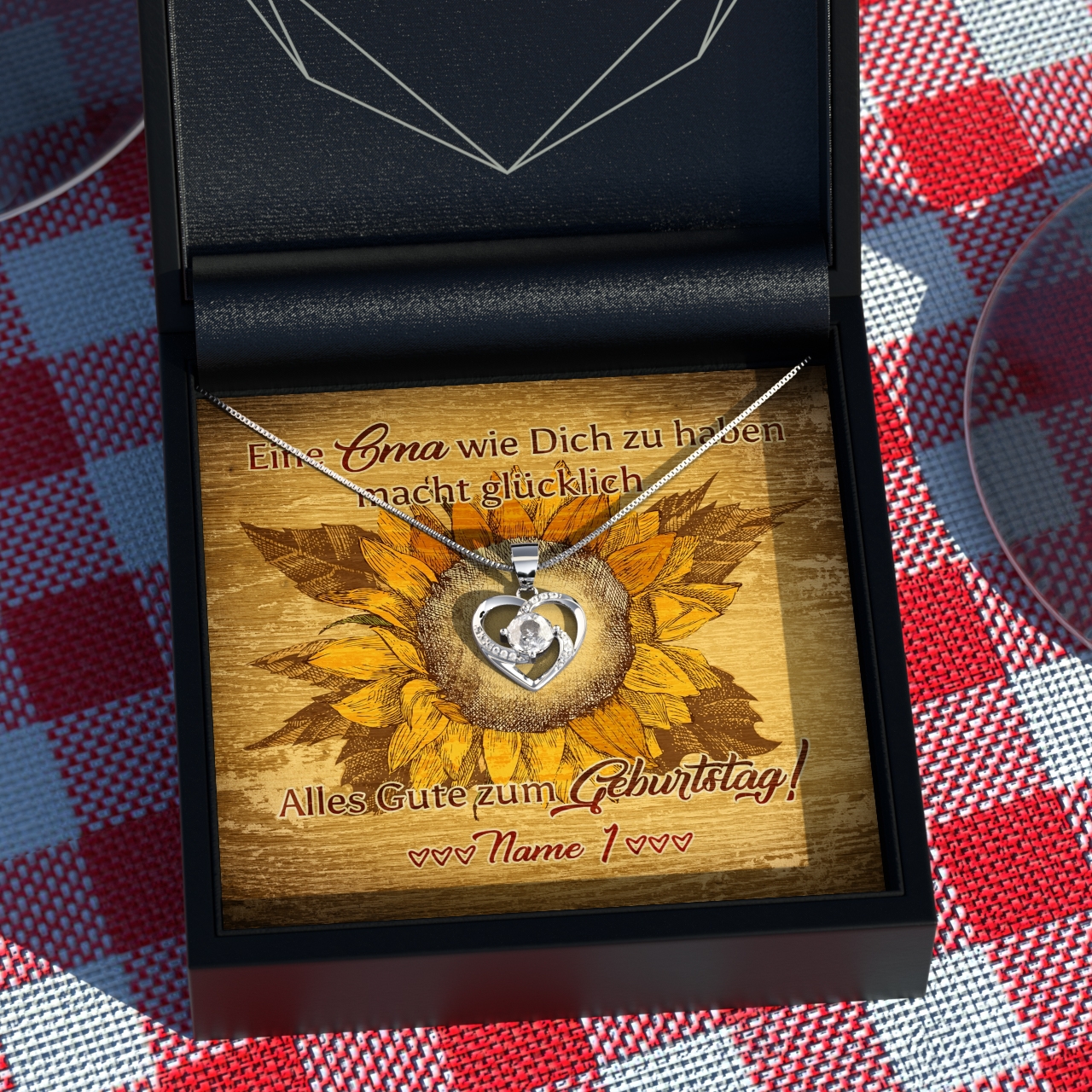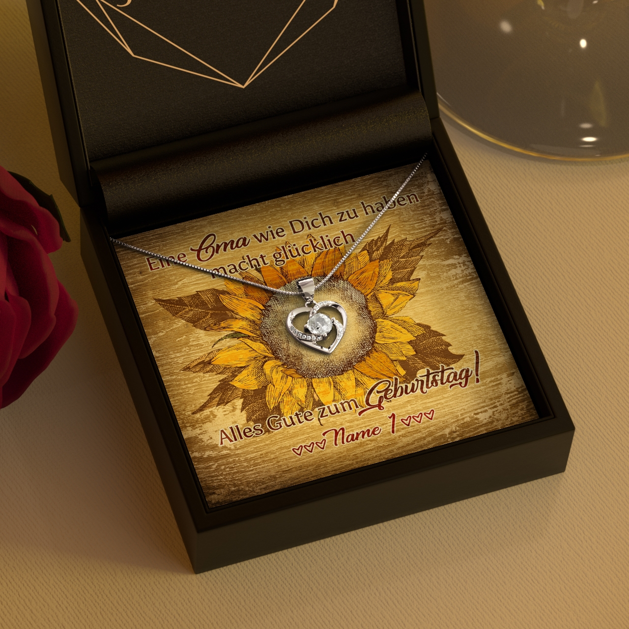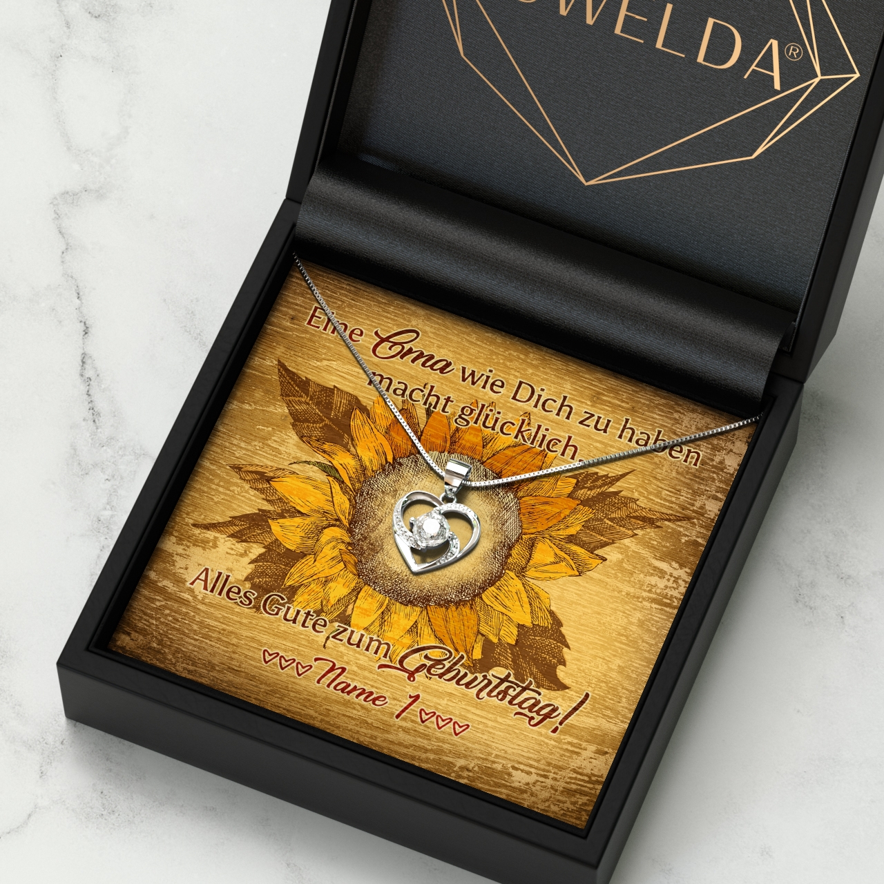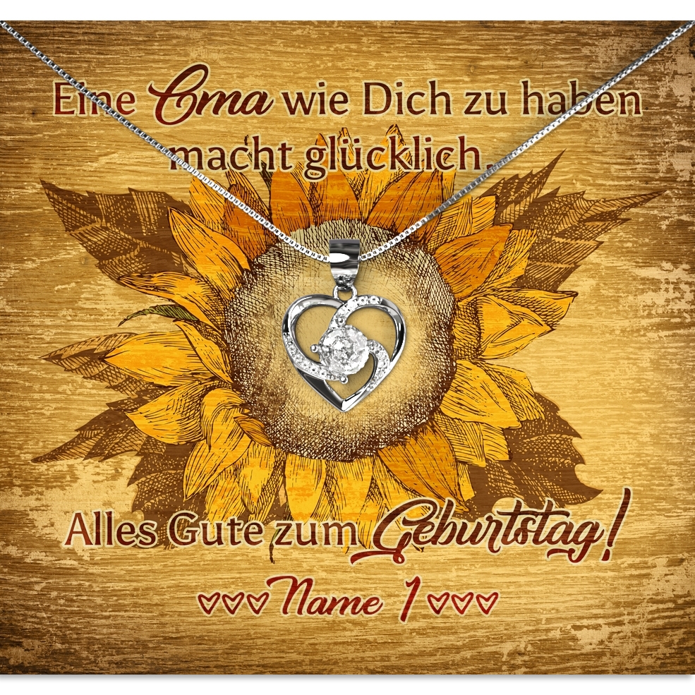 Oma macht immer die besten Geschenke? Sie ist immer für Dich da und Du genießt es, Zeit mit ihr zu verbringen? Dann überrasche Sie in diesem Jahr zu Ihrem Geburtstag mit etwas ganz Besonderem. Wir bieten Dir eine fein selektierte Auswahl für atemberaubend schöne Schmuckstücke. Finde das perfekte Juwel für Deine Omi und überreiche es zusammen mit dieser schönen, personalisierbaren Karte. Wir drucken Deinen Namen auf die Karte – Oma wird sich mit Sicherheit riesig freuen. Das Design zeigt eine Sonnenblume, die genauso fröhlich ist wie Deine Großmutter.