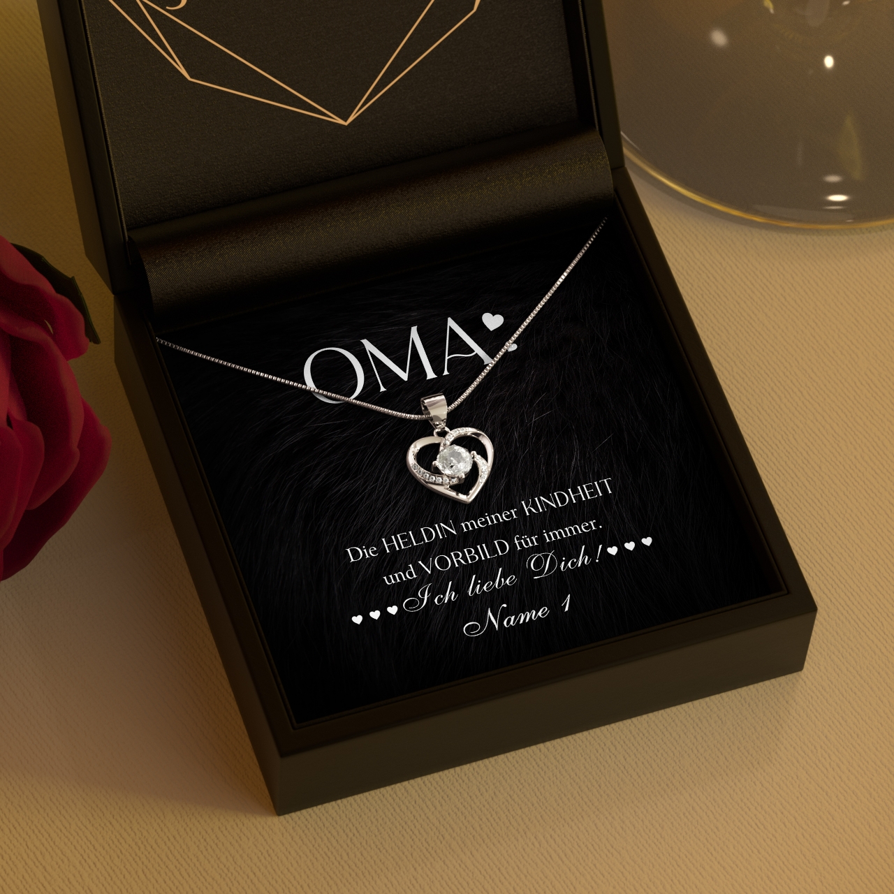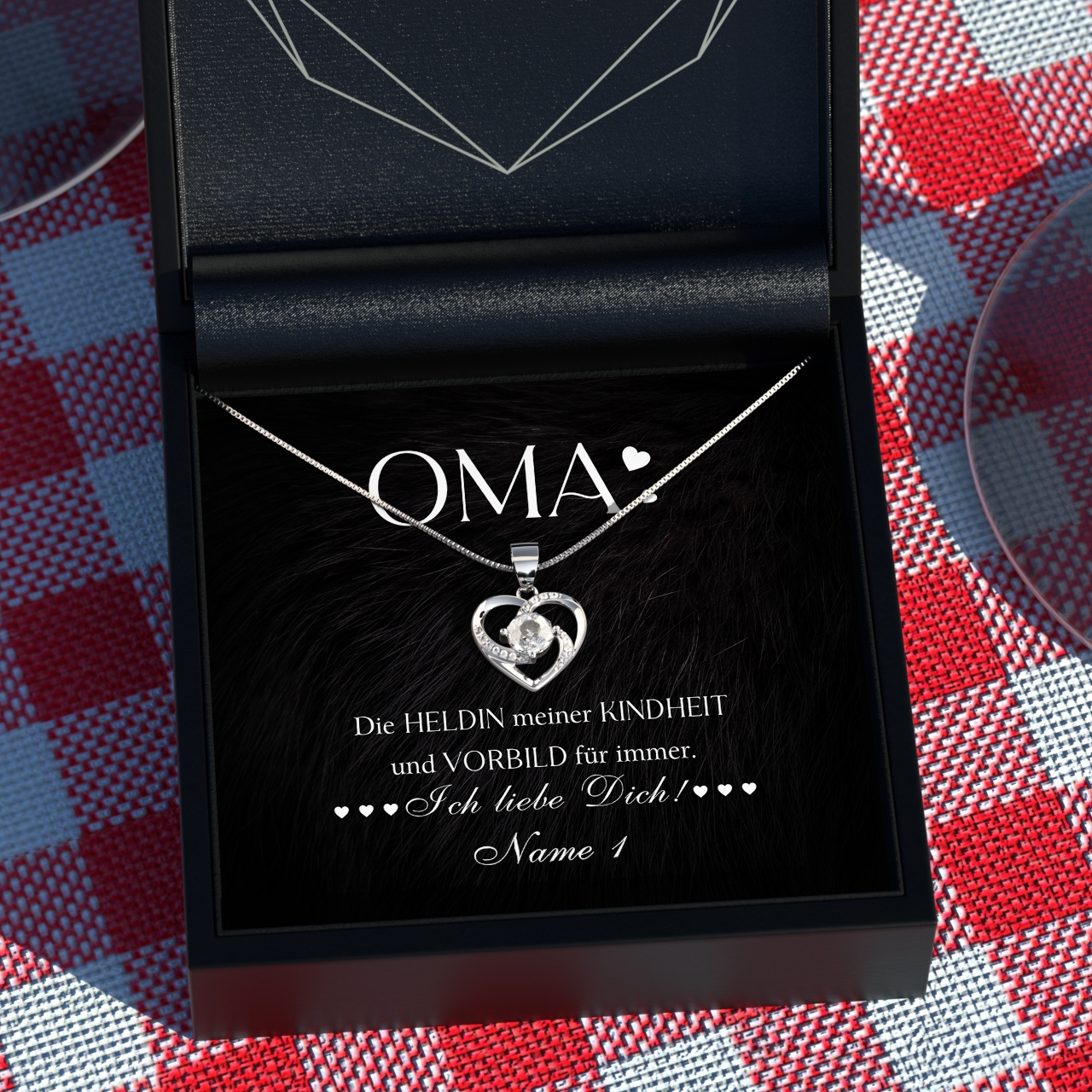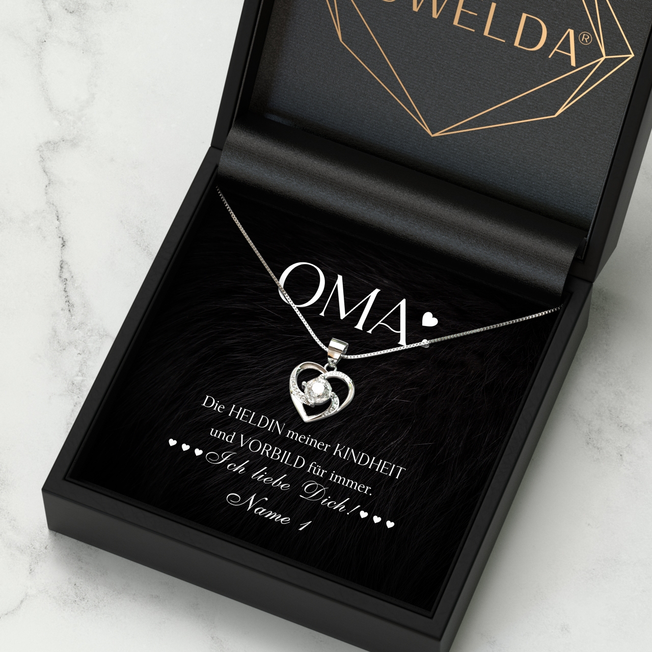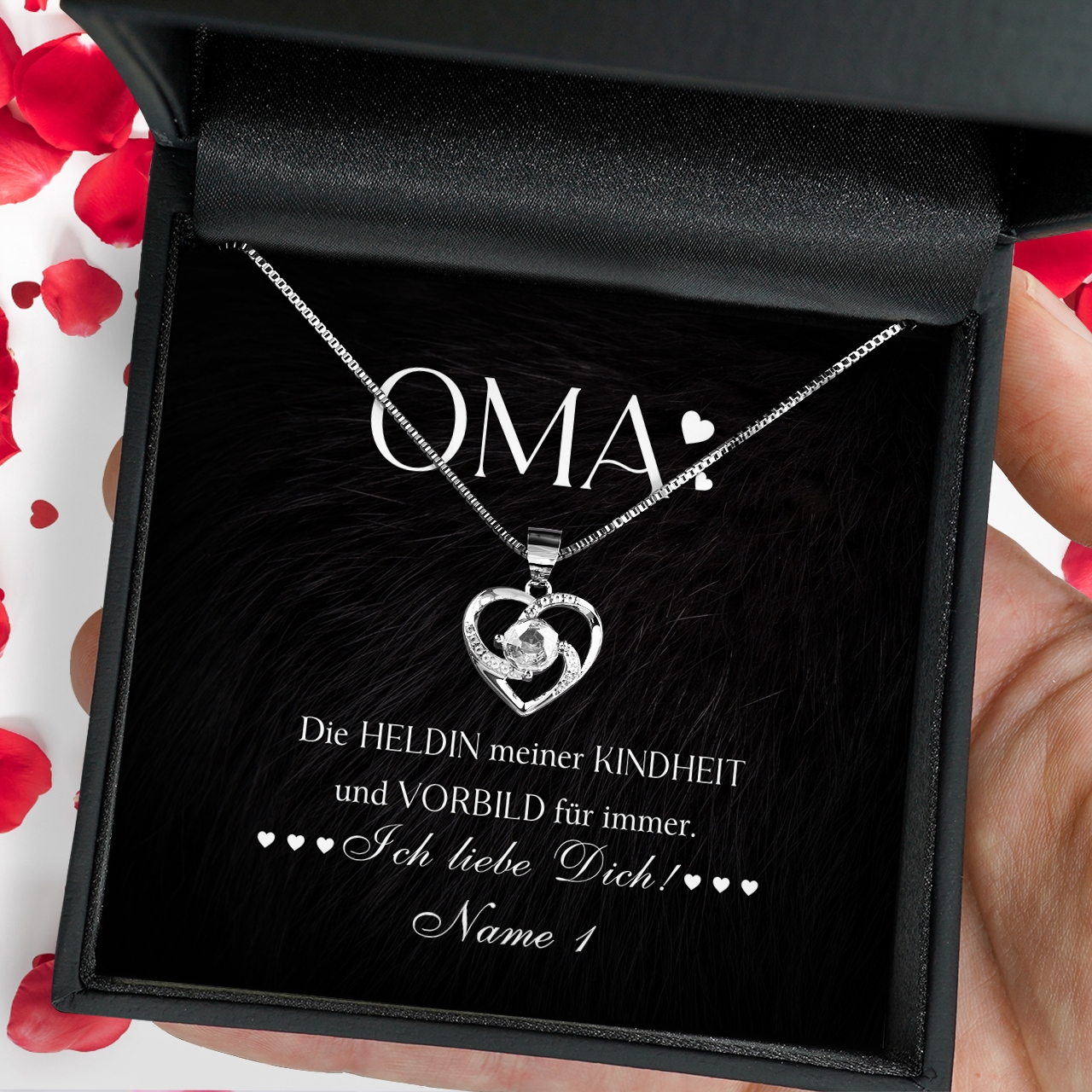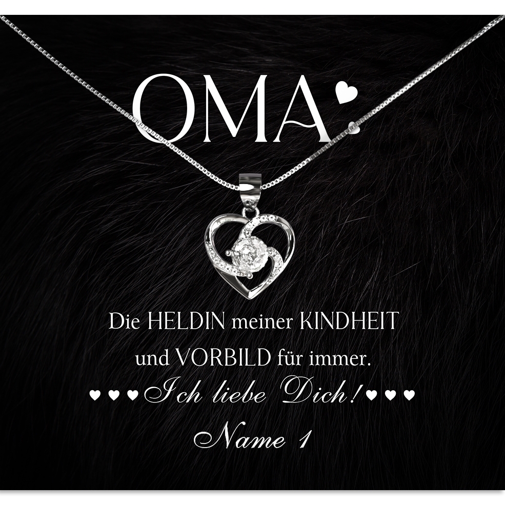 Du musst Dich nur für eine unserer Halsketten aus echtem Sterling Silber entscheiden und Deine Wunschnamen in das Personalisierungsfeld eintragen. Möchtest Du das Geschenk mit mehreren Familienmitgliedern an Deine Oma verschenken? Dann hast Du die Möglichkeit, die personalisierte Karte mit bis zu 7 Namen zu individualisieren. Anschließend verpacken wir Dein Geschenk von Hand und liefern es Dir innerhalb von 2-3 Werktagen.