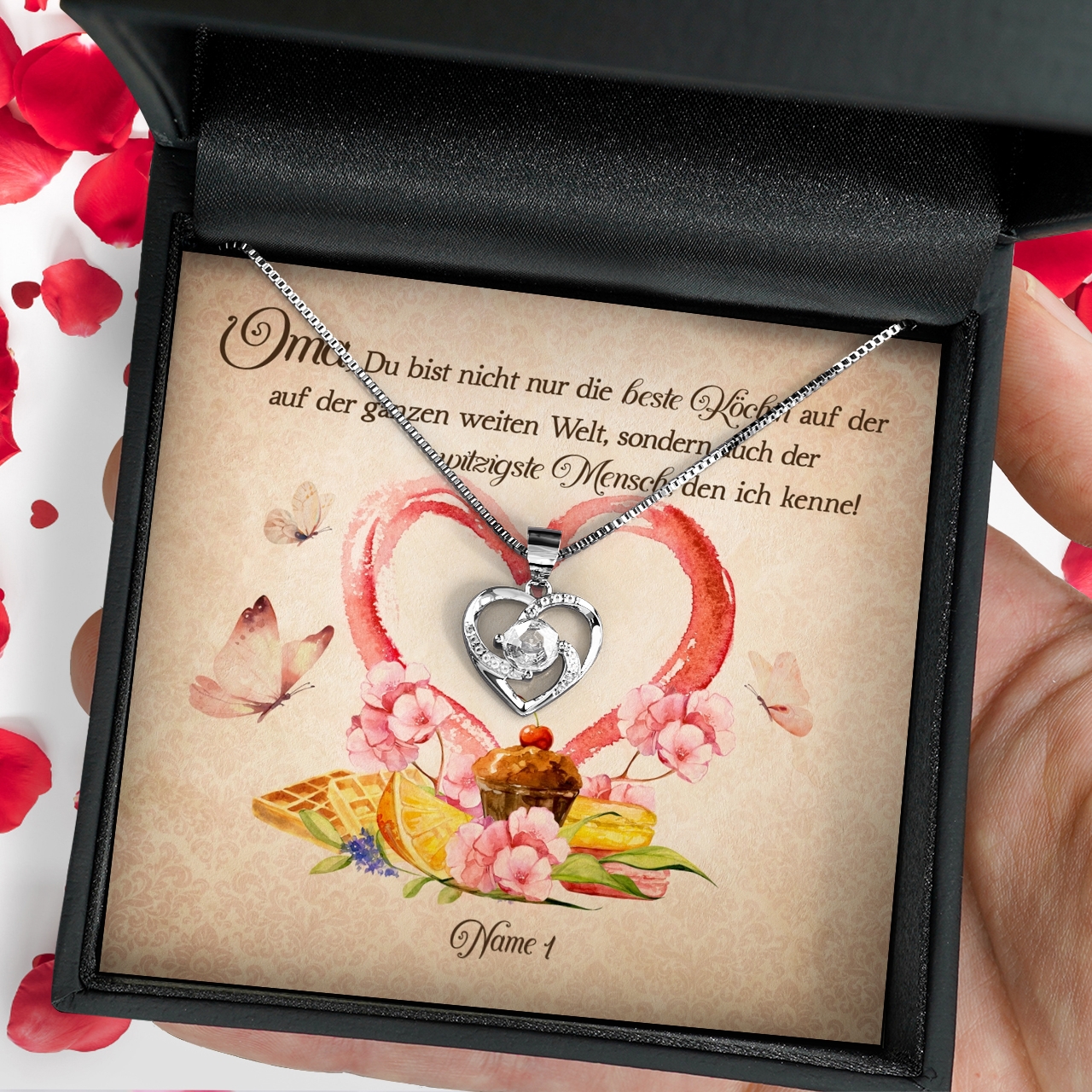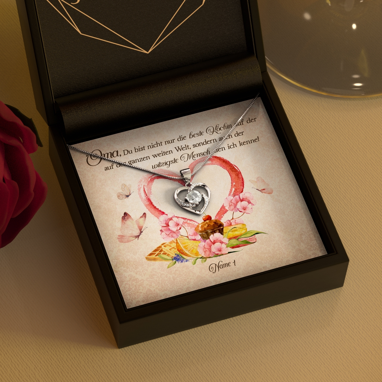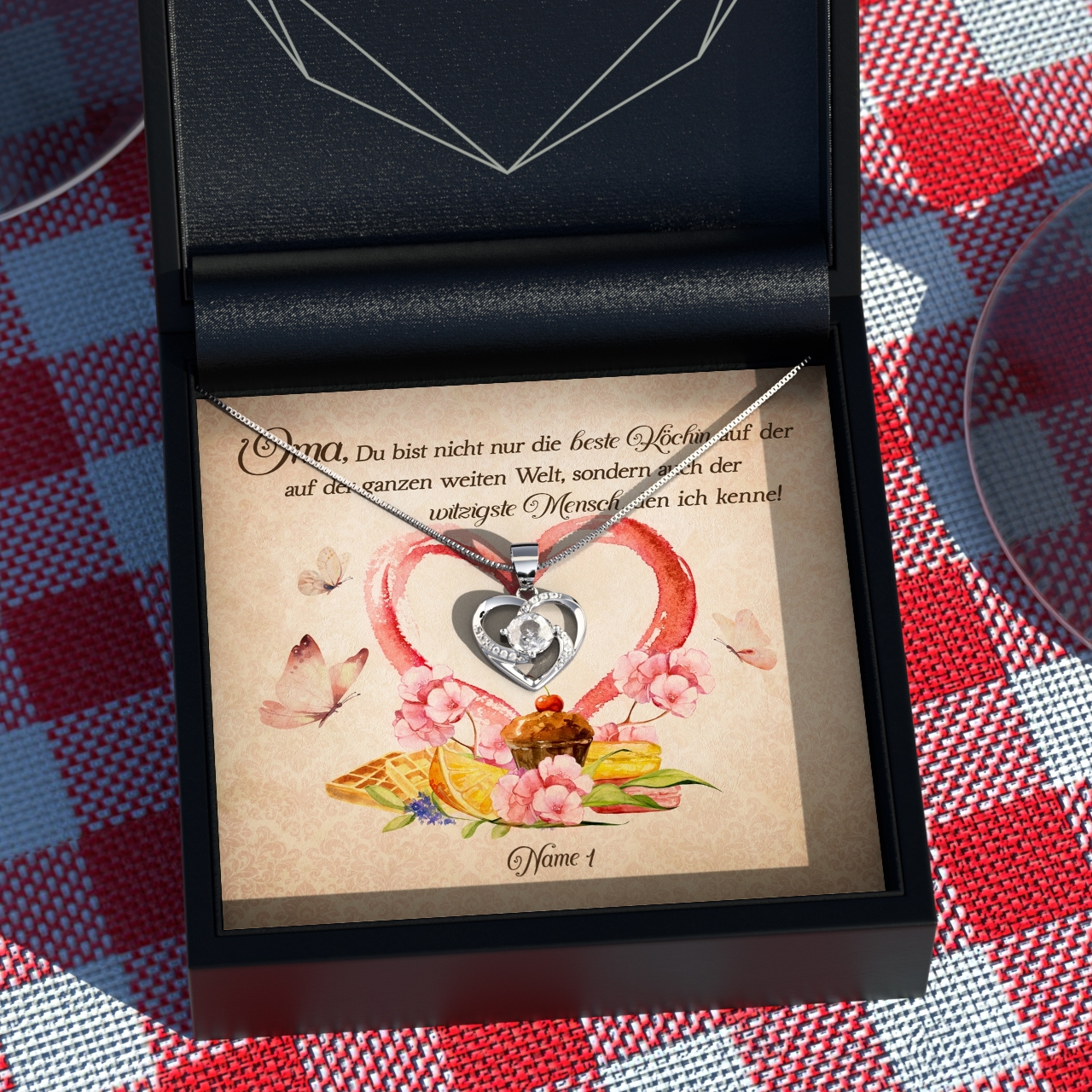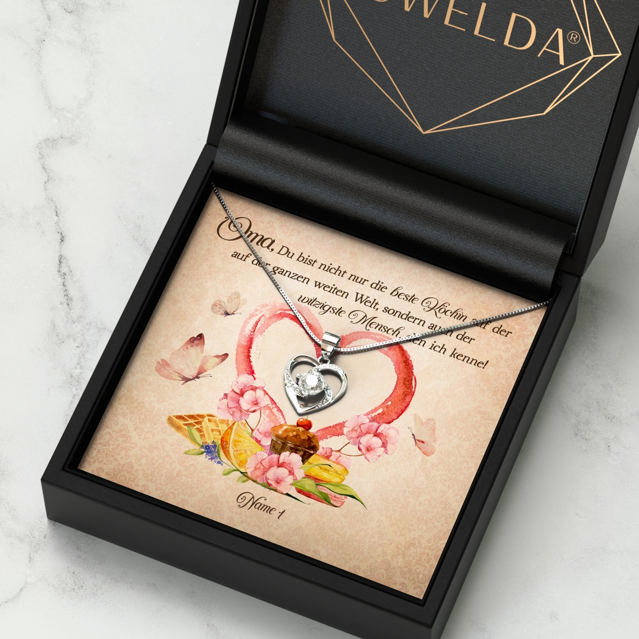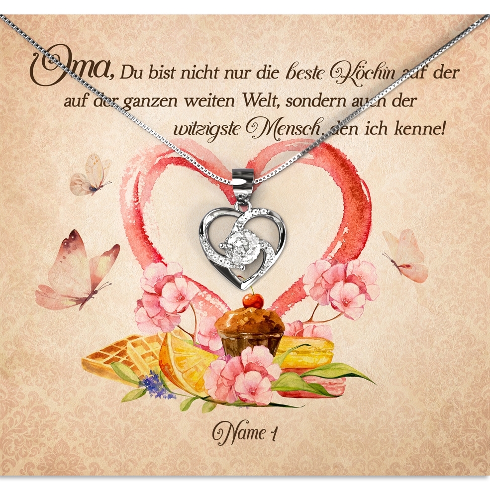 Dass die Liebe bekanntlich durch den Magen geht, ist eine globale Weisheit. Und weil Deine Oma die beste Köchin der Welt ist und Dich jeden Tag auf ein neues glücklich macht, solltest Du ihr das auch sagen. Dafür ist dieses schöne Schmuckgeschenk-Set mit einer personalisierten Grußkarte die beste Wahl. Du kannst das Design mit den leckeren Köstlichkeiten und den niedlichen Schmetterlingen mit nur wenigen Klicks mit einem oder mehreren Namen personalisieren.
