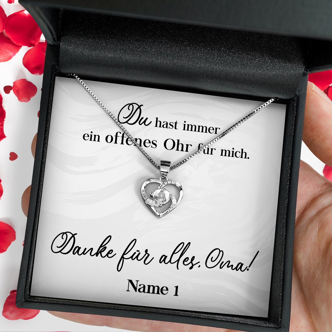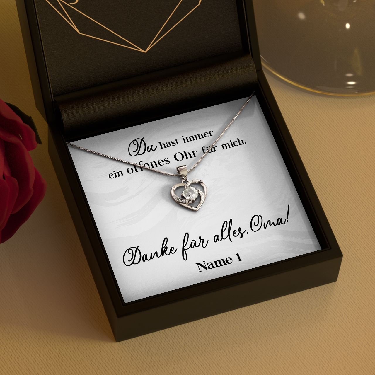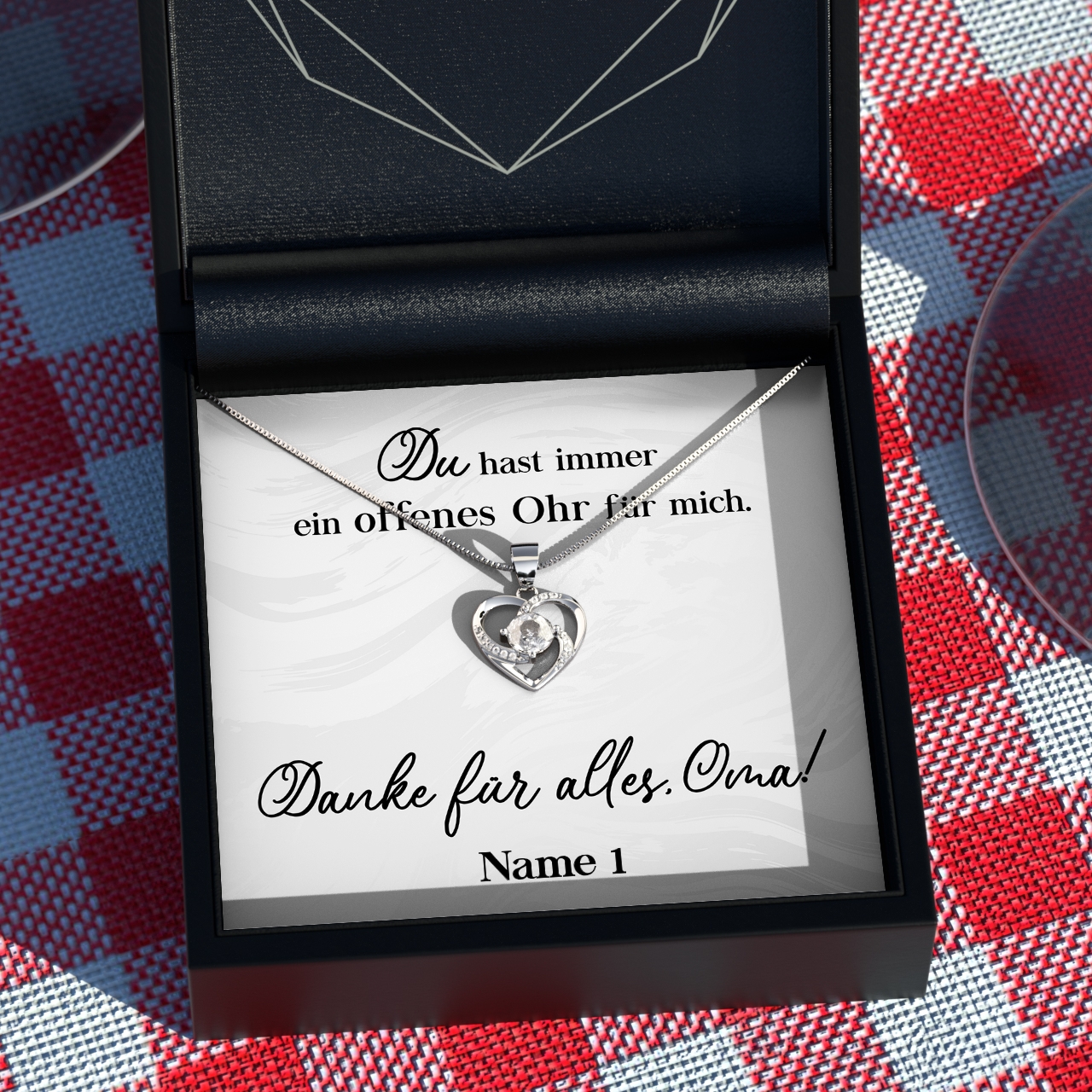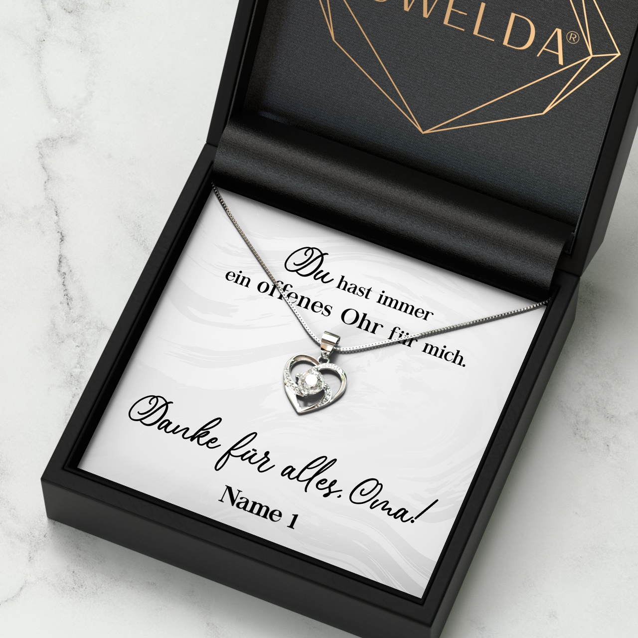 Möchtest Du Dein Geschenk sofort an Deinen Lieblingsmenschen überreichen? Dann solltest Du ein Blick auf die Variante mit der premium Geschenkverpackung werfen. Die Halskette Deiner Wahl und Deine personalisierte Karte werden liebevoll in eine hochwertige Schmuckbox mit Kunstlederüberzug und Samt-Innenbezug gelegt. Damit die Überraschung auch wirklich gut ankommt, wird alles behutsam in eine Geschenktasche gelegt, in Seidenpapier verpackt und mit einer Schleife zugebunden. Hier bekommst Du bereits einen kleinen Vorgeschmack: