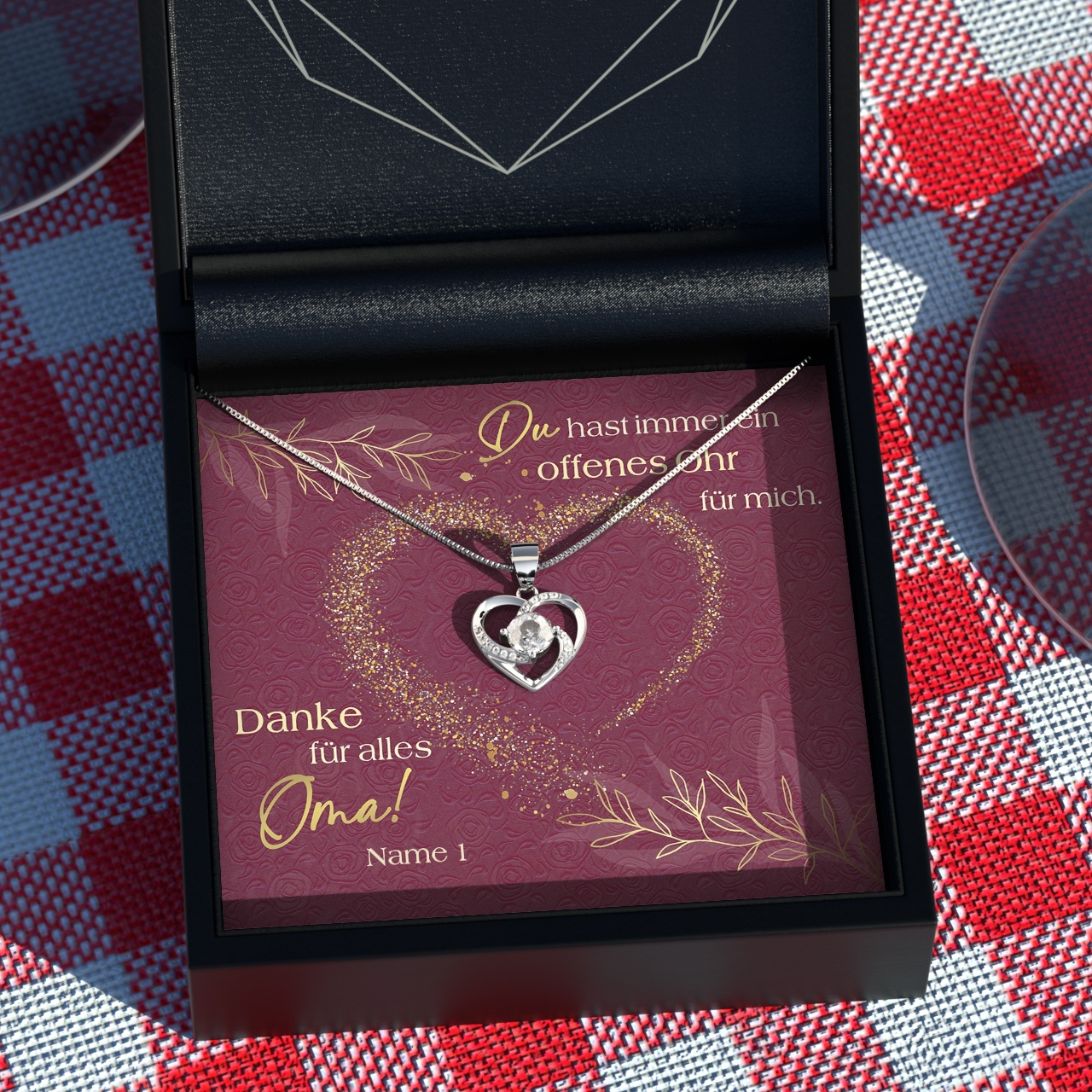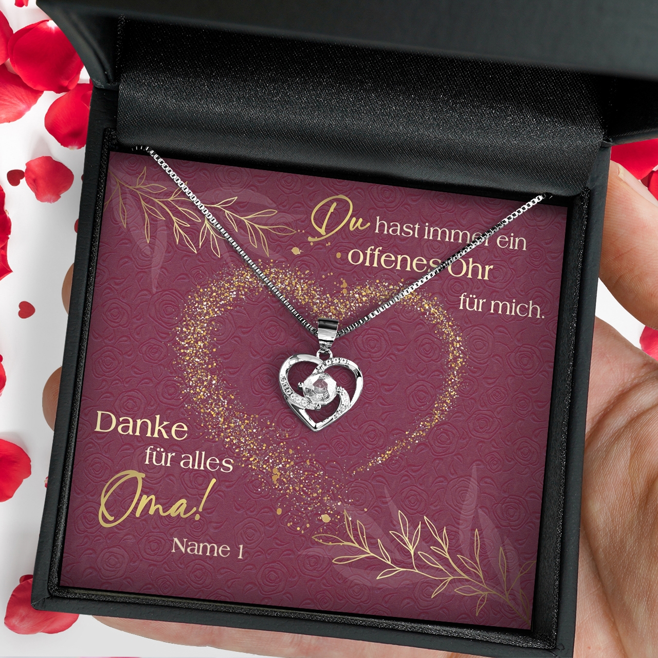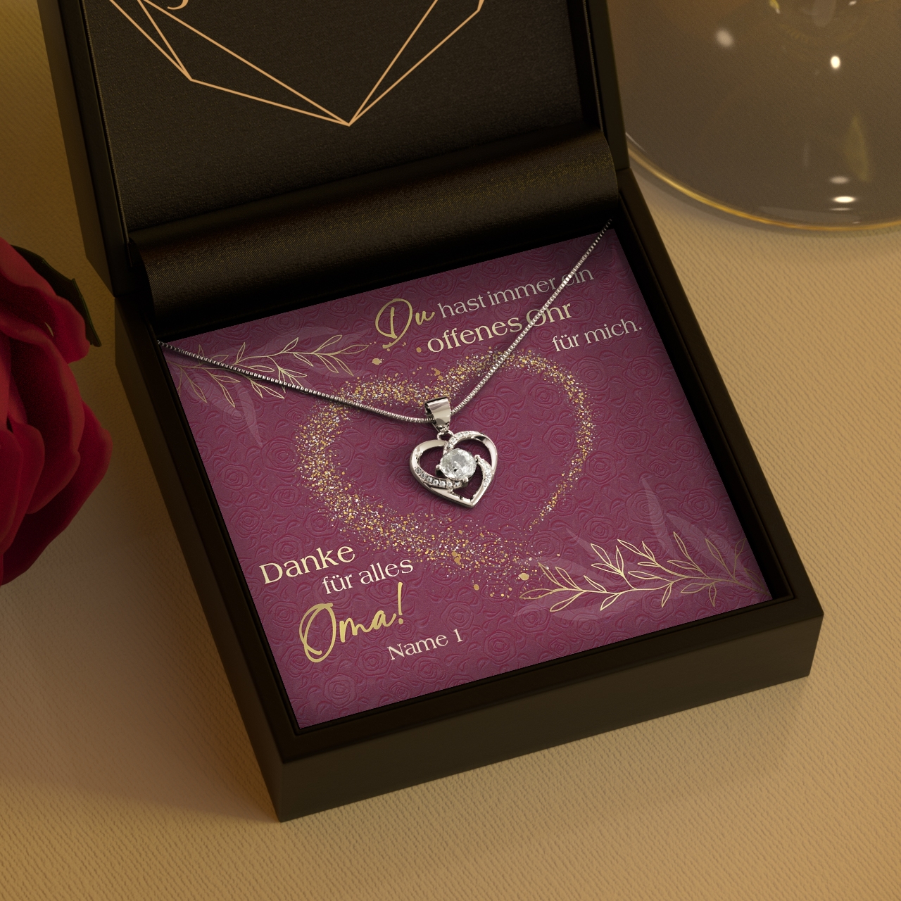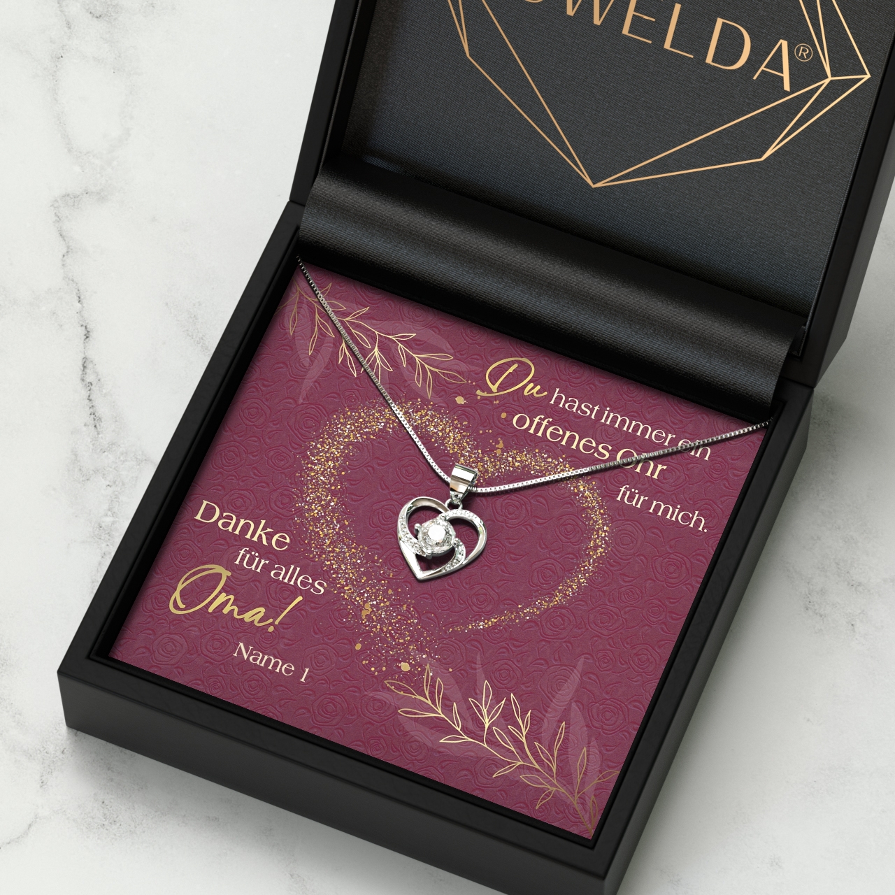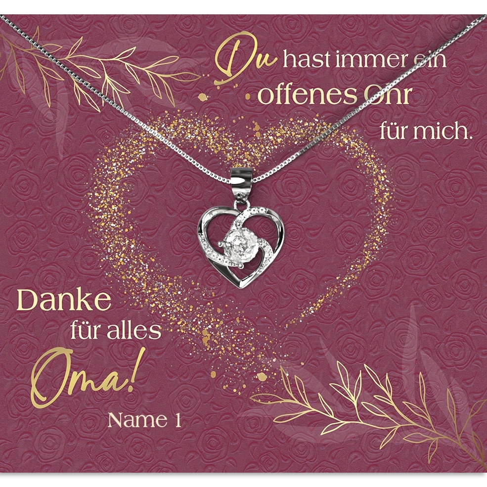 Wenn Du Deine Oma siehst, geht Dir das Herz auf? Sie bringt Freude und Liebe in Dein Leben? Überrasche Sie mit einem meisterhaft gefertigten Schmuckstück und einer dazu passenden, personalisierbaren Grußkarte. Diese hübsche Karte ist in Altrosa und Gold gehalten. Das Glitzerherz in der Mitte des Designs wird das von Dir ausgesuchte Schmuckstück wahrhaft zum Leuchten bringen.