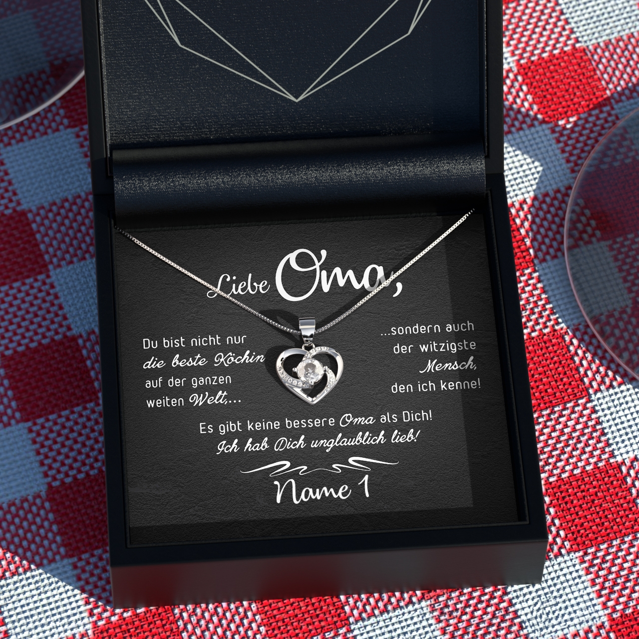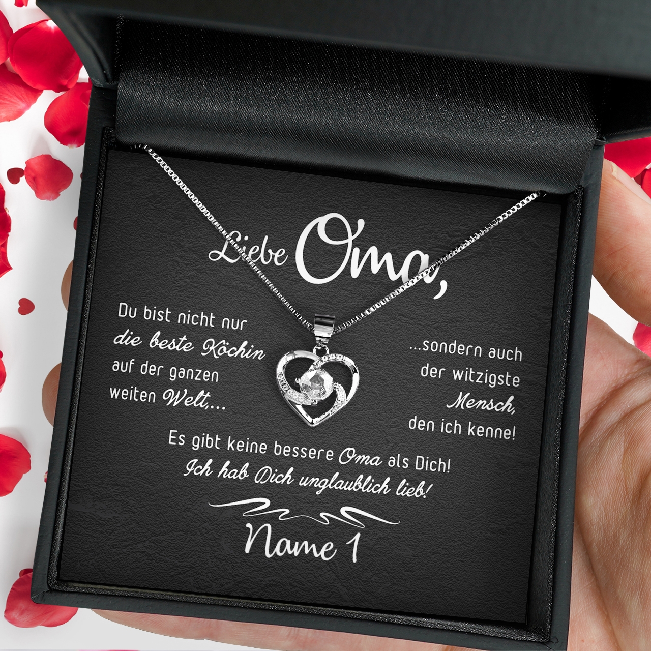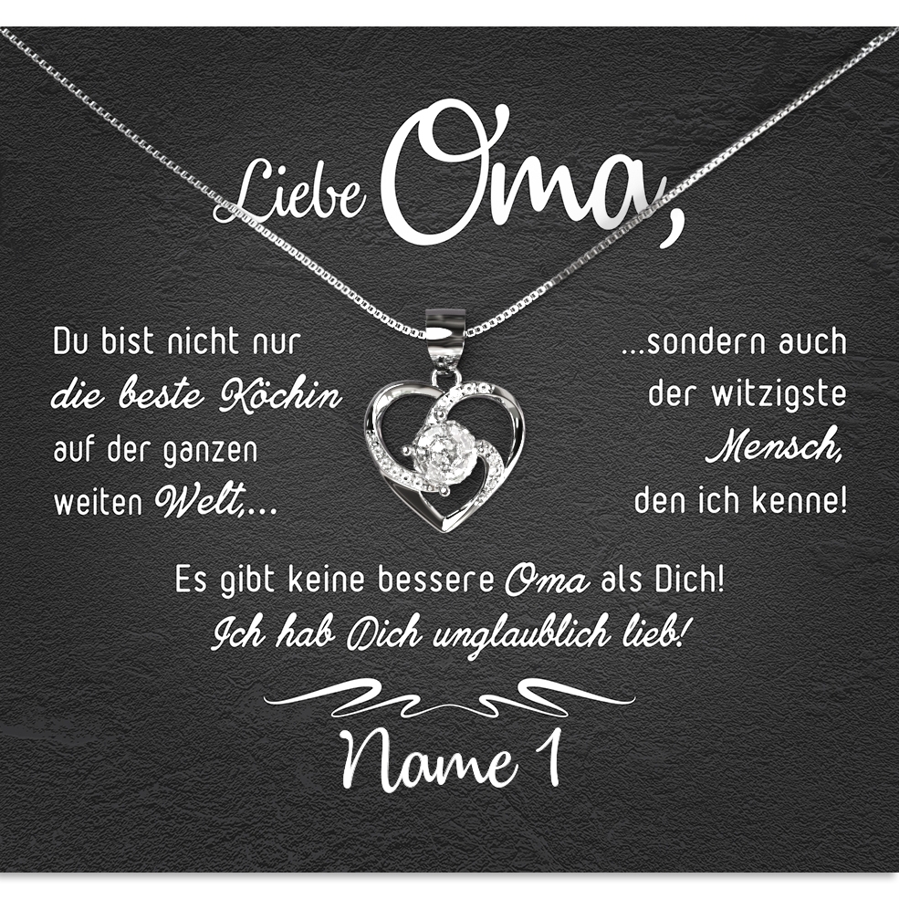 Das einzige, was Du tun musst, ist eine funkelnde Halskette auszusuchen, welche Omas Geschmack entspricht und Deinen Namen in das Textfeld einzutragen. Wir kümmern uns um den Rest und verpacken Dein Geschenk inklusive einer Geschenktasche und Schleife. Innerhalb weniger Tage erhältst Du ein Paket, welches direkt verschenkt werden kann. So kannst Du Deiner Oma eine große Freude bereiten und Ihr den Tag versüßen.