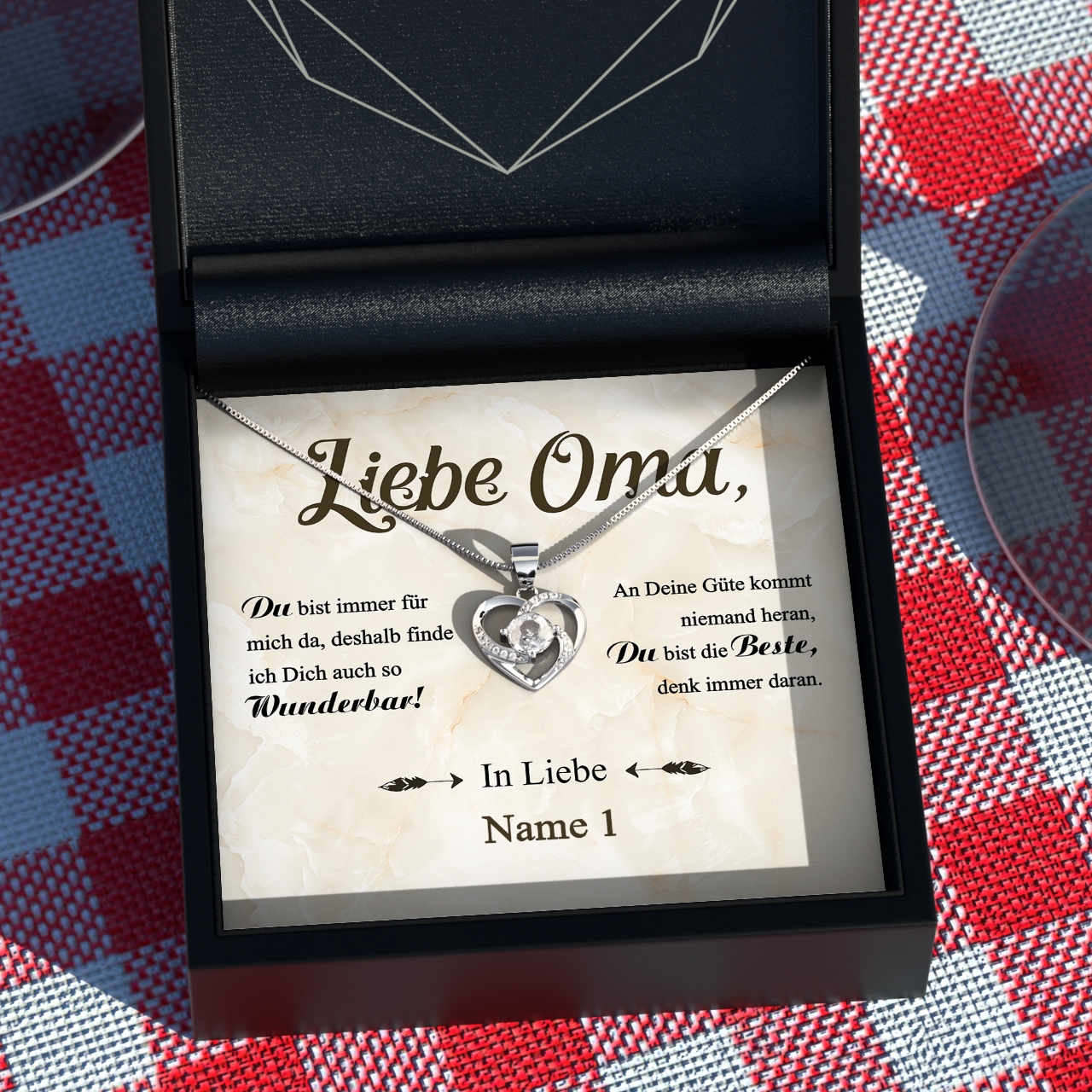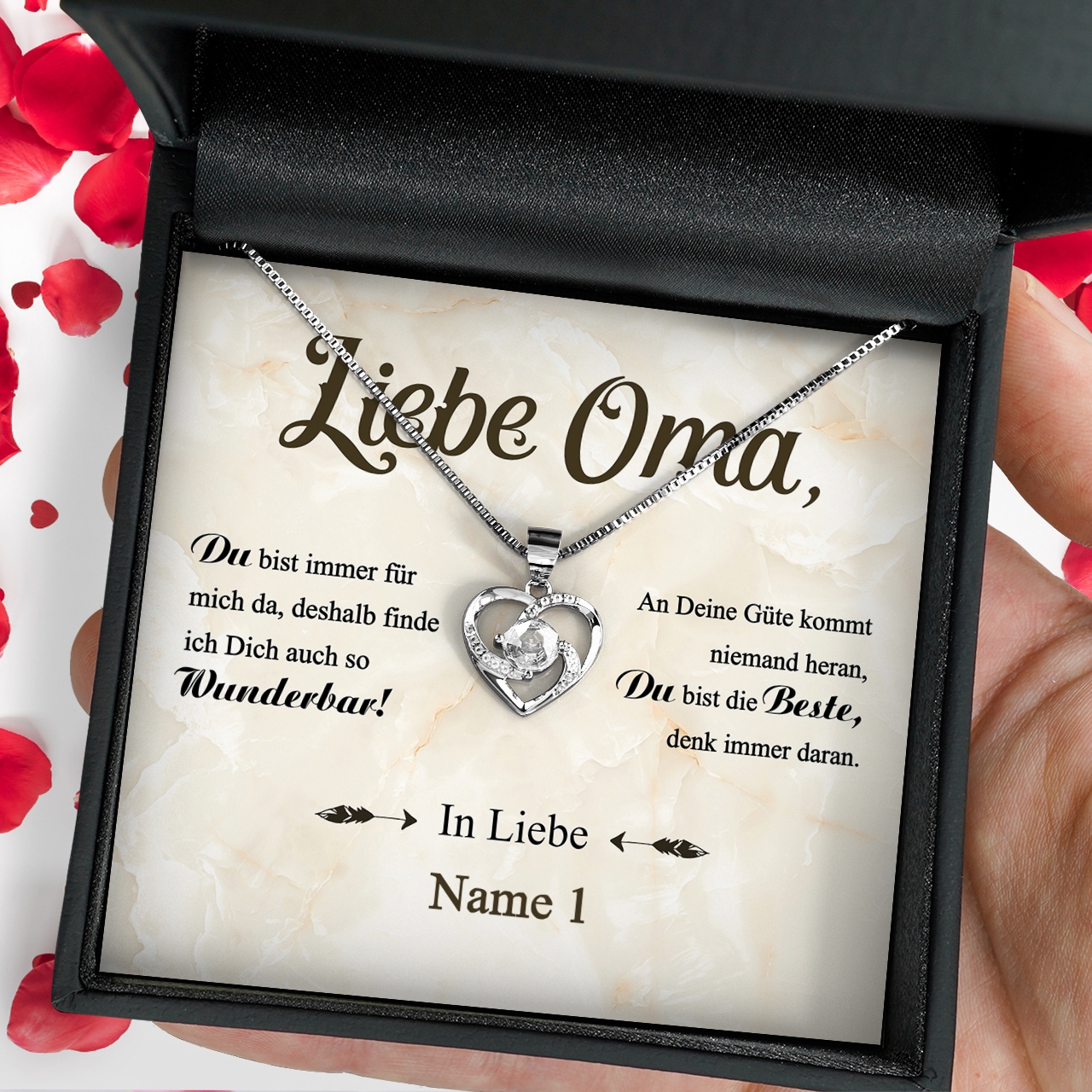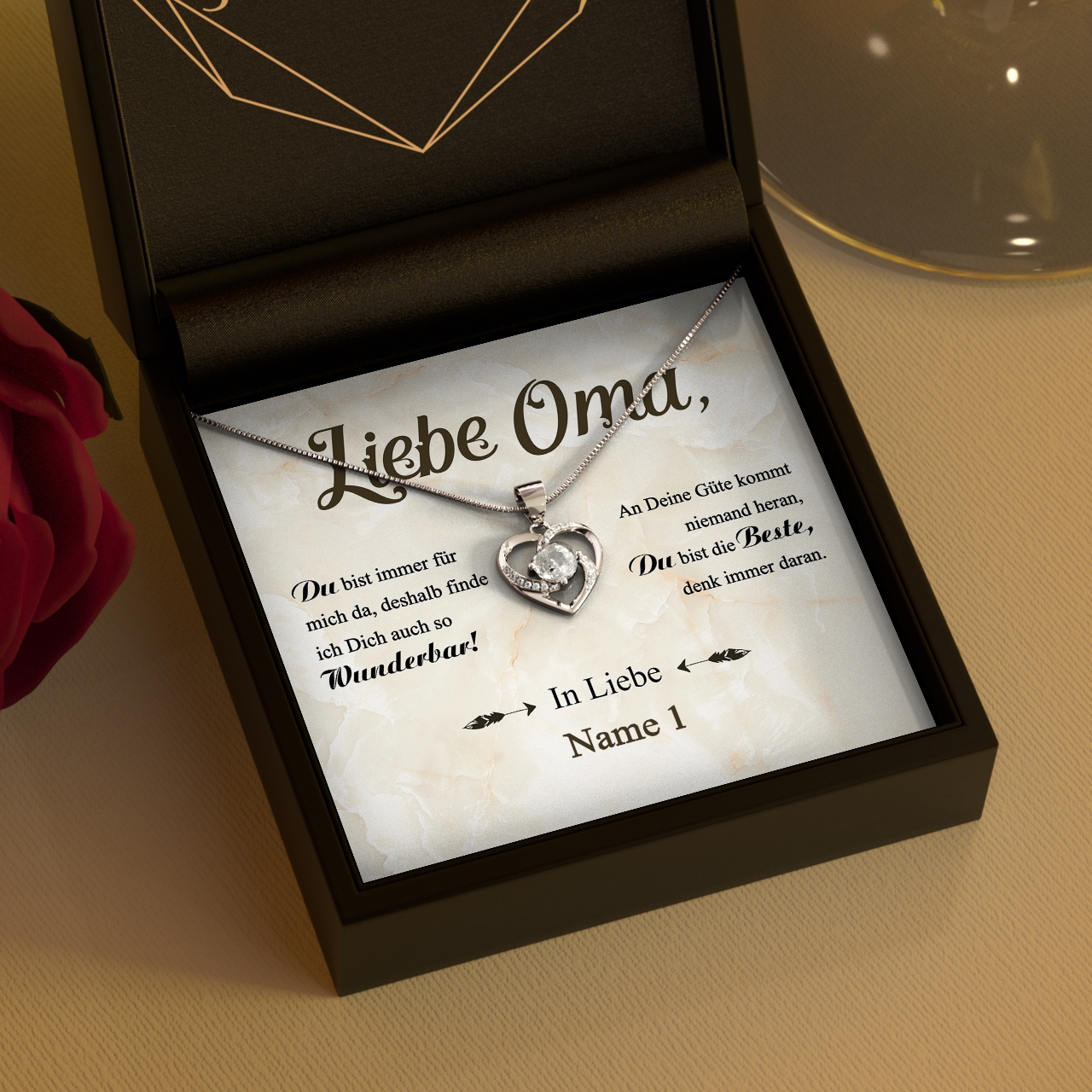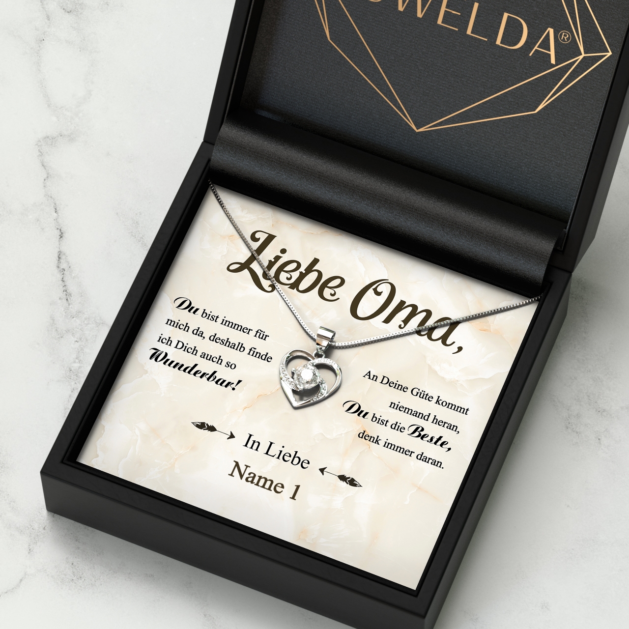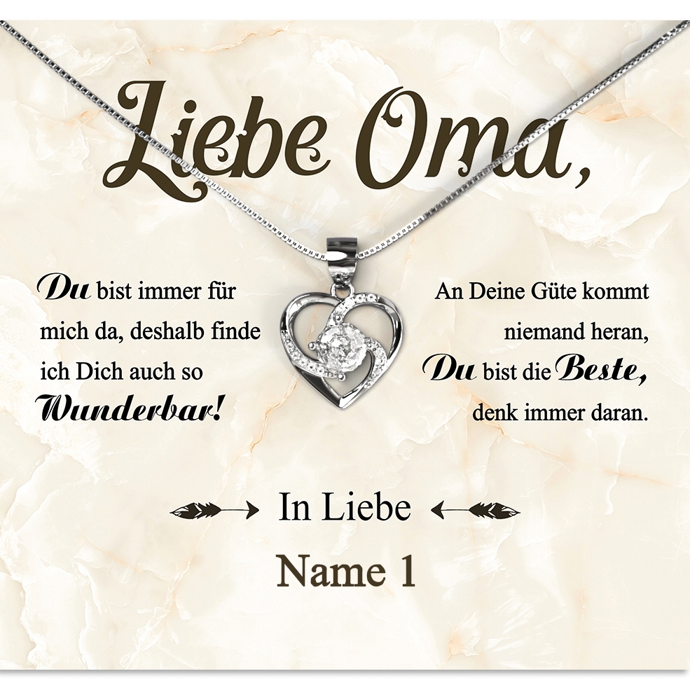 Die personalisierbare Karte „Wunderbare Oma“ wird mit Deinem Namen personalisiert und enthält einen schönen Spruch, mit dem Du Deiner Oma eine sehr persönliche Botschaft überbringen kannst. Zusammen mit der Karte liefern wir Dir eine funkelnde Halskette aus 925 Sterling Silber in einer hochwertigen Schmuckbox und eine Geschenktasche. Damit wirst Du Deine Oma ganz bestimmt zu Tränen rühren und ihr die Anerkennung entgegenbringen, die sie sich verdient hat.