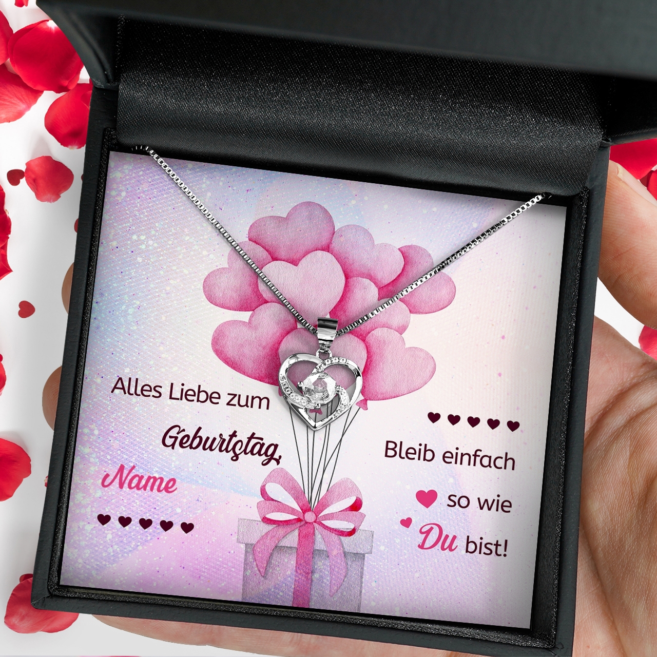 Zu einer guten Geburtstagsparty gehören Ballons. Mit unserer personalisierbaren Grußkarte „Herzballons“ kannst Du sie überreichen und sie bleiben auf ewig in Erinnerung. Denn die Karte begleitet ein wunderbares Schmuckstück, das Du speziell für das Geburtstagskind ausgewählt hast. Das Design zeigt ein Geburtstagsgeschenk, welches mit fliegenden Ballons dekoriert ist. Die lieben Geburtstagsgrüße sind mit dem Namen Deiner Tochter und ihrem Alter personalisiert.