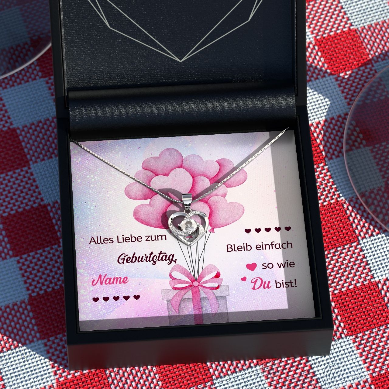 Möchtest Du Dein Geschenk sofort an Deinen Lieblingsmenschen überreichen? Dann solltest Du ein Blick auf die Variante mit der premium Geschenkverpackung werfen. Die Halskette Deiner Wahl und Deine personalisierte Karte werden liebevoll in eine hochwertige Schmuckbox mit Kunstlederüberzug und Samt-Innenbezug gelegt. Damit die Überraschung auch wirklich gut ankommt, wird alles behutsam in eine Geschenktasche gelegt, in Seidenpapier verpackt und mit einer Schleife zugebunden. Hier bekommst Du bereits einen kleinen Vorgeschmack: